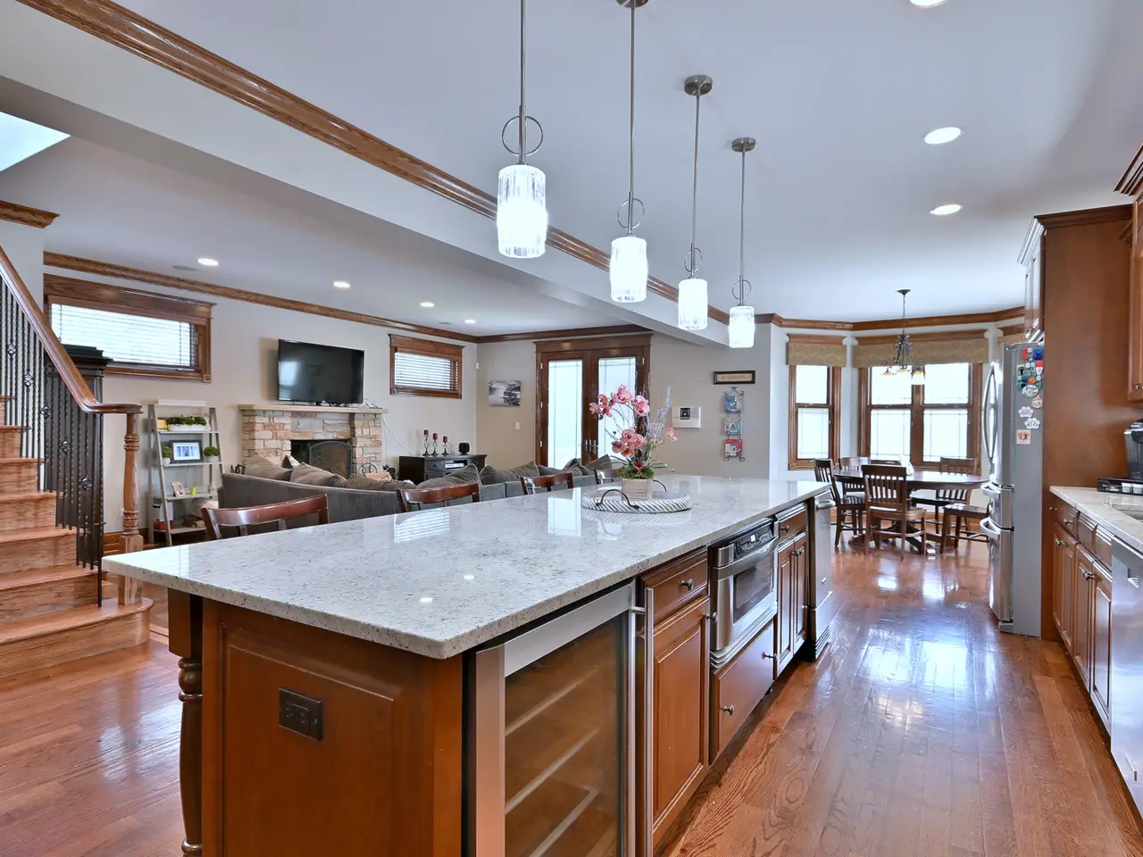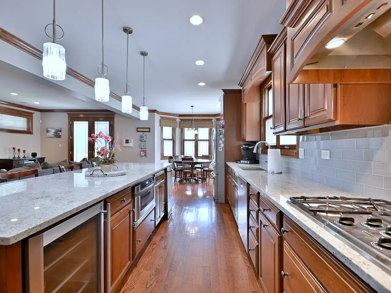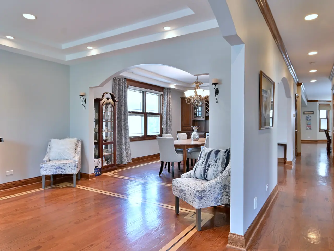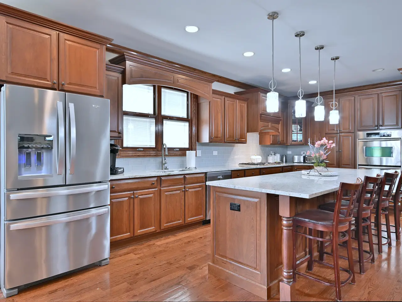 Stunning Norwood Park custom built home boasts almost 4000 square feet above grade. Large living, formal dining room with custom built in Amish hutch. Huge Chef's kitchen has custom Amish cabinets, new refrigerator, 10 foot Island, adjacent eating area and 25 x 20 family room with wood-burning fireplace. Rare front and rear interior oversized oak staircases, bonus three car brick garage with full staircase to second floor loft that makes for amazing storage. Custom hand crafted cove moulding throughout home! First floor office/bedroom with french doors, first floor powder room. Second floor has four amazing bedrooms, including a 20 x 18 primary, with huge primary bedroom bath, steam shower and jacuzzi, ( other bathrooms are ""en-suite"", and ""Jack and Jill'). Large walk-in laundry room. Finished basement has 10 foot ceilings, wet bar with seating for 10, and wine refrigerator. Large Rec room area has wood-burning fireplace, and an 18 x 18 ""pool-table"" room, full bathroom and 6th bedroom/ ""Nanny suite"" or work-out room. Basement has second laundry room, and exterior access to yard. Additional amenities include a central vacuum system, a brand-new first-floor HVAC system heat and air-installed August 2024), a 200 AMP electrical panel, and an in-ground sprinkler system. Bonus three car brick garage with full staircase to second floor loft that makes for amazing storage. This extraordinary home is a short walk to the Norwood Metra, and offers the perfect blend of timeless craftsmanship, modern comfort, and thoughtful design.