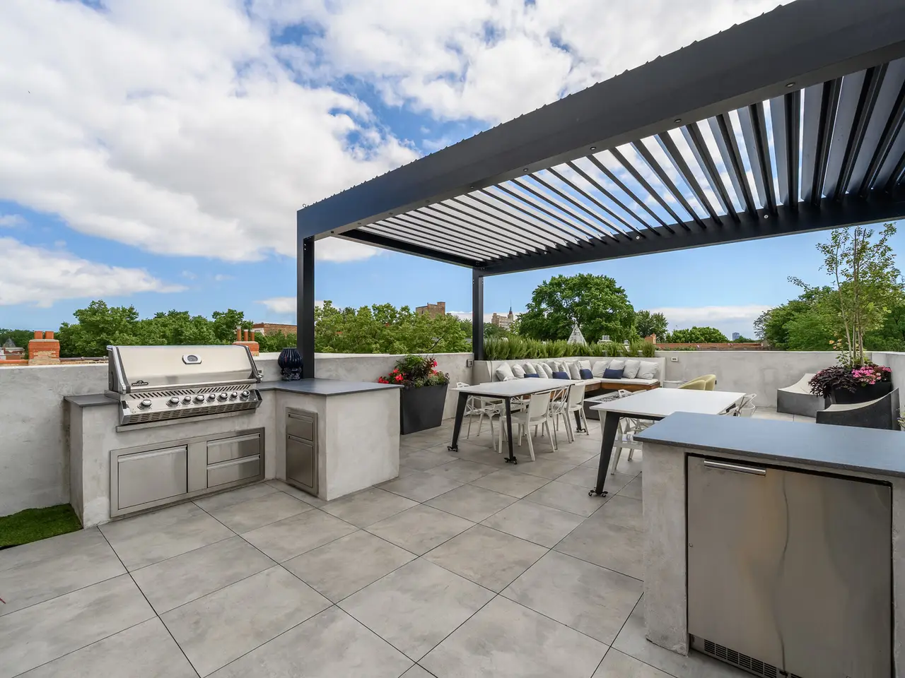 Step into refined living in this stunning Wicker Park duplex-up penthouse, set on an oversized lot on a quiet, tree-lined street. Designed for seamless indoor/outdoor living, this showstopping home features soaring 10' ceilings and 8' doors, polished concrete heated floors, in-ceiling Sonos surround sound, and an impressive wall of sliding glass doors that flood the space with natural light. The chef's kitchen is a dream, featuring a walnut live-edge island, Dekton countertops, an Artemide kitchen light fixture, Miele and Fisher & Paykel appliances, and abundant storage - all flowing effortlessly into the open living and dining areas, which open directly onto a spacious private deck -perfect for morning coffee or unwinding in the evening. The main level also includes a serene primary suite with a spa-inspired bath featuring a walk-in shower and soaking tub, along with a large walk-in closet. The home also includes a high-end steam humidifier system - an upgraded addition that enhances air quality and comfort year-round. Upstairs, you'll find three additional bedrooms with generous closet space and large windows, as well as a second family room with a custom built-in wet bar that spans the entire wall and serves as a true statement piece. Step outside to one of the home's most impressive features: a sprawling private rooftop oasis, built for entertaining. This outdoor retreat includes an electric pergola, built-in gas grill, two outdoor refrigerators, Paloform outdoor fireplace, Roca tiles, perimeter lighting, and an outdoor dog run (on both levels) - making it feel like your own private lounge in the heart of the city. The location offers easy access to Milwaukee, North Ave, Division, and is within walking distance to Wicker Park. You're also just steps from renowned restaurants, coffee shops, bakeries, the 606 Trail, CTA transit, and more. One garage parking space included-this is a rare opportunity to own a one-of-a-kind home designed for both comfort and style.