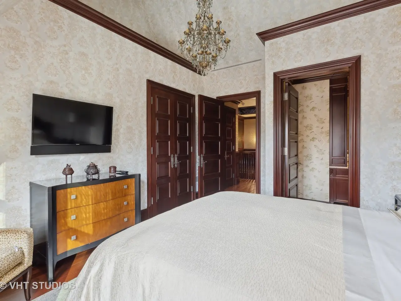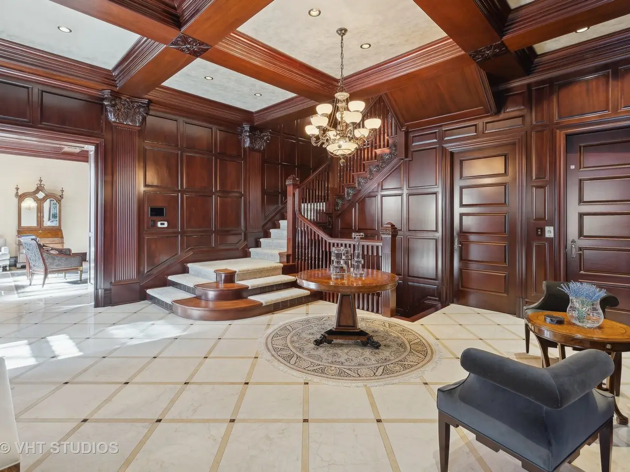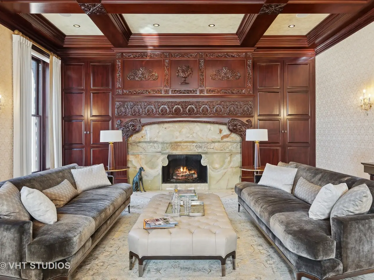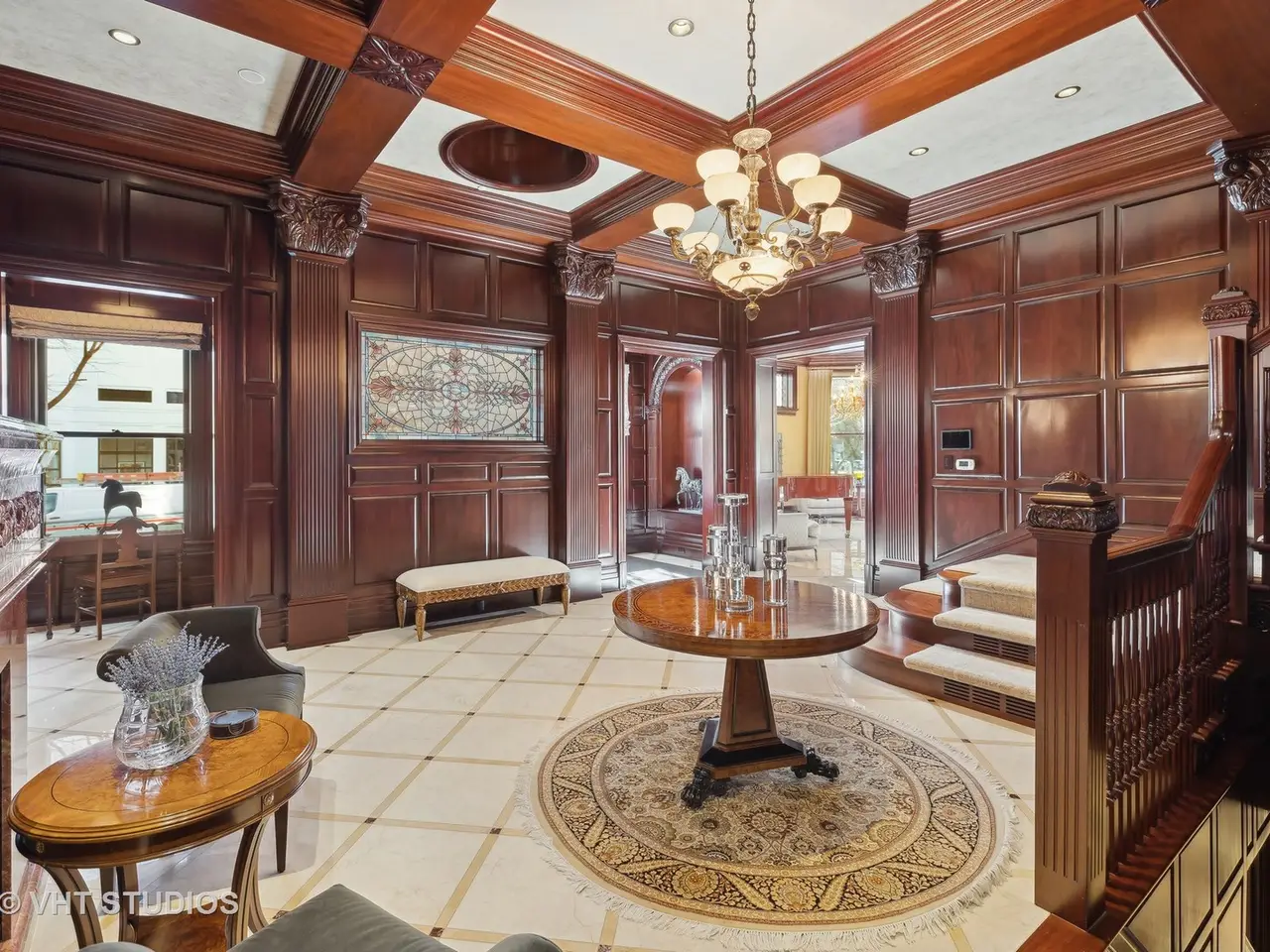 A rare piece of Chicago's history, the Thompson House at 915 N. Dearborn stands as one of the Gold Coast's original architectural treasures. Designed in 1888 by Cobb & Frost, the renowned architects behind the Newberry Library and University of Chicago, this grand residence was among the first to define the Gold Coast neighborhood after the Great Chicago Fire. For the next century, it was owned and used by the Scottish Rite. The property was meticulously restored by its current owner beginning in 2009, blending 19th-century grandeur with modern luxury. The Thompson House is now a nationally registered Historic Landmark. This masterpiece preserves its rich past while offering a remarkably livable floor plan where history, elegance, and everyday comfort coexist effortlessly. Constructed from solid red rock, this 5-bedroom, 4.2-bathroom home spans 13,400 square feet, with an additional 1-bedroom, 1-bathroom carriage house above the 3-car garage. This home showcases exceptional craftsmanship with one-of-a-kind finishes and details throughout. Some of the elements include a refurbished original mosaic floor, custom millwork, hand-carved marble fireplaces from Italy, and custom stained glass. Throughout the home, all wood features, including beams, doors, and trim, are custom made from solid Honduras Mahogany, with intricate touches such as paneling and carving. The staircase, also Honduras Mahogany, was hand crafted to mimic the home's original balusters. Modern features include an elevator servicing all levels, a Control4 system, integrated audio and speaker systems, smart HVAC controls, and full smart home capabilities, making this home as functional as it is beautiful. Enter the home to a large parlor paneled in mahogany. The details greet you right away - hand carved columns, custom stained glass windows and doors, marble floors imported from Turkey, and a hand carved marble fireplace. The adjacent great room is full of natural light from the large, curved windows and south and west exposures. The great room has earned its name sake with a Swarovski crystal chandelier, a hand-carved, book-matched onyx fireplace from Pakistan, and exquisite mahogany woodwork with in-wall cabinetry. Silk wall coverings and marble flooring add to the grandeur. On the opposite side of the foyer you will find the kitchen overlooking the walled courtyard with fountains and fireplace. The kitchen area features two dining areas, high-end appliances, a large island, custom cabinetry, and a laundry room tucked away. The second level landing showcases a stunning library framed by an intricate hand carved arch. You will also see the custom stained glass dome skylight up above. The second floor features the luxurious primary suite, complete with a wet bar, and en-suite bath, and a second bedroom or office with an en-suite bath. You will also find a screened in 3-season porch. On the top floor, there is a sitting room, three additional bedrooms, including two rooms sharing a Jack-and-Jill bathroom, and a third large bedroom with its own en-suite bath. The lower level is designed for relaxation and entertainment, featuring two seating areas, a bar, and a spa. The media area includes a hand-carved Italian Botticino marble fireplace and marble floors with bronze inlay. The galley bar offers an in-wall wine display, and the spa features a sauna, jacuzzi, steam suite, spa dressing rooms, a massage and zen room, and an additional laundry area. A Murano glass mural with an integrated waterfall and glass-blown ceilings add unique artistic elements rarely found in modern homes. Across the courtyard, you will find the cozy coach house, perfect for guests or additional living space. The home includes a heated 3-car garage. The Thompson House is more than just a home; it's a timeless work of art that embodies elegance, craftsmanship, and luxury living in the heart of Chicago.