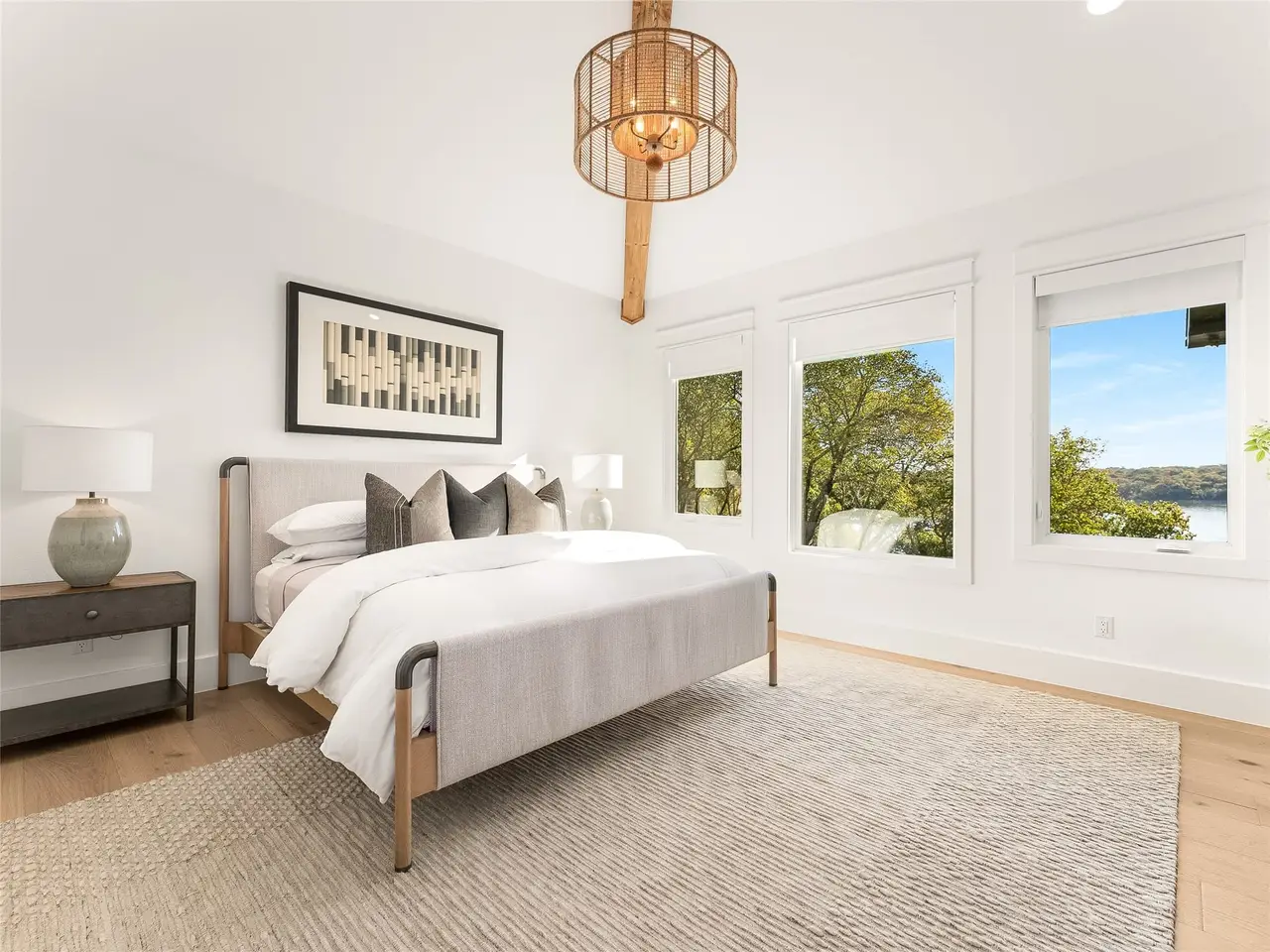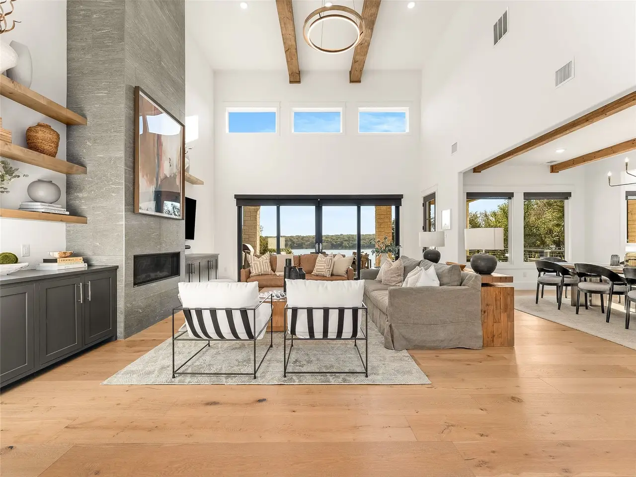 Discover exceptional waterfront living at 144 Moonlight Bay Drive in prestigious Lake Bridgeport. This custom-built 2021 home was thoughtfully designed with one goal: capturing stunning lake views from every bedroom. With designer touches throughout and no detail overlooked, this turnkey residence is being sold fully furnished and offers the perfect blend of luxury and lakeside leisure. Step inside to soaring 10-foot ceilings on the main level, including a dramatic 19-foot family room. Beautiful 10-inch French oak wood floors flow throughout, while custom wood ceiling beams add warmth to the primary suite, family room, and dining areas. The vaulted primary ceiling creates a peaceful retreat with panoramic water views. The gourmet kitchen features top-tier GE Monogram appliances, including a gas cooktop and built-in wine fridge on the oversized island. A farmhouse sink, Bosch 36 inch French door refrigerator, and smart layout make entertaining seamless. The adjacent wet bar, equipped with a beverage cooler and ice maker, keeps guests well-served. The outdoor living spaces are truly remarkable. An expansive 544-square-foot covered rear porch features tile flooring, surround sound, and a drop-down TVyour new favorite spot for game days and gatherings. The lakefront experience continues with a massive 2-story, 30x30 steel boat dock complete with Hydro Hoist boat lift, two jet ski ports, and a covered upper deck ideal for sunset watching. A gas-starter fire pit with Adirondack chairs provides the perfect setting for evening relaxation. The oversized garage offers drive-through access directly to the boat dock. Peace of mind comes standard with spray foam insulation throughout and a brand-new Generac 26kW whole house generator (installed December 2024). This is more than a homeit's a lifestyle. Whether launching your boat for a day on the water, entertaining on the dock, or enjoying morning coffee with a lake view, 144 Moonlight Bay Drive delivers the lakefront dream.