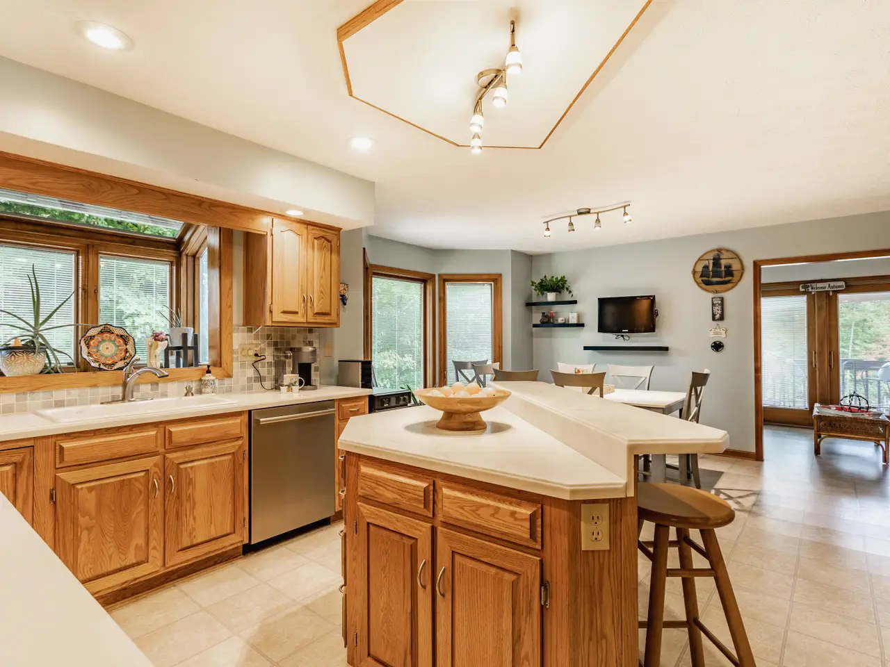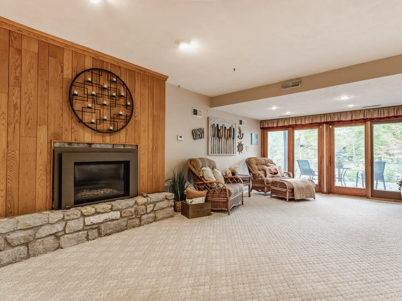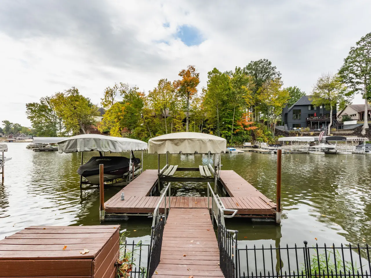 Welcome home to lake life at its best- where comfort meets tranquility on the water! Nestled on a quiet cul-de-sac, this beautiful lakefront home offers spacious living and stunning views. The main level features a two-story great room with vaulted ceilings, new carpet, a two-story stone gas fireplace, and access outside to a multi-level deck-perfect for relaxing or entertaining by the water. The kitchen showcases stainless steel appliances, marble countertops, and a charming garden window, flowing seamlessly into the eat-in area and sunroom, where you can enjoy lake views. Two bedrooms are conveniently located on the main level. Upstairs, a cozy loft overlooks the great room-an ideal reading nook or quiet retreat. The primary suite features another cozy fireplace, its own sunroom with automatic skylights, blinds, and screens-perfect for enjoying your morning coffee with a peaceful lake view. Primary also includes an on-suite bathroom with an oversized marble tub and shower with dual showerheads. The cedar-lined closet includes a hidden door for extra storage. The walk-out basement opens to a beautiful deck designed for entertaining, complete with a hot tub and relaxing lake views. Inside, you'll find a wet bar, gas fireplace, flex room, and generous storage areas-perfect for both gatherings and quiet evenings in. Step outside to enjoy your private boat dock with canopy and one lift, ideal for effortless lakeside living. Recent updates include a new roof and new AC unit, both completed in 2023.