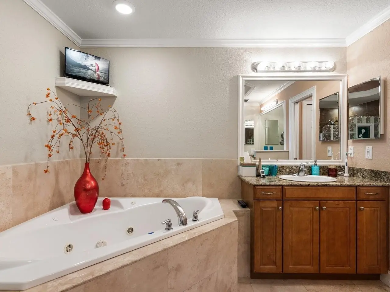 • Spa-style bath with glass tile shower