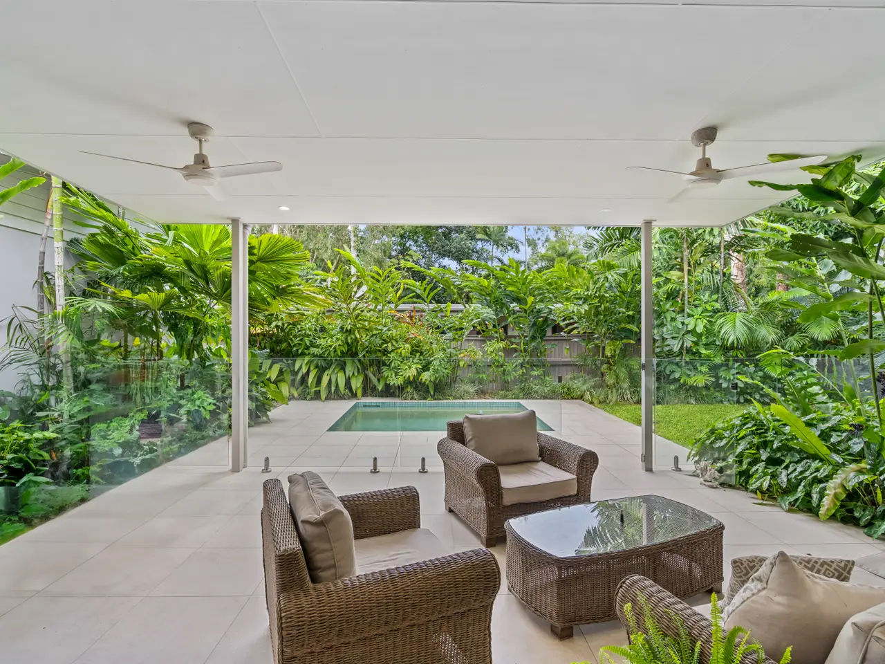 Positioned in an enviable setting with a beautiful bushland aspect, this immaculate home on a 700m2 block is easy walking distance from the beach. Presenting as new, the single-level layout invites relaxed tropical living, taking full advantage of the lush private outlook. The contemporary interiors feature a private master suite, and open plan living spaces that flow out to a patio overlooking the pool and established gardens. Nestled among other premium houses in a tightly held street, the location puts you 300m from the tranquil local beach and 10 minutes' walk along the sand or pathway to the restaurants and cafes of Palm Cove. - Breezy open-plan living spaces with lovely garden outlook - Tranquil rear patio overlooking pool and private bushland aspect - Well-appointed modern kitchen with breakfast bar and walk-in pantry - Large, separated master suite with WIR, ensuite and lush outlook - Considered bedroom wings for maximum privacy and liveability - Stylish decor, immaculately presented throughout, as new - Solar power, secure lock-up garage with additional storage - No body corporate, tightly held street of premium homes - 700m2 block with beautiful established tropical gardens - 300m to beach via pathway, 10-minute walk to Palm Cove via path or sand