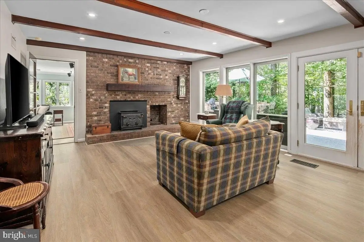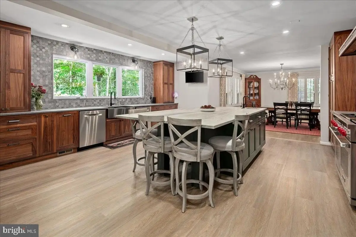 Welcome to this beautifully updated home that seamlessly blends modern design with timeless charm. Featuring a stunning open-concept kitchen, cozy living areas, and abundant natural light, this home offers both comfort and sophistication in every detail. Step into the heart of the home - an incredible gourmet kitchen designed to impress visually and functionally. Updated and expanded in 2023, the kitchen features a stunning Maldives leathered quartzite island (with no seams) with a built-in prep sink and bar seating that anchors the space. It is complemented by rich walnut cabinetry with integrated interior electrical outlets, and sleek Rugged Concrete Caesarstone quartz counters. Top-of-the-line appliances include a Wolf 6-burner gas stove with a custom hood, two dishwashers, and a cabinet-depth refrigerator and freezer. An eye-catching tile backsplash and oversized windows flood the space with light. Adjacent to the kitchen is a spacious family room with exposed wood ceiling beams and a classic brick fireplace, a perfect blend of rustic charm and modern amenities. Glass doors open to a beautiful outdoor patio, enhancing the indoor-outdoor connection. A glorious sunroom offers a relaxed retreat with wraparound windows, ideal for reading, relaxing, or hosting guests. This room is bathed in natural light and offers serene views of the surrounding pastures. The formal dining and living rooms are perfect for hosting gatherings, featuring white oak floors, plantation shutters, & custom draperies. The main level features a bedroom, currently used as an office, that includes a built-in desk. A full bathroom is also conveniently located on this level. Upstairs, the primary bedroom is a serene retreat with a walk-in closet & a beautifully updated en-suite primary bathroom with sleek double vanity, and a large, glass-enclosed walk-in shower with subway tiles. A second washer and dryer are a bonus in the primary suite. The upper level includes four bedrooms, all with hardwood floors, and two full bathrooms, both with double vanities. The finished lower level is an entertainer's dream, offering a versatile space for games and relaxation. A wet bar provides a perfect spot for serving drinks, and a large storage room with utilities offers abundant storage. Step outside to the fantastic outdoor living space, perfect for entertaining and enjoying the serene surroundings. The large patio features an outdoor kitchen, a hot tub, and two tranquil ponds. The property features a 5-stall center aisle horse barn, each with front and back doors leading to its own paddock and a wash stall. There's a separate hay barn, a grass schooling area, and multiple fenced turn-out pastures with elegant 3-board wood fencing. Direct access to incredible ride-out trails makes this a true equestrian's paradise. Beyond the barn, the expansive grounds include a sensational 100 x 50 vegetable garden, a chicken coop, and a tractor shed. A new roof was installed in 2018 and a new hot water heater in 2017. The grand circular driveway was upgraded in 2023 and provides an impressive entrance with an additional parking alcove, leading to a 2-car garage. This home is a perfect showcase of classic character and modern design.