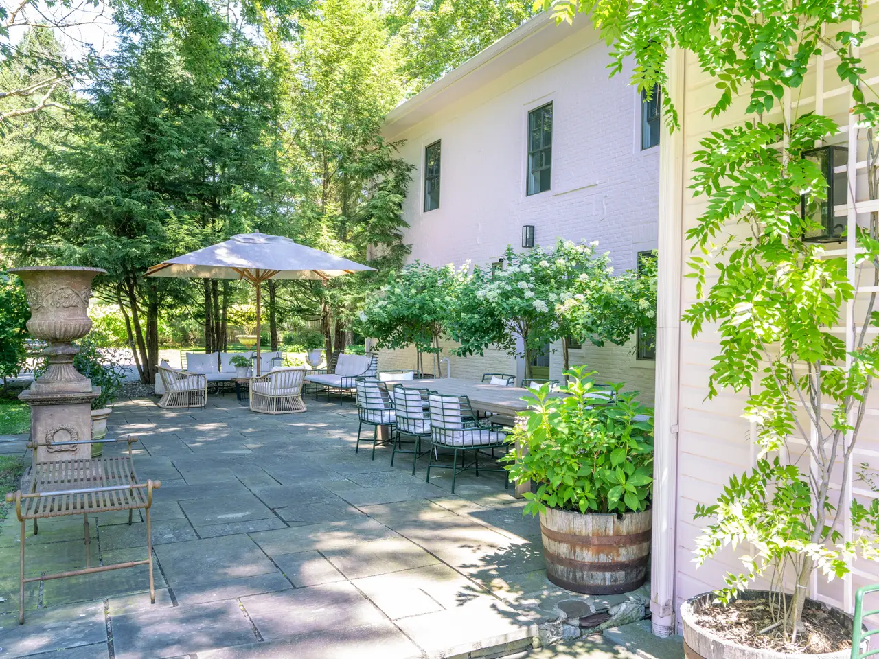 Nestled in the quaint hamlet of Clinton Corners, this rare and tasteful 18th-century Georgian stone house offers classic proportions and timeless charm on beautifully established, landscaped grounds. The home seamlessly blends original architectural details including preserved woodwork, deep sill windows, six fireplaces, refinished floors, and classic Georgian symmetry with modern updates such as central air, new windows, and a dramatic wall of windows overlooking the terrace. A 10-foot-wide hallway runs the length of both floors, with Dutch doors at either end, leading to well-appointed rooms including a formal living room, dining room, TV/family room, and a large kitchen all with fireplaces plus a full bathroom on the main level. The attached cottage adds functionality with a mudroom/laundry area, second kitchen, sunroom, studio space, and an additional bedroom and bathroom on the upper level. In the main house, the second floor features four spacious bedrooms and two full bathrooms. Surrounded by mature trees, high fencing, and rolling countryside, this meticulously maintained property is just 10 minutes from Millbrook, 20 minutes from Rhinebeck, and close to all that the Hudson Valley has to offer making it the perfect full-time residence or idyllic weekend retreat.