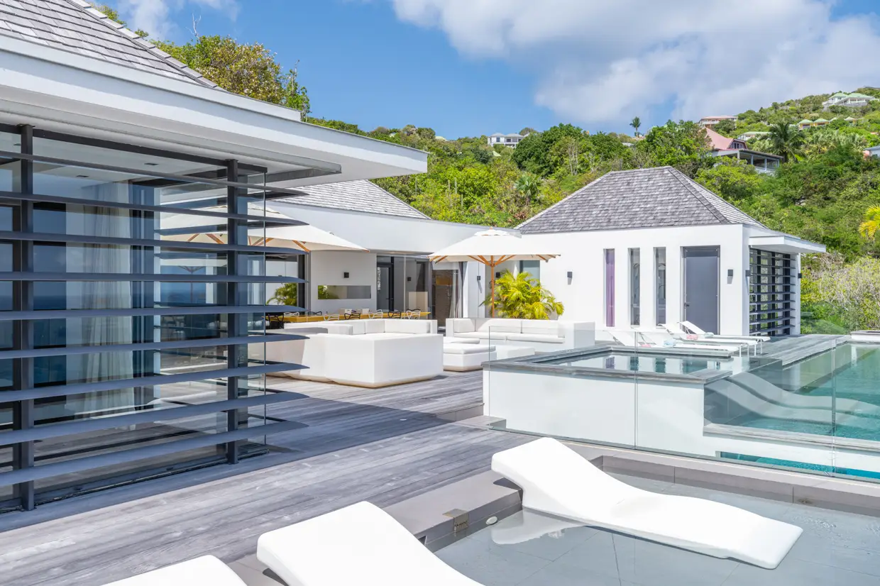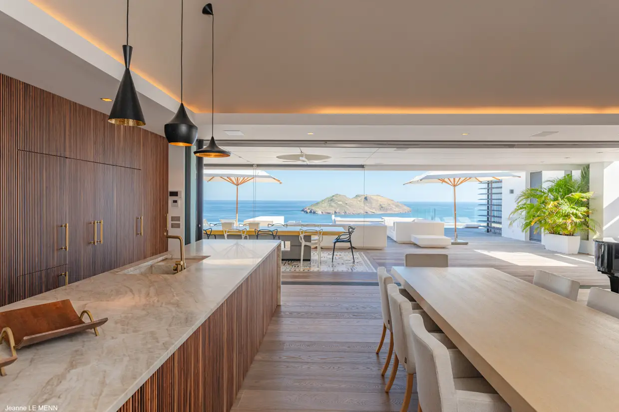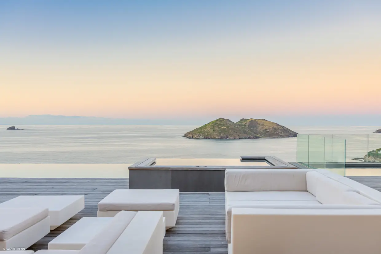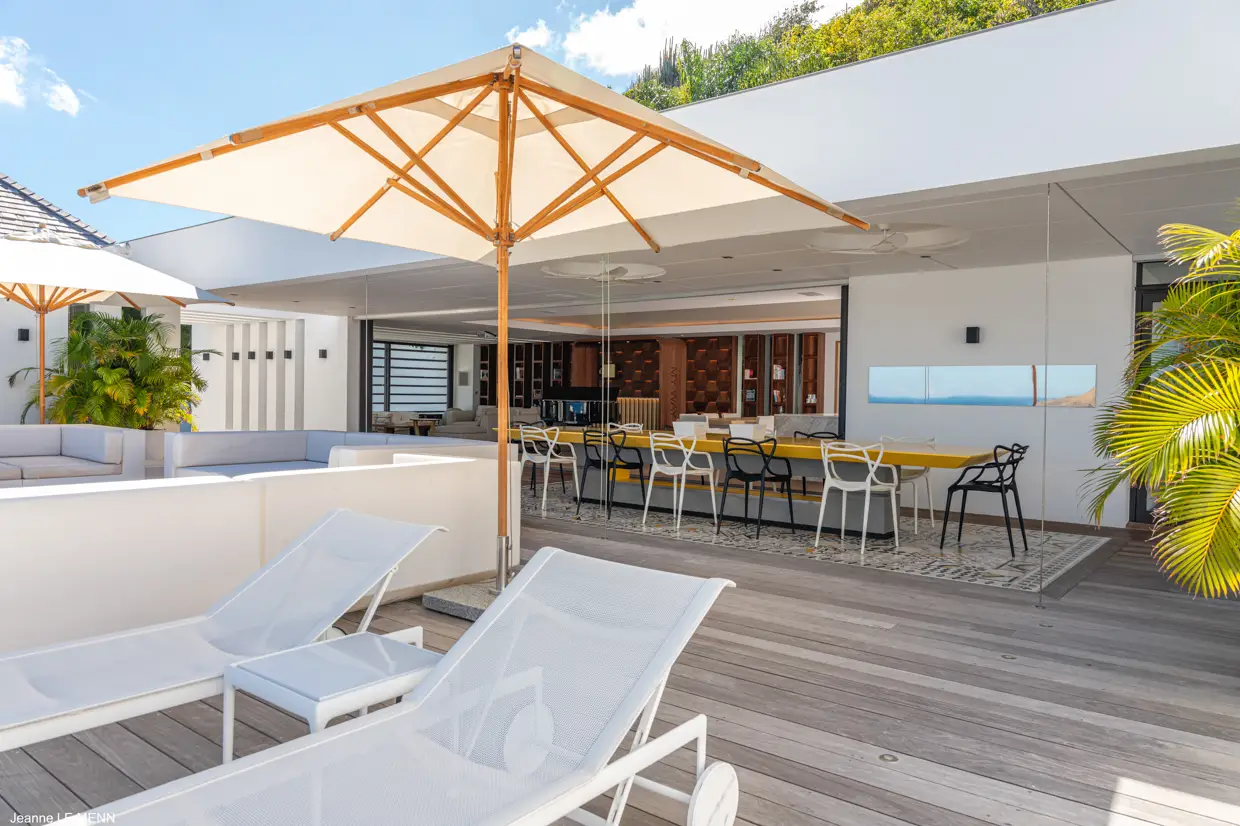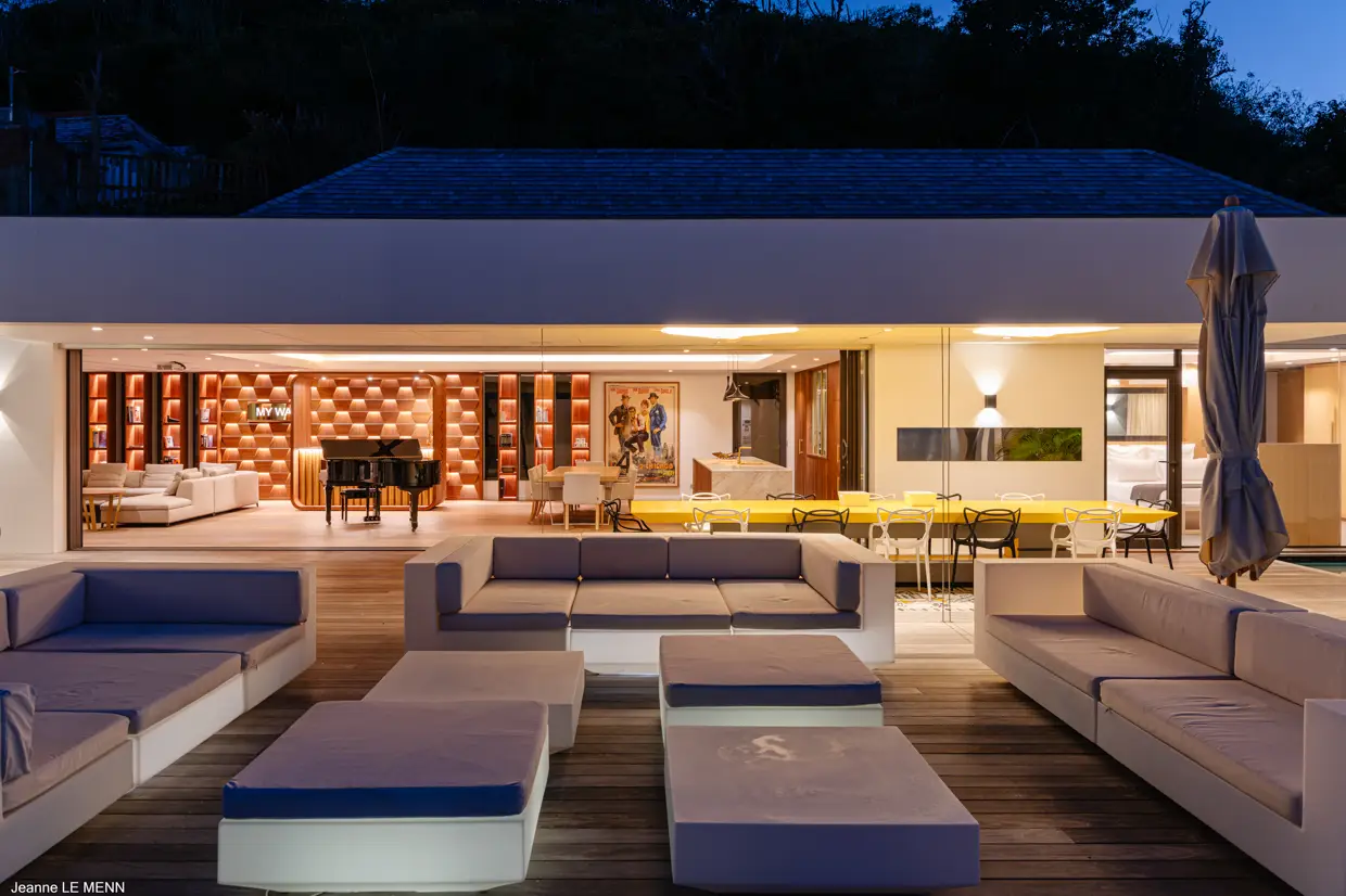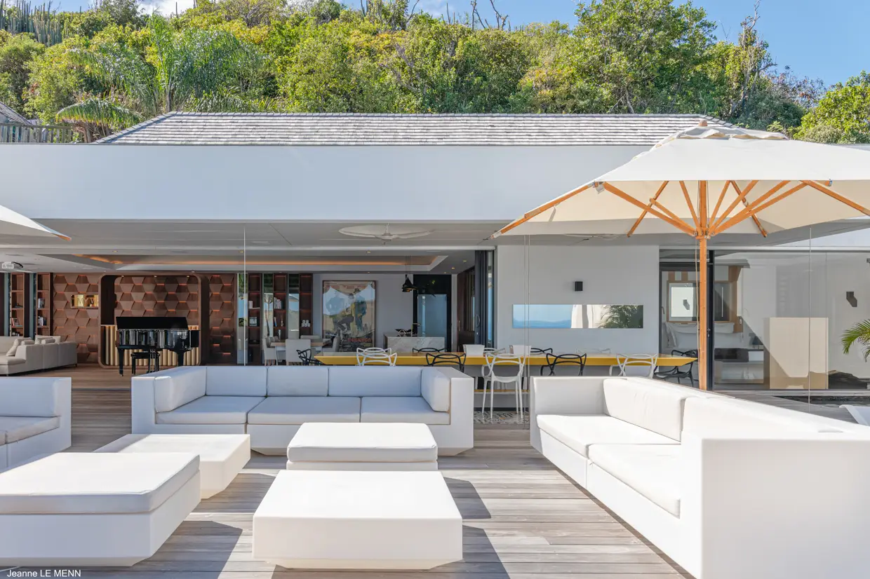Nestled in the idyllic setting of Colombier, Villa “My Way” promises an exclusive living experience, where every detail is carefully designed to enhance the daily life of its occupants. Designed by architect Patrick Raffeneau, this luxurious property features ultra-contemporary architecture, creating spacious, pleasant, and refined interior and exterior spaces. Arranged on two levels, the property guarantees total privacy. As soon as you cross its threshold, you’re greeted by a breathtaking view of Flamands Bay and the ocean with the ilet Bonhomme in the background; a 180-degree panorama that’s sure to captivate your gaze at every turn. The main living space is a veritable haven of peace and style, featuring a vast living room with projection screen, a dining room, a fully equipped kitchen, as well as a professional kitchen behind the main room to accommodate your private chef. Furnished and decorated with high-quality pieces and noble materials, this space exudes elegance. The interior design, dotted with nods to the famous song “My Way” for which the villa is named, creates a unique atmosphere. A magnificent grand piano adds an artistic touch, reinforcing the villa’s sophisticated ambience. The vast terrace features a second dining area under the roof, equipped with a Yellow Lego table to host up to 18 guests. You’ll be delighted by the heated infinity pool, which seems to melt into the horizon, creating an illusion of the pool connecting to the sea. Around it, the terrace invites you to relax, whether in the jacuzzi or sunbathing on one of the deckchairs. The five en-suite bedrooms are spread across the different levels. Four of them boast magnificent sea views, and each has been meticulously furnished, combining modern comfort with elegant touches. Your well-being is not forgotten, with a fitness room equipped with the very best machines. Villa “My Way” is a luxurious retreat where you can recharge your batteries and savor every moment on the island.