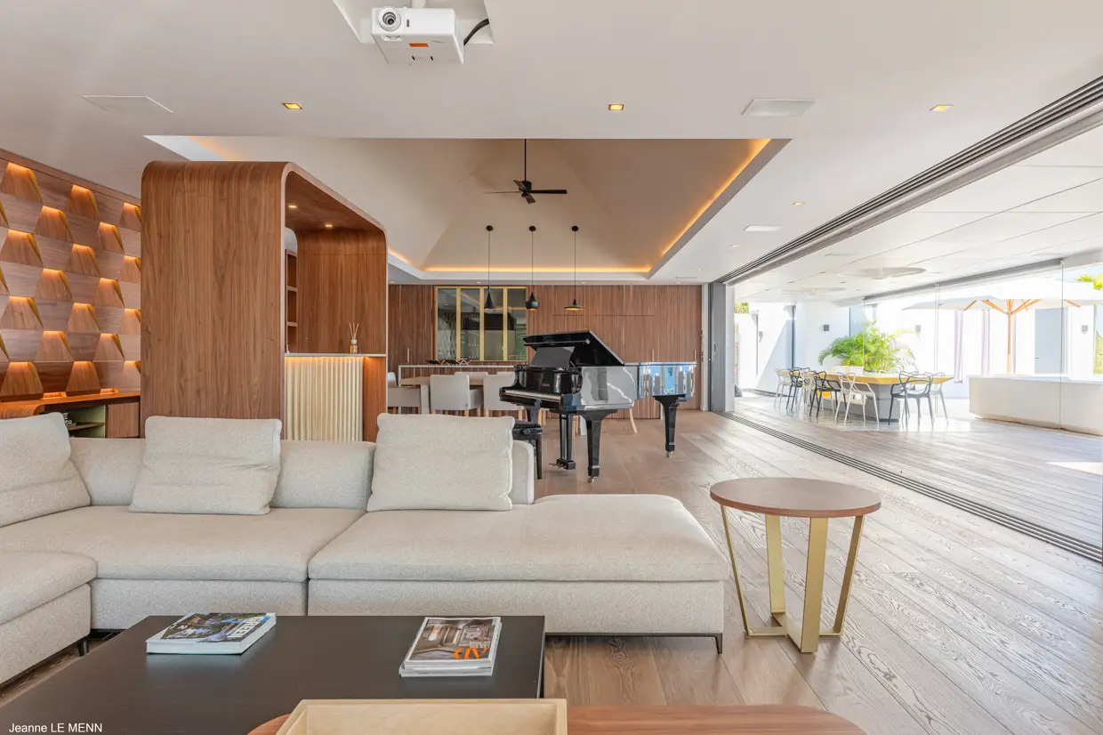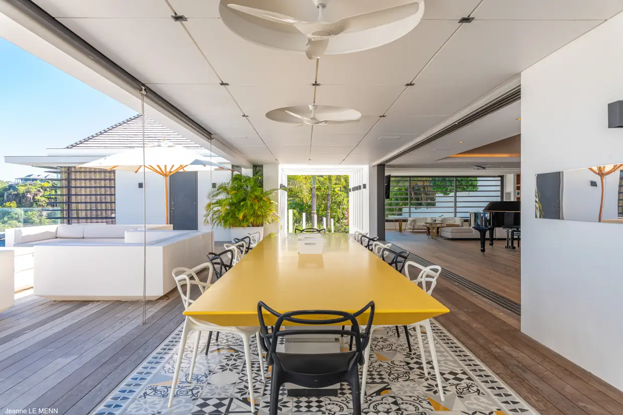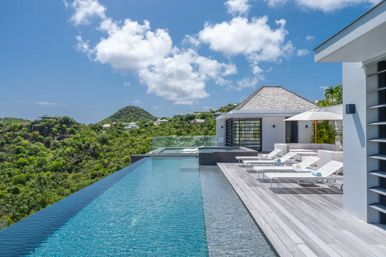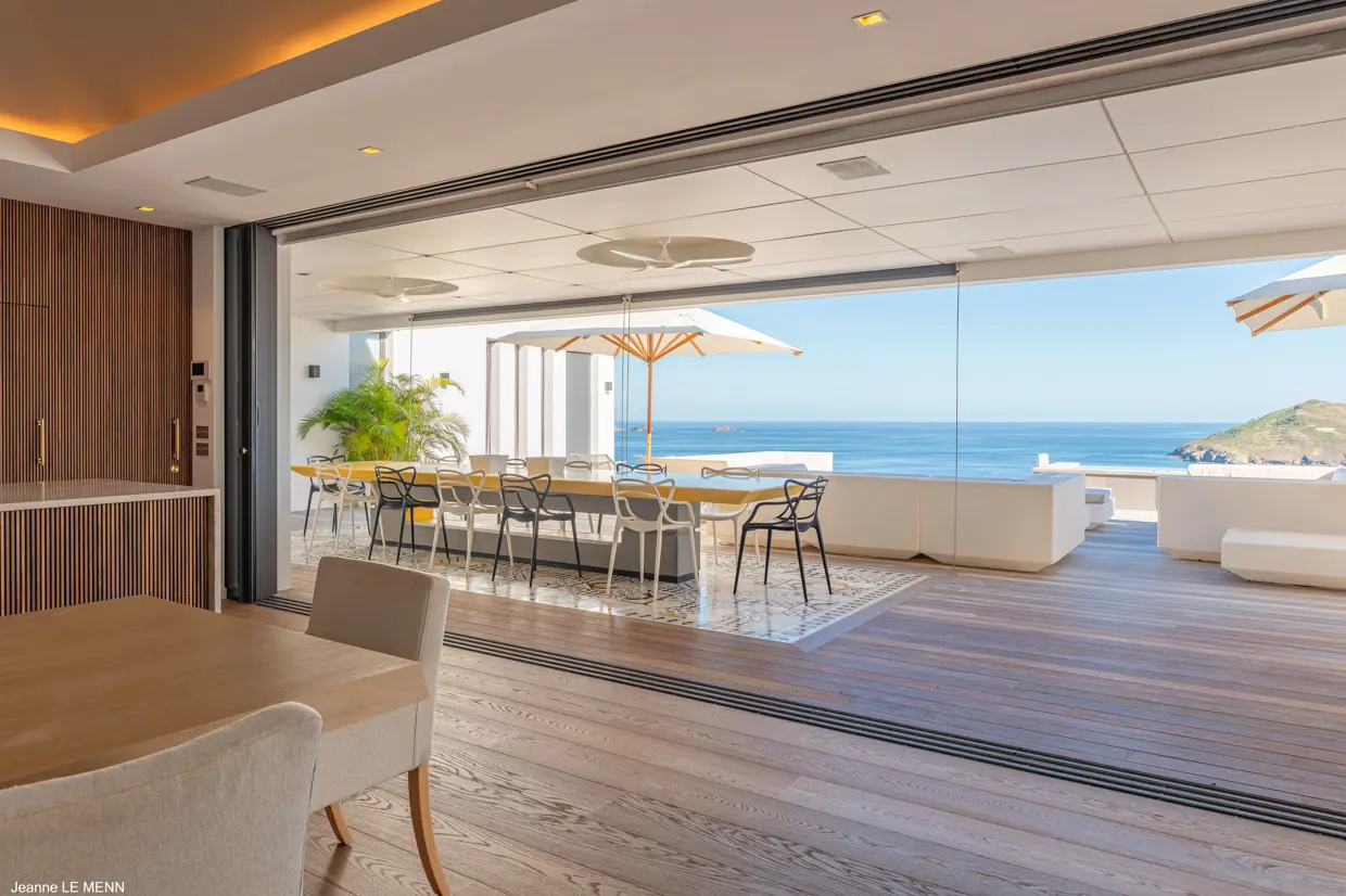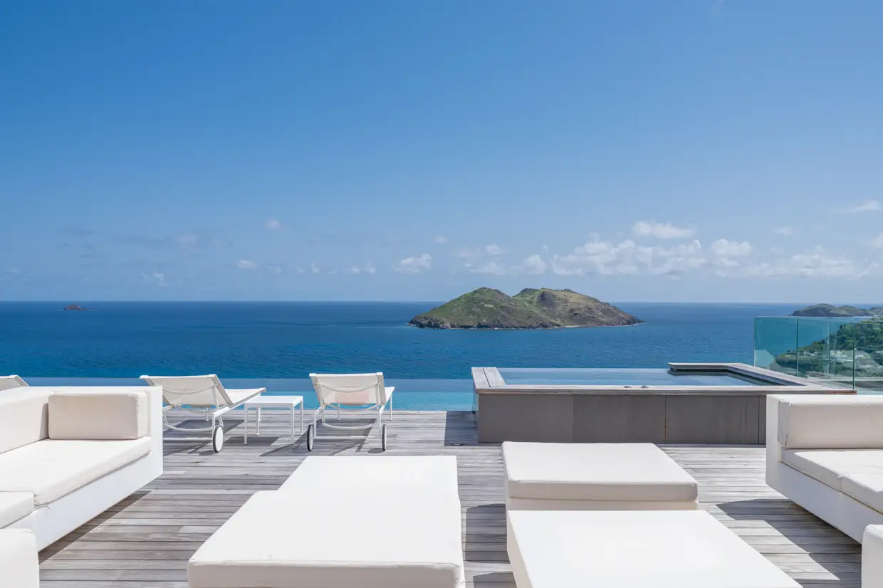 Nestled in the idyllic setting of Colombier, Villa “My Way” promises an exclusive living experience, where every detail is carefully designed to enhance the daily life of its occupants. Designed by architect Patrick Raffeneau, this luxurious property features ultra-contemporary architecture, creating spacious, pleasant, and refined interior and exterior spaces. Arranged on two levels, the property guarantees total privacy. As soon as you cross its threshold, you’re greeted by a breathtaking view of Flamands Bay and the ocean with the ilet Bonhomme in the background; a 180-degree panorama that’s sure to captivate your gaze at every turn. The main living space is a veritable haven of peace and style, featuring a vast living room with projection screen, a dining room, a fully equipped kitchen, as well as a professional kitchen behind the main room to accommodate your private chef. Furnished and decorated with high-quality pieces and noble materials, this space exudes elegance. The interior design, dotted with nods to the famous song “My Way” for which the villa is named, creates a unique atmosphere. A magnificent grand piano adds an artistic touch, reinforcing the villa’s sophisticated ambience. The vast terrace features a second dining area under the roof, equipped with a Yellow Lego table to host up to 18 guests. You’ll be delighted by the heated infinity pool, which seems to melt into the horizon, creating an illusion of the pool connecting to the sea. Around it, the terrace invites you to relax, whether in the jacuzzi or sunbathing on one of the deckchairs. The five en-suite bedrooms are spread across the different levels. Four of them boast magnificent sea views, and each has been meticulously furnished, combining modern comfort with elegant touches. Your well-being is not forgotten, with a fitness room equipped with the very best machines. Villa “My Way” is a luxurious retreat where you can recharge your batteries and savor every moment on the island.