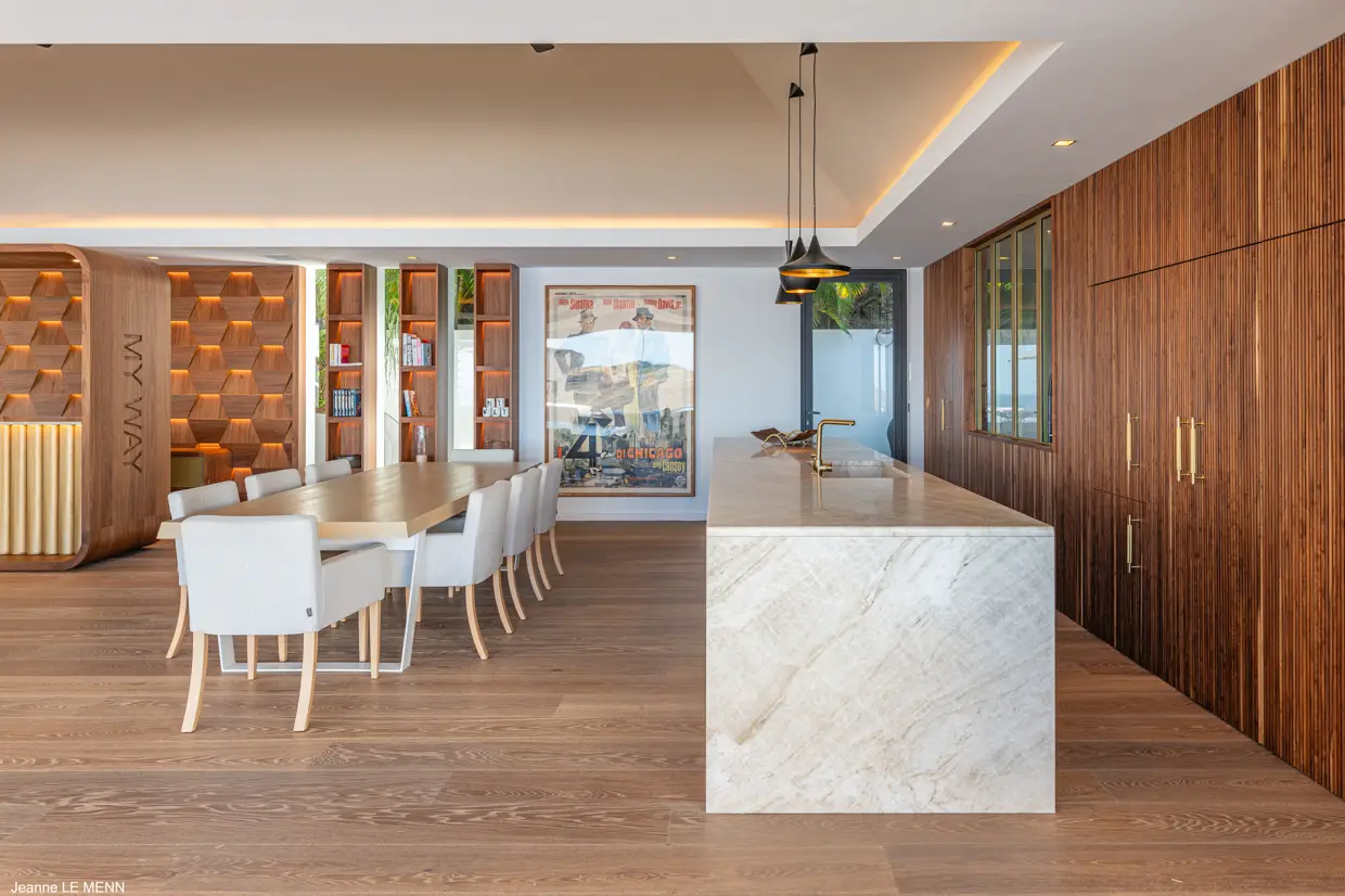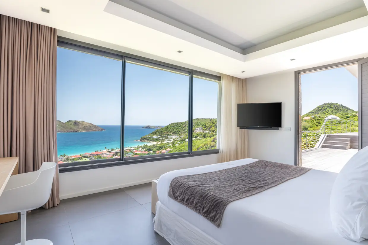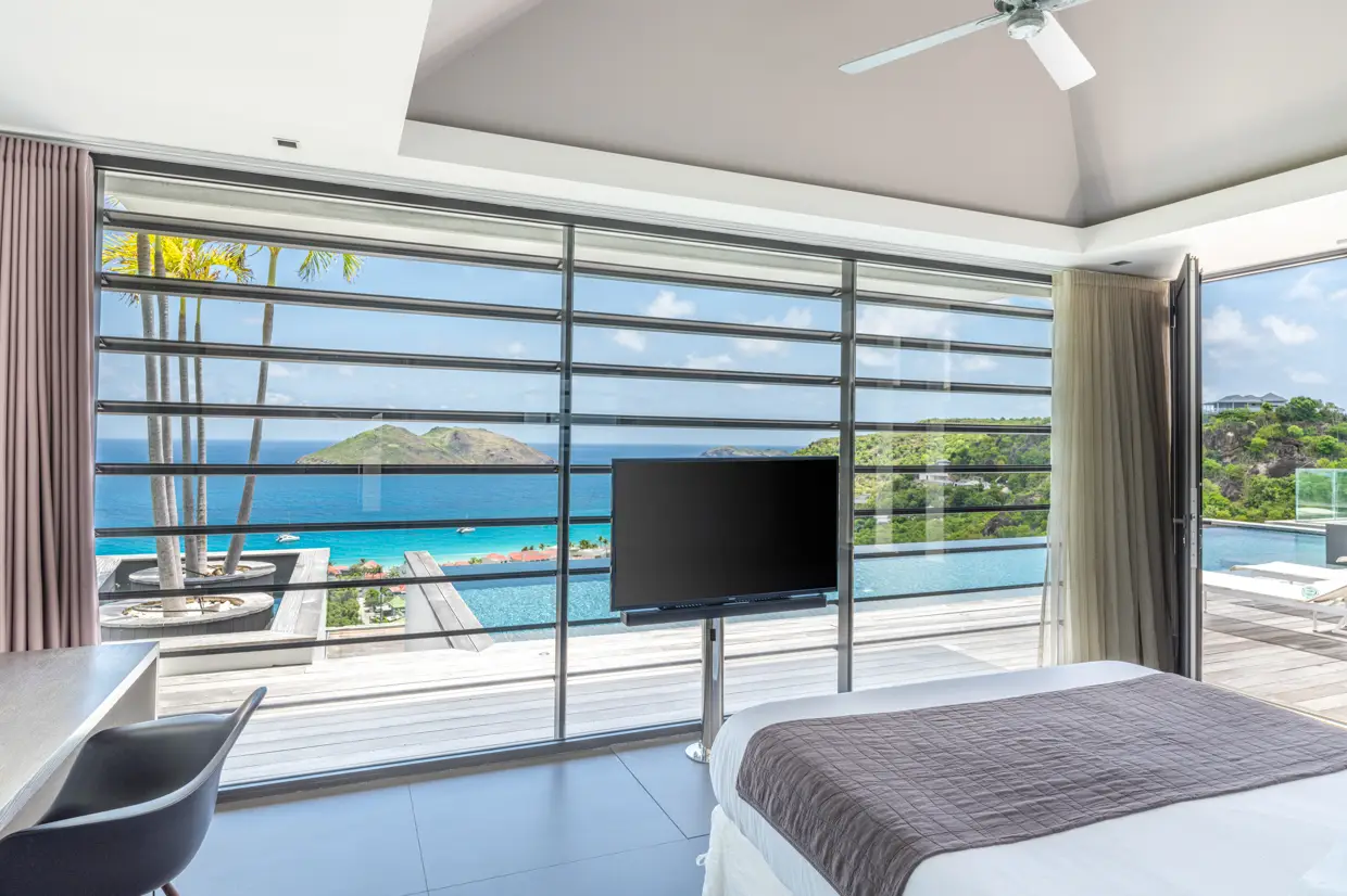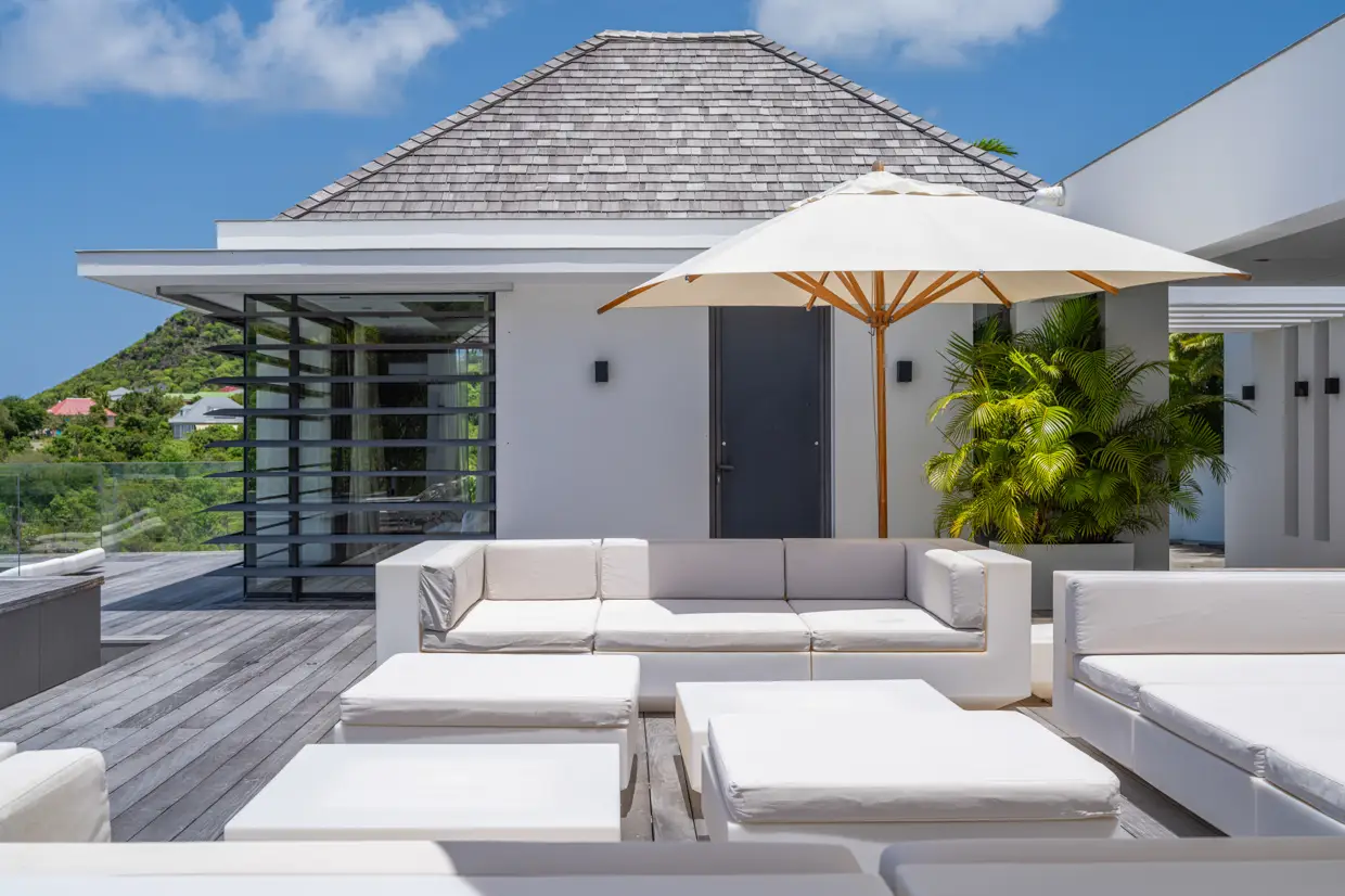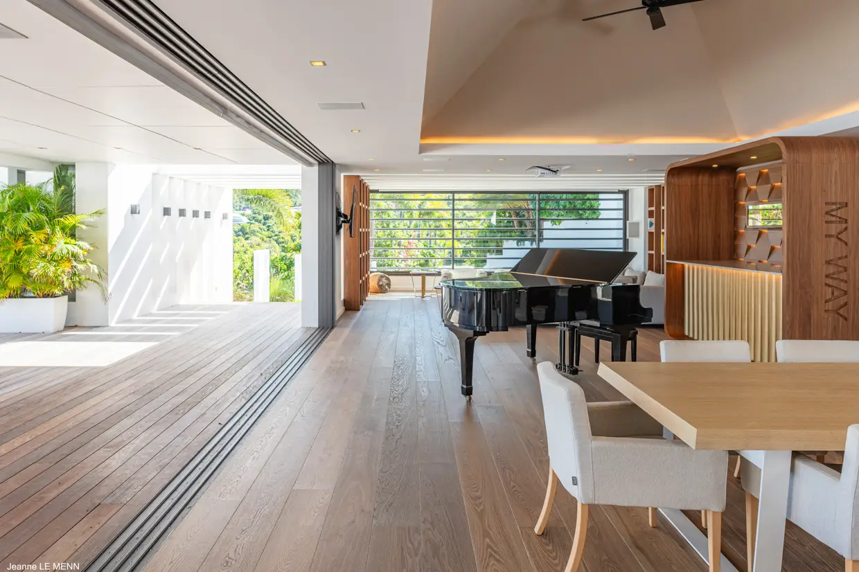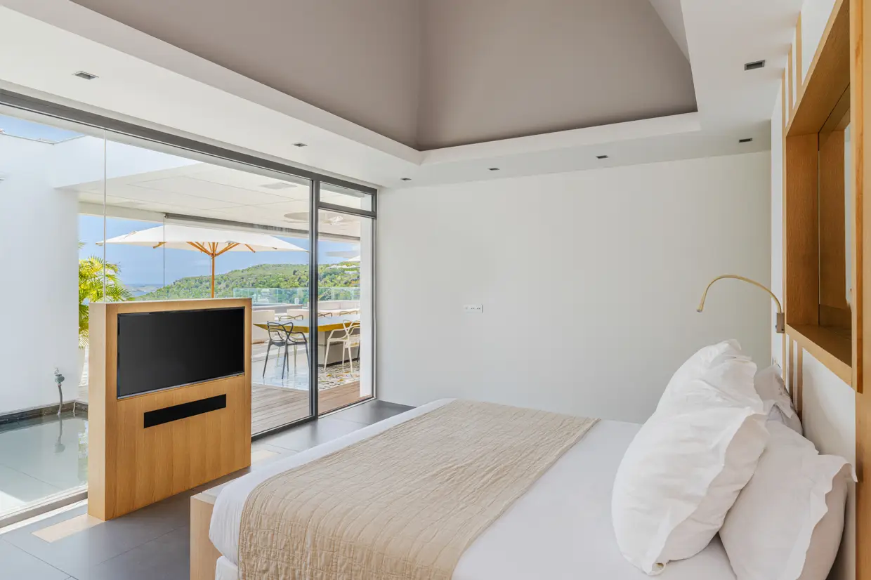 Nestled in the idyllic setting of Colombier, Villa “My Way” promises an exclusive living experience, where every detail is carefully designed to enhance the daily life of its occupants. Designed by architect Patrick Raffeneau, this luxurious property features ultra-contemporary architecture, creating spacious, pleasant, and refined interior and exterior spaces. Arranged on two levels, the property guarantees total privacy. As soon as you cross its threshold, you’re greeted by a breathtaking view of Flamands Bay and the ocean with the ilet Bonhomme in the background; a 180-degree panorama that’s sure to captivate your gaze at every turn. The main living space is a veritable haven of peace and style, featuring a vast living room with projection screen, a dining room, a fully equipped kitchen, as well as a professional kitchen behind the main room to accommodate your private chef. Furnished and decorated with high-quality pieces and noble materials, this space exudes elegance. The interior design, dotted with nods to the famous song “My Way” for which the villa is named, creates a unique atmosphere. A magnificent grand piano adds an artistic touch, reinforcing the villa’s sophisticated ambience. The vast terrace features a second dining area under the roof, equipped with a Yellow Lego table to host up to 18 guests. You’ll be delighted by the heated infinity pool, which seems to melt into the horizon, creating an illusion of the pool connecting to the sea. Around it, the terrace invites you to relax, whether in the jacuzzi or sunbathing on one of the deckchairs. The five en-suite bedrooms are spread across the different levels. Four of them boast magnificent sea views, and each has been meticulously furnished, combining modern comfort with elegant touches. Your well-being is not forgotten, with a fitness room equipped with the very best machines. Villa “My Way” is a luxurious retreat where you can recharge your batteries and savor every moment on the island.