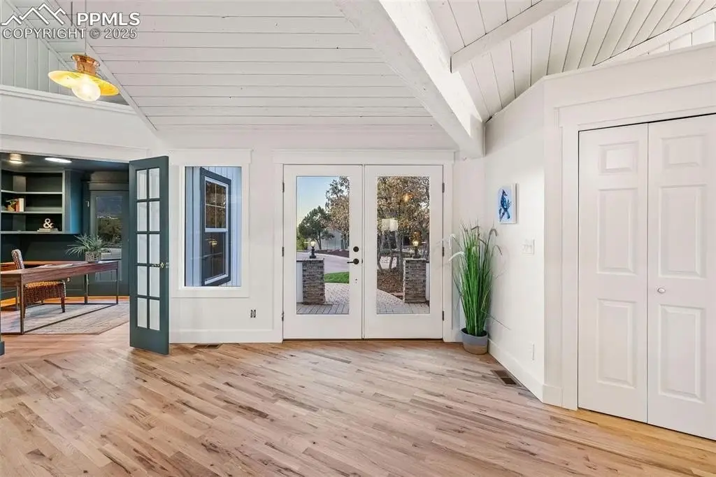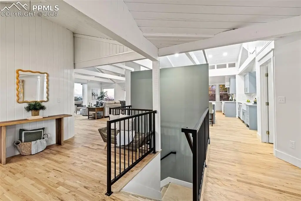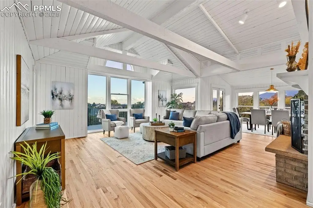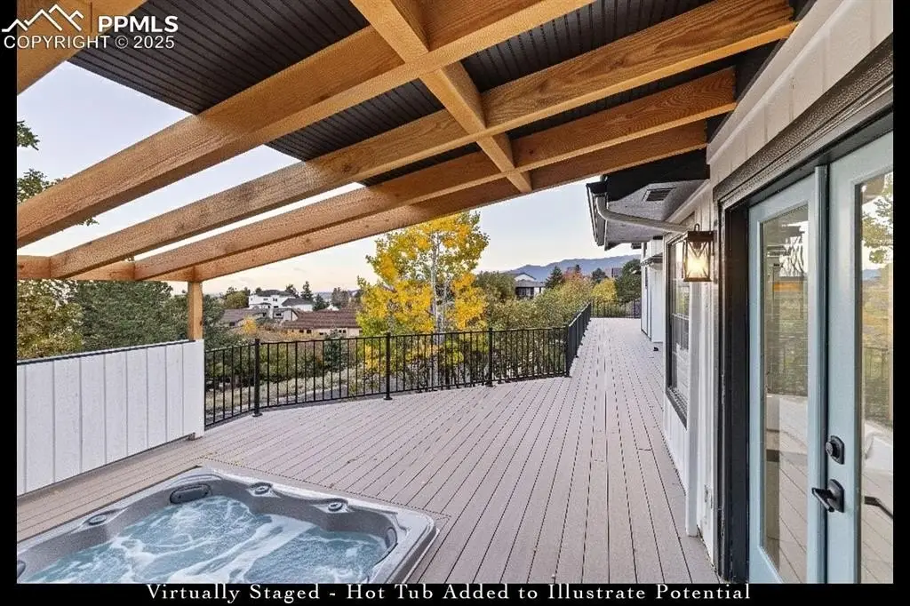 Rare Southern Cape Cod/Beach Style Retreat in Colorado Springs – City & Mountain Views! Welcome to this fully remodeled, one-of-a-kind Southern beach-inspired ranch perched in one of Colorado Springs’ most sought-after neighborhoods. Blending coastal charm with mountain living, this home offers breathtaking panoramic views of both the city skyline and the Front Range — a truly rare find in the region. Step inside and you will immediately notice the vaulted, beamed ceilings with tongue-and-groove detailing, setting a warm, airy tone throughout the open-concept main level. The heart of the home is a gourmet chef’s kitchen, featuring high-end GE Café appliances, a double oven, and a stunning pass-through fireplace that connects both the kitchen and living areas. The expansive main-level master suite feels like a private retreat, boasting generous space, custom finishes, and spa-like elegance. Designer touches are found throughout the home, from curated lighting to premium flooring and custom cabinetry. Enjoy true indoor-outdoor living on the brand-new 1,800 sq ft composite deck, perfectly positioned for spectacular city views and engineered for a drop-in hot tub. The walk-out basement offers additional living and entertainment space, seamlessly connecting to the beautifully landscaped yard. The home has new windows, deck, concrete patios, roof, A/C, all new landscaping and sprinkler system, interior/exterior paint, custom kitchen cabinetry, quartz backsplash, and everything cosmetic. This home is turnkey and move in ready!