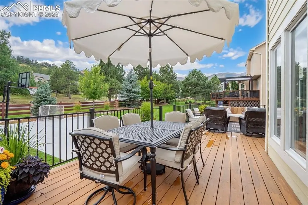 Stunning home in Rockledge at Peregrine boasting timeless style and designer finishes throughout. From the moment you enter, hardwood floors and an open floor plan set the stage for this inviting residence. The great room impresses with a dual sided stone fireplace and a wall of windows overlooking the backyard. A butler’s pantry leads to the renovated kitchen featuring quartz counters, a sprawling center island, gas cooktop, stainless appliances, and abundant cabinetry. The adjoining bayed dining nook is perfect for family meals. The floor plan offers flexible spaces to fit your lifestyle – formal dining room, office and living room. A half bathroom and remodeled laundry room complete the main level. Upstairs, the spacious primary suite offers a private sitting area, 5-piece bath, and walk-in closet. The upper level boasts three additional bedrooms—one with its own en-suite bathroom, and two connected by a Jack-and-Jill bathroom. The newly finished basement provides even more living space with a large family room, two bedrooms, and a full bathroom. Step outside to an expansive deck overlooking the park-like backyard with a sport court—perfect for entertaining, play, and relaxation. Walk to award winning Woodmen Roberts Elementary, neighborhood park or access acres of hiking trails in Blodgett Open Space. Situated in the foothills of Peregrine, you will enjoy mountain views, mature trees, and wildlife yet you are minutes from I-25 with easy access to downtown Co Springs, USAFA, shopping and dining. This home offers extensive hardwood flooring, new carpet, updated lighting, beautiful indoor and outdoor living spaces, invisible fence for dogs and much more. There is nothing left to do but move in and enjoy the amazing amenities of this home.