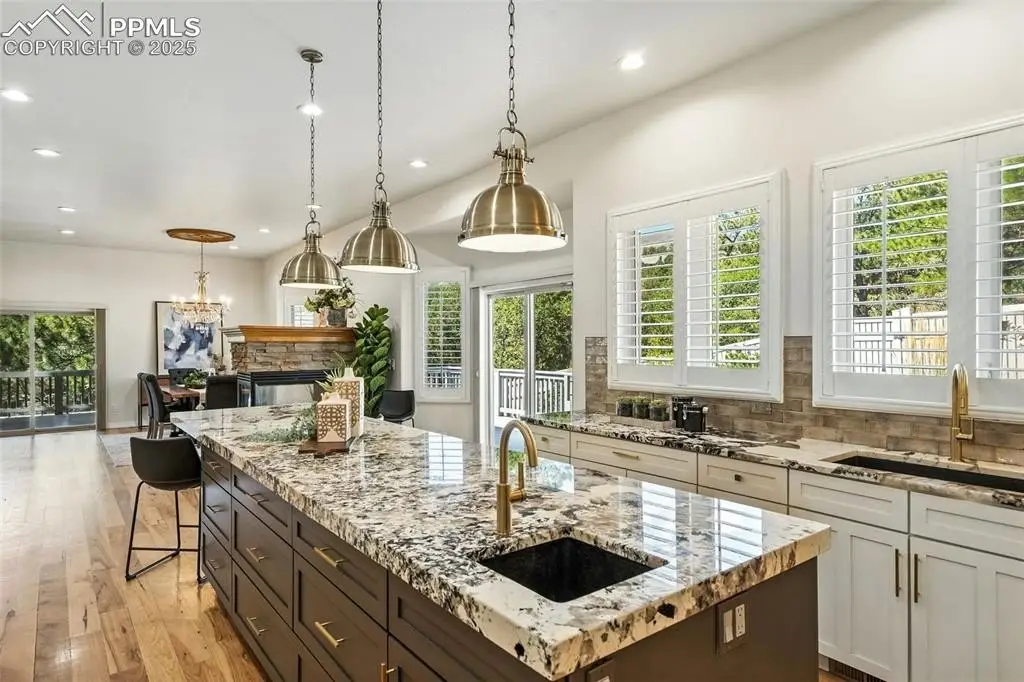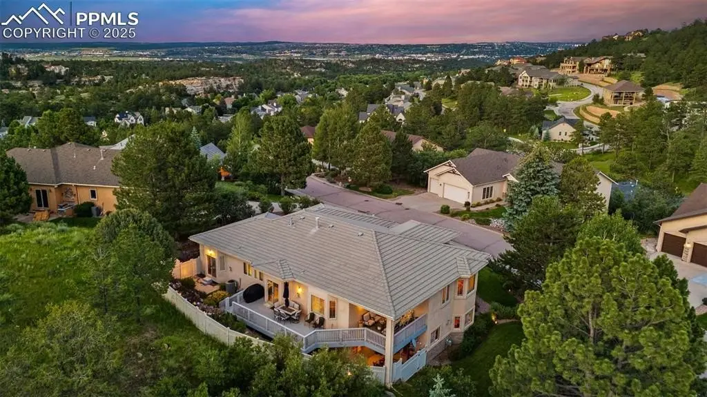 Stunning ranch-style home on a private cul-de-sac in Peregrine, features true main level living and is designed to capture the essence of Colorado living. From the moment you enter, soaring beamed ceilings, alder doors and rich hickory floors set an elegant tone in the open-concept great room complete with a wall of windows framing the foothill views. At the heart of the home is a beautifully remodeled kitchen featuring striking Patagonia granite, a sprawling center island, Italian Ilve professional range with 6 burner cooktop and dual ovens, and abundant cabinets. The adjoining dining room, anchored by a dual-sided fireplace, creates an inviting setting for gatherings. The luxurious primary suite is a retreat of its own, with a private walkout to the backyard, a cozy gas fireplace, and a spa-inspired bath featuring a jetted tub, oversized walk-in shower, and walk-in closet. A secondary bedroom with adjoining bath offers the perfect guest suite or private office. The main-level laundry is conveniently located. The walkout lower level was made for entertaining, with a sprawling family room, gas fireplace, wet bar, and seamless access to the patio. Two additional bedrooms, and two full bathrooms provide comfort and privacy. The versatile flex room is ideal for a gym, dance studio, or hobby space. Generous storage completes the level. Step outside to experience the tranquility of this truly special location. Relax on the expansive deck overlooking a cascading water feature with the backdrop of towering ponderosa pines and scrub oak. Located minutes to award winning District 20 schools, shopping and dining with easy access to I-25. This home embodies the perfect balance of luxury, functionality, and natural beauty—truly the ideal Colorado lifestyle.