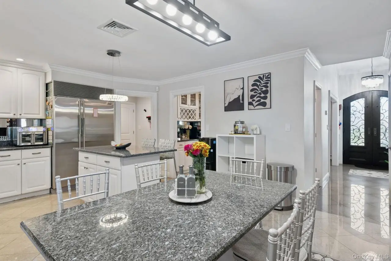 Located in the prestigious Country Woods Estates of Commack, this custom expanded five-bedroom, five-bath Colonial blends Old World sophistication with modern luxury. The stately stucco and stone faade, paver drive, and fountain courtyard create a commanding presence from the moment you arrive. A grand two-story foyer with wrought-iron double doors and a sweeping staircase featuring ornamental iron railings introduces interiors rich with marble, granite, and fine millwork. The gourmet kitchen, with a large center island, high-end stainless-steel appliances, and breakfast area, flows seamlessly into the family room and entertainment bar room, joined by a dual fireplace-the perfect ambiance for hosting and relaxation. Adjacent to the bar room, a professional home theater offers a true cinematic experience, continuing the home's entertainer-focused design. The main level also includes a versatile bedroom or home office, a convenient laundry room, and access to a two-car garage. Upstairs, the thoughtful layout showcases a private primary suite wing with spa bath and custom closets, while the opposite wing includes four additional bedrooms, two with en suite baths, providing privacy and flexibility for family or guests.The lower level features a full fitness gym, designed for wellness and recreation. Outdoors, enjoy resort-style living with a heated in-ground pool, multi-tiered stone patios, dual gazebos, and a fully equipped outdoor kitchen with dining area and full bathroom-all surrounded by lush landscaping and accent lighting for ultimate privacy. A rare opportunity to own one of Country Woods' most distinctive residences-where timeless design, thoughtful architecture, and modern elegance come together in perfect harmony.