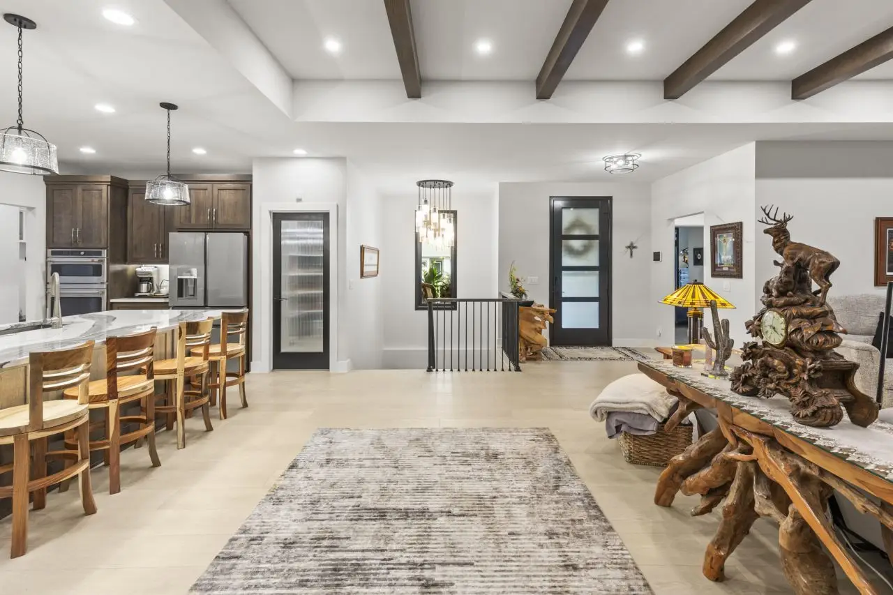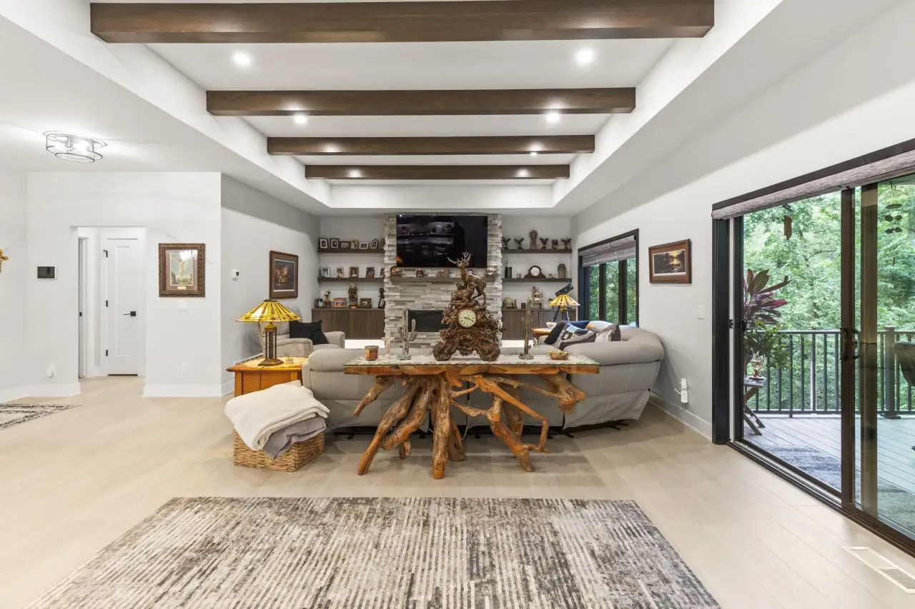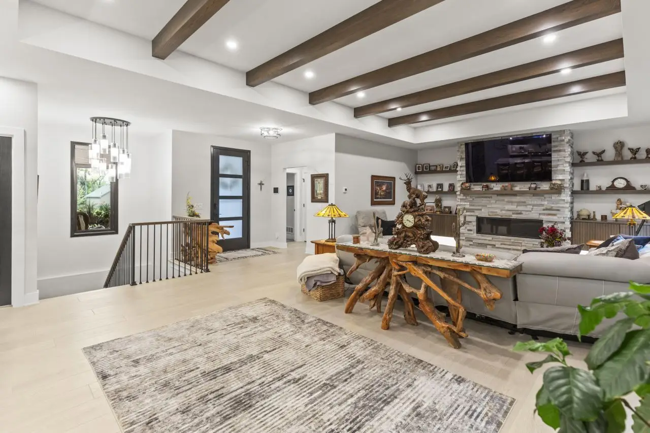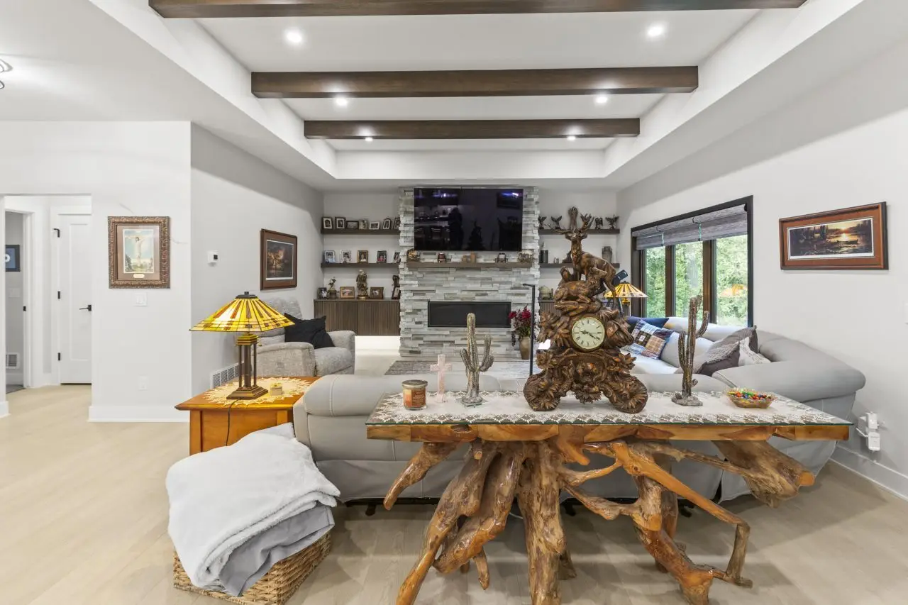 Step into a home where every detail has been carefully considered and no finish overlooked. This custom built 4-bedroom, 3.5-bath blends thoughtful design with everyday comfort. The exterior sets the tone with clean lines, stone accents, and 3 car garage. Inside the open concept showcases ceiling beams, a stone fireplace, and windows framing the wooded backdrop. The kitchen and living areas combine high-end finishes with function, ideal for living and entertaining. The primary suite is a retreat with a spa inspired bath, dual vanities, soaking tub, and walk-in closet. Downstairs a family room with wet bar is perfect for gatherings, and outside a hot tub awaits for the ultimate in relaxation. Every element has been thoughtfully crafted, creating a home that is both elegant and inviting.