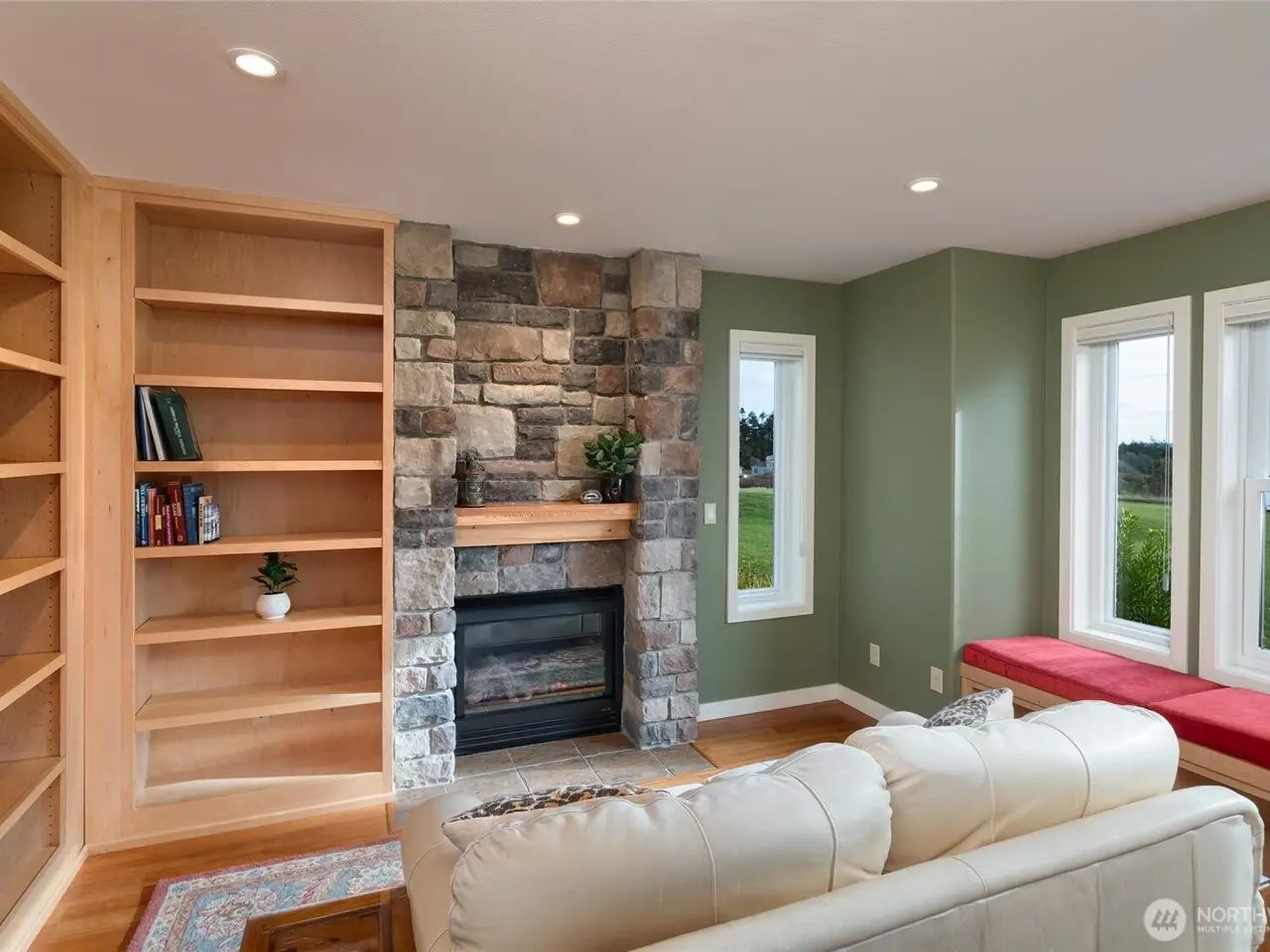 Discover timeless Craftsman beauty and island tranquility on 5 peaceful acres with sweeping prairie, water, and mountain views--where eagles glide overhead. Enjoy recent upgrades including new warranty-backed windows, appliances, and fresh paint inside and out. The entertainer's kitchen opens to a covered patio, perfect for gatherings. Relax by one of two fireplaces or soak in the hot tub while taking in the views. Main-floor primary suite with garden-view slipper tub. Detached garage with workshop and 544 sq. ft. unfinished space above--ideal for an ADU, art studio, or guest suite. A circular driveway loops the property, perfect for RV or boat parking. Greenhouse, raised gardens, and space for horses complete this serene retreat.