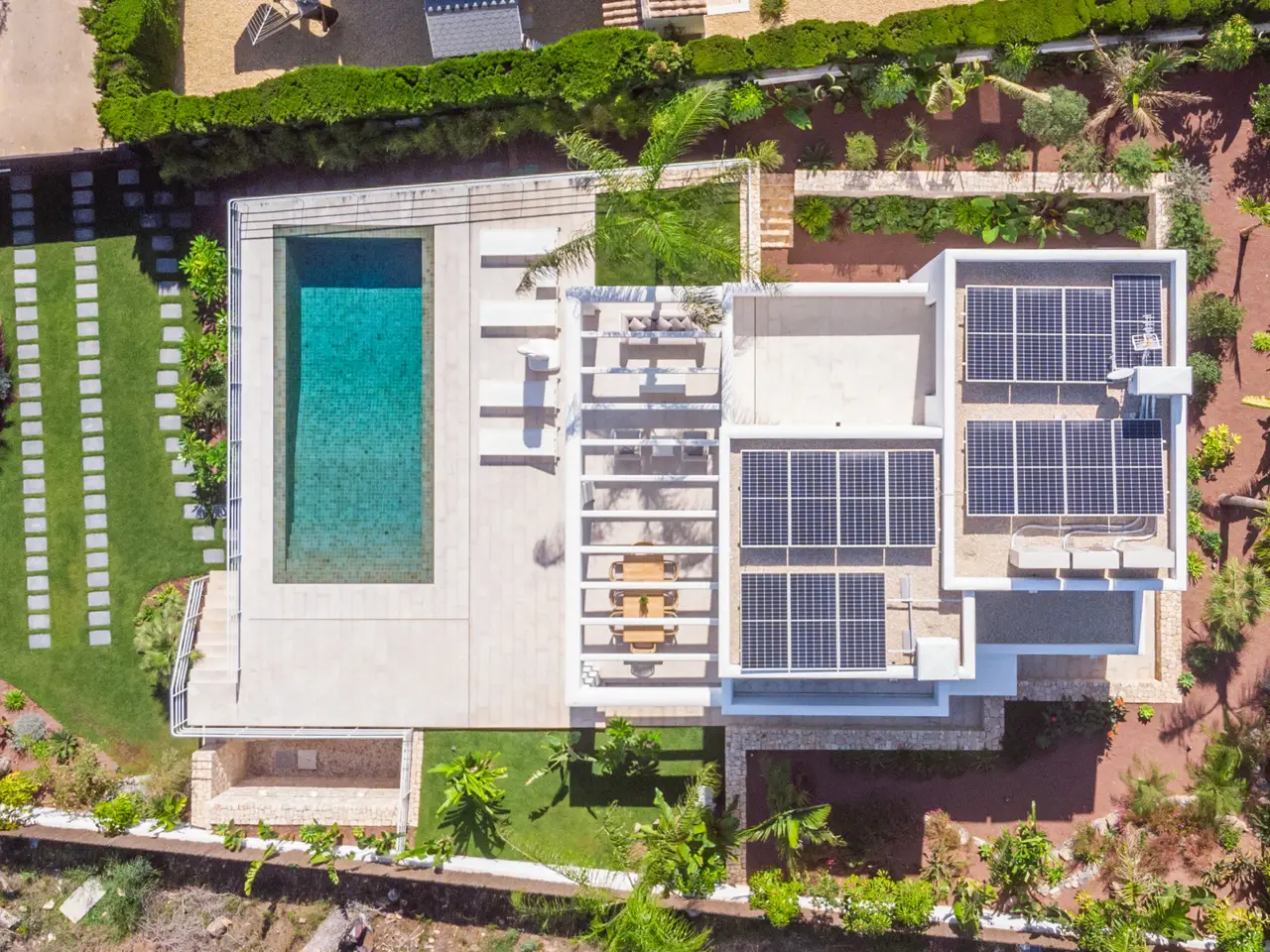 The property is surrounded by a beautiful garden and is distributed on three floors. On the main floor are the living room with access to the terrace and the area of the magnesium pool and volcanic stone, fully equipped kitchenette with higher-end appliances, a courtesy bathroom and double bedroom with en-suite bathroom. On the upper floor there are two bedrooms, each with en suite bathroom, dressing room and access to terrace. On the ground floor there is a double bedroom with dressing room and en-suite bathroom, office, library, bathroom, cellar, cinema room and machine and storage area. The property is equipped with air conditioning, underfloor heating, solar panels and domotic system. It is worth noting the design, the luminosity of the house, its large windows and that all the materials used in the construction are of higher quality. This villa is perfect for both summer and winter. .