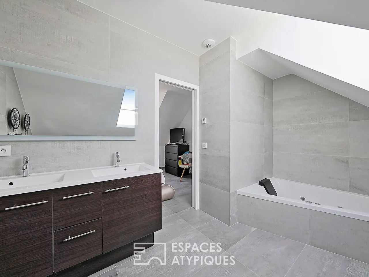Maison d'architecte avec piscine et jardin paysagerIn a hamlet halfway between Crecy-la-Chapelle and La Ferte-sous-Jouarre in a preserved and green environment, this contemporary architect-designed house from 2018 develops a living space of 442sqm in total on two levels, on a landscaped plot of almost 2800sqm. Designed to combine volume, light and high-end comfort, it has five suites, a heated salt-water swimming pool, a jacuzzi, a 50sqm garage with a fast-charging electric terminal, and an unobstructed view of the countryside. From the entrance, the clean lines, the chosen materials, the brightness and the generosity of the volumes set the tone. The ground floor houses a master suite with a double dressing room and shower room, an office space, a dining room, a separate fitted kitchen with a scullery and pantry, bathrooms, and a living room bathed in light through a bay window opening onto the terrace and the swimming pool. A bar area and a home cinema with multiple screens enhance the conviviality of the place. Upstairs, the glass-floored landing leads to three suites with a dressing room and shower room, a fourth suite with a spa bathroom, a mezzanine living room and a gym/games room. The carefully designed interior layout allows for smooth and functional circulation. The outdoor spaces offer a real relaxing break: a 5×11 m heated swimming pool, a 5-seater jacuzzi, a continuous terrace, a fitted summer kitchen, a shower room and bathrooms for exiting the pool or spa, as well as a landscaped garden structured around various species, olive trees, palm trees, cherry trees and colorful hedges. The equipped well provides watering and supplies the sanitary facilities. One hour from Paris, this property benefits from a bucolic setting while remaining close to amenities, schools and transport links. Solar panels, underfloor heating by insert, reversible heat pumps, double aluminum glazing, home automation and optimal energy performance: a rare property, with an atypical character, ideal for a large family and with strong rental potential, currently operated as an Airbnb. ENERGY CLASS: A / CLIMATE CLASS: A Amount of annual energy expenditure for standard use established from energy prices indexed for the years 2021, 2022, 2023 (subscription included) between EUR965 and EUR1305 per year. Contact: Elvire de la MARTINIERE - 06 03 05 05 96 RSAC: 800 930 232 MEAUXREF. SM1158Additional information* 11 rooms* 5 bedrooms* Outdoor space : 2748 SQM* Parking : 5 parking spaces* Property tax : 3 797 €Energy Performance CertificatePrimary energy consumptiona : 41 kWh/m2.yearHigh performance housing*41kWh/m2.year1*kg CO2/m2.yearA*B*C*D*E*F*GExtremely poor housing performance* Of which greenhouse gas emissionsa : 1 kg CO2/m2.yearLow CO2 emissions*1kg CO2/m2.yearA*B*C*D*E*F*GVery high CO2 emissionsEstimated average annual energy costs for standard use, indexed to specific years 2021, 2022, 2023 : between 965 € and 1305 € Subscription IncludedAgency feesThe fees include VAT and are payable by the vendorMediatorMediation Franchise-Consommateurswww.mediation-franchise.com29 Boulevard de Courcelles 75008 ParisInformation on the risks to which this property is exposed is available on the Geohazards website : www.georisques.gouv.fr