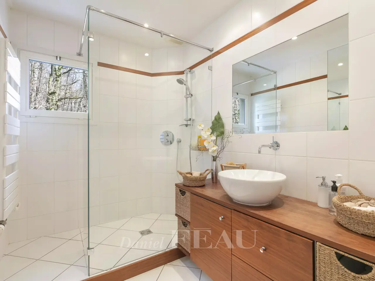 This property offering 411 sqm of floor space and about 260 sqm of living space in excellent condition is set in 6000 sqm of grounds in a peaceful leafy environment. Very bright and tastefully renovated throughout by the current owners, it includes a 75 sqm triple living/reception room featuring an 8-metre high cathedral ceiling and a wood burner, a dining room opening onto a terrace and the garden, a luxurious fitted and recently equipped kitchen with dining facilities, a utility room, and a near 46 sqm master suite with a fully west-facing bedroom featuring a fireplace, a bath/shower room/wc and a dressing room. A bright mezzanine study leads to two spacious bedrooms (one with a shower room), a smaller third bedroom or possible dressing room, and a shower room. On a basement comprising a 100 sqm 4-car garage, a boiler room and two large storage rooms. The floodlit leafy grounds are potentially partially constructible, and feature a swimming pool , a vegetable garden and two outdoor parking spaces. In a convenient location near the shops, the schools and the transport networks (Paris 25 min via the A14, and 25 min by train). Bus lanes access excellent schools including Blanche de Castille, Saint-Jean-Hulst and Saint-Germain-en-Laye International School.