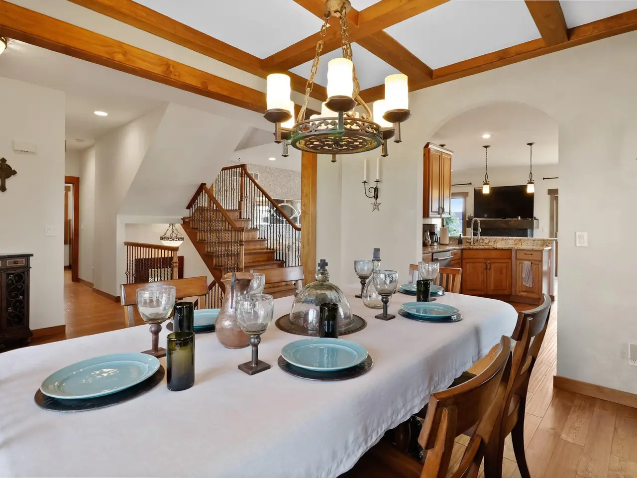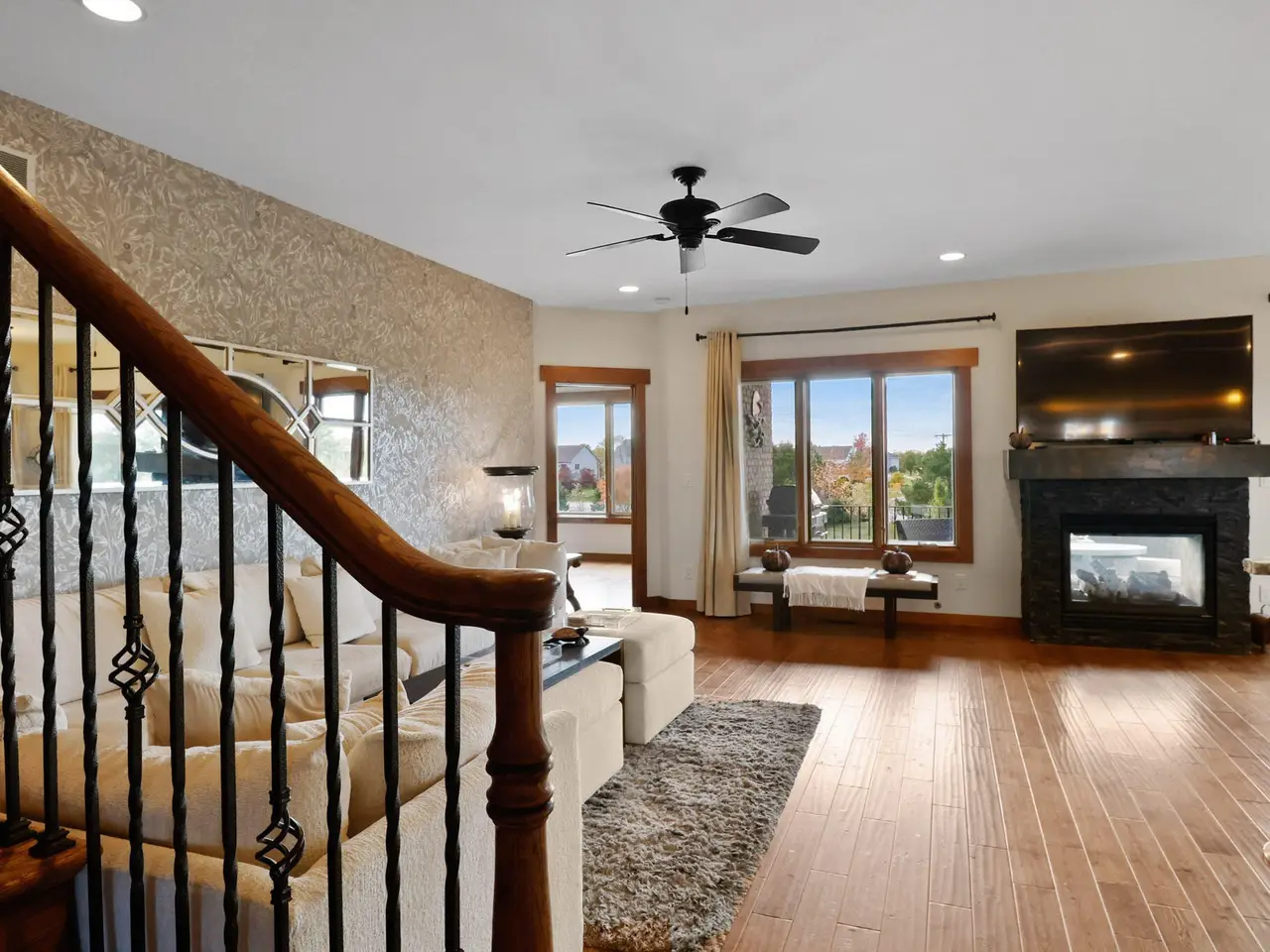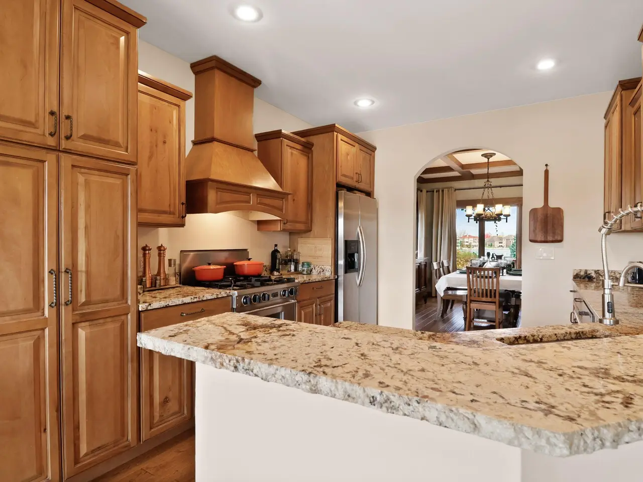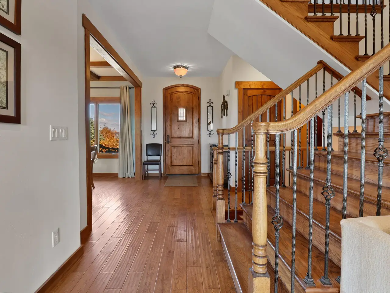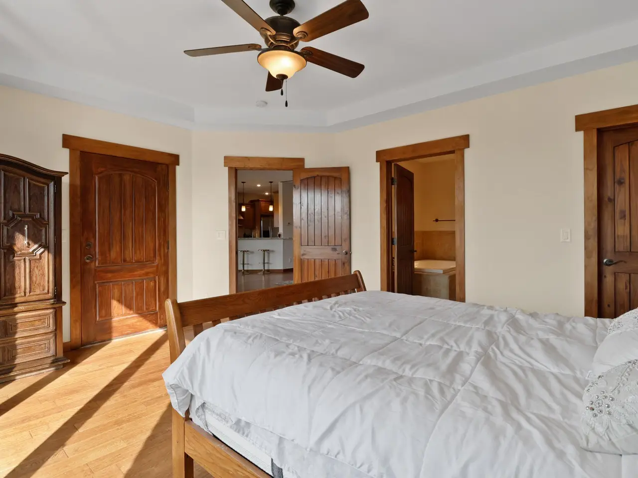 Gorgeous brick and stone home with a finished walkout is nestled into a hill with water views from every window. A seamless blend of old world charm and modern appointments create a warm and inviting retreat. 5 custom baths, 4 beds, 4 fireplaces including the masonry outdoor fireplace, 3 outdoor spaces with 2 tiled, covered balconies & a large paver patio, kitchens located on the main and walkout level perfect for entertaining or related living plus a dock with premium MoistureShield Decking for taking advantage of swimming, boating & fishing on Doubletree Lake. Handscraped oak hardwood flows throughout the main level including the entry, dining with coffered ceilings, kitchen with character maple cabinetry & Delicatus granite counters, breakfast room & living rooms featuring an indoor/outdoor fireplace open to the 22' x 10' balcony. The upper level owner's suite is a true escape with a double sided FP, balcony, two 20'x 6' WICs & a spectacular bath lined in antiqued marble with 2 floating vanities, 2 person tub, walk-in shower & linen closet. Main level primary with ensuite hosting a whirlpool tub & tile shower, large WIC & balcony access. Main floor 2nd bed & upper level 4th bed/bonus room are both adjacent to their own stunning baths. The walkout is perfect for entertaining with acid stained concrete floors & a kitchen featuring built-in full size fridge & freezer units, convection microwave, oven & warming drawer, gas cooktop plus a freestanding island with integrated bench seating. A convenient basement bath features a beautiful shower with high definition granite look walls perfect for a rinse after a day on the lake. The family room with gas FP & coffered ceilings, gym and storage area complete the basement. Back & side sliders access the expansive patio. Whether you'll be enjoying the gorgeous water views year round or using this for your lakefront getaway, the quality craftsmanship and premium finishes make you feel like you're living on holiday every day.