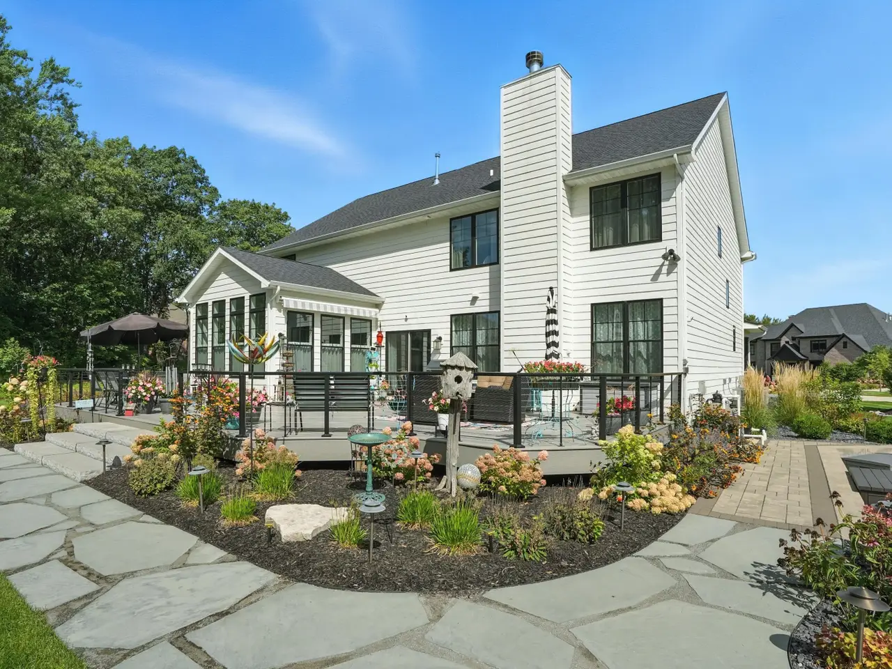 Welcome to this exquisite custom-built two-story home, perfectly situated on a serene .88-acre cul-de-sac lot, offering a peaceful and private wooded view that creates a tranquil atmosphere. As you approach the residence, you'll be greeted by a charming covered front porch, ideal for relaxing with a morning coffee or enjoying evening sunsets. Step inside to find an inviting foyer that seamlessly leads you into the great room, which features a stunning fireplace that adds warmth and ambiance, perfect for cozy evenings with family and friends. This space boasts a perfect blend of elegance and comfort. The open-concept kitchen is a culinary delight, featuring an oversized island that provides ample seating for gatherings, a spacious walk-in pantry, and a convenient mudroom. Sunlight floods the four-season room through an abundance of windows, creating a bright, airy space that's perfect for year-round enjoyment. The luxurious master suite is a true retreat, complete with an enormous walk-in closet, additional storage closets, and a spa-like master bathroom, ensuring your comfort and relaxation. The home also features three generously sized additional bedrooms and a well-appointed full bathroom, making it perfect for family living or entertaining guests. The main level is adorned with beautiful hardwood floors, adding warmth and sophistication. Step outside onto the expansive maintenance-free deck that wraps around the back of the home, complete with a powered awning to provide shade when desired, perfect for outdoor dining and entertaining. The professionally landscaped yard is nothing short of stunning, anchored by an inviting inground pool that serves as the focal point of the outdoor space. This backyard oasis features a cozy fire pit and a charming playhouse, coupled with ample grassy areas for hosting gatherings with friends and family. Unfinished basement is roughed in for future bath and finishing. 3.5 car garage is perfect for all your storage!