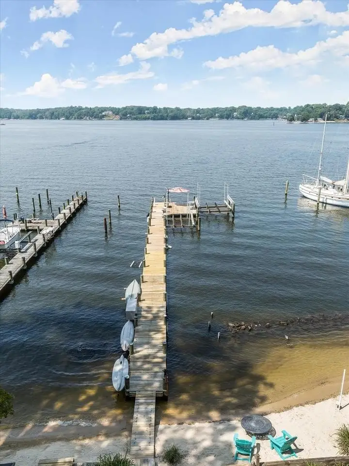 Embrace authentic luxury waterfront living in this exceptional three-level residence, showcasing a private beach, a pier with multiple boat slips and two lifts, and a fully renovated interior designed to capture sweeping water views from every level. The sun-drenched open floor plan welcomes you with living spaces and immediate water views framed by picture windows and skylights streaming abundant natural light. Hardwood floors and a gas fireplace add comfort and refinement. Architectural details such as wood beams and a shiplap ceiling lend warmth and character to the designer kitchen and breakfast area, beautifully appointed with recycled Italian glass pearl tile backsplash and Kashmir dual-finish granite countertops. The upgraded gourmet kitchen is ideal for the culinary enthusiast, featuring an impressive, oversized island with gas cooktop, premium stainless-steel appliances, a walk-in pantry, and custom soft-close cabinetry with roll-out spice racks for optimal organization. A spacious three-season sunroom extends from the kitchen, offering access to one of three expansive decks offering an ideal setting for entertaining or enjoying tranquil waterfront views year-round. Main level living includes a powder room to service the open floor plan, and recent upgrades include an additional service kitchenette outfitted with custom cabinetry and a private In-law/Guest bedroom suite with skylights, a new full bath, and a private secondary entrance. Upstairs, the primary bedroom suite takes full advantage of panoramic waterside views offering a private screened porch, and gas fireplace with stone surround. The water views extend into a spacious and fully upgraded luxury bath enhanced with heated tile flooring, makeup and dual quartz vanities, and a frameless shower with seating and three shower heads. Two additional bedrooms, a full bath, and a new waterside deck, complete the upper level. Downstairs, the walk-out lower level invites outdoor waterside living with an architectural folding glass wall system that stacks open to one side offering a seamless indoor-outdoor transition with a large recreation area, another full bath, and an expansive unobstructed view of the Severn River. Simply open the folding glass wall and enjoy endless waterside fun including an 18 ft. crab table, Tiki bar with sink and water service, and an enclosed outdoor shower. A multi-level stair offers scenic landings as it cascades from the main house down to a private sandy beach and newly decked pier with two boat lifts, (10k and 24k) and multiple slips. Experience premier waterfront living with deep, navigable water that provides effortless boat access to the vibrant heart of downtown Annapolis within minutes. The Herald Harbor community has a neighborhood feel and amenities that include a community center, boat ramp, Bonaparte Beach, and walking trails. Gather with friends for book clubs, pickleball, local dining options and endless water-oriented activities. Enjoy easy access to downtown Annapolis, or commuter routes to Baltimore, DC, and BWI airport.
