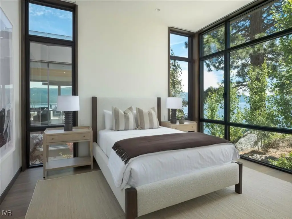 New lakefront construction with 100 feet of pristine shoreline on Crystal Bay, Nevada, Lake Tahoe. This contemporary 5-bedroom residence blends organic design with modern luxury. Panoramic lake views are showcased through floor-to-ceiling glass and skylights, flooding the interiors with natural light. High ceilings in the great room enhance the sense of space, while sliding glass walls open to expansive decks, creating seamless indoor-outdoor living. The primary suite and main living areas reside on one level, offering convenience and privacy. A lower-level rec room leads to a patio and spa. Crafted with ledgestone, European white oak, and quartz, the home embraces natural materials and thoughtful design. Eastern exposure provides stunning sunrise and moonlit lake views. A shared pier with a dedicated buoy and boat hoist completes this extraordinary lakeside retreat. Completion is scheduled for May 2025, offering the perfect opportunity to enjoy year-round Tahoe retreats.