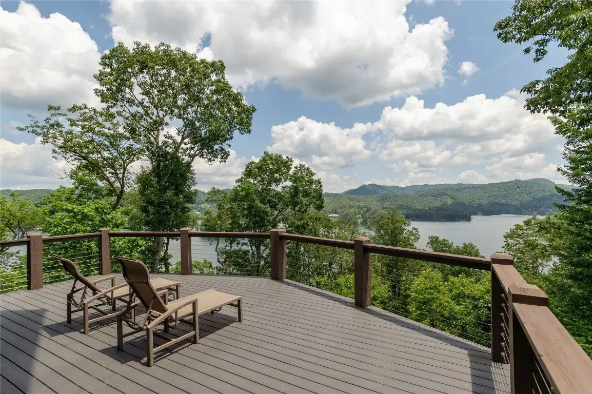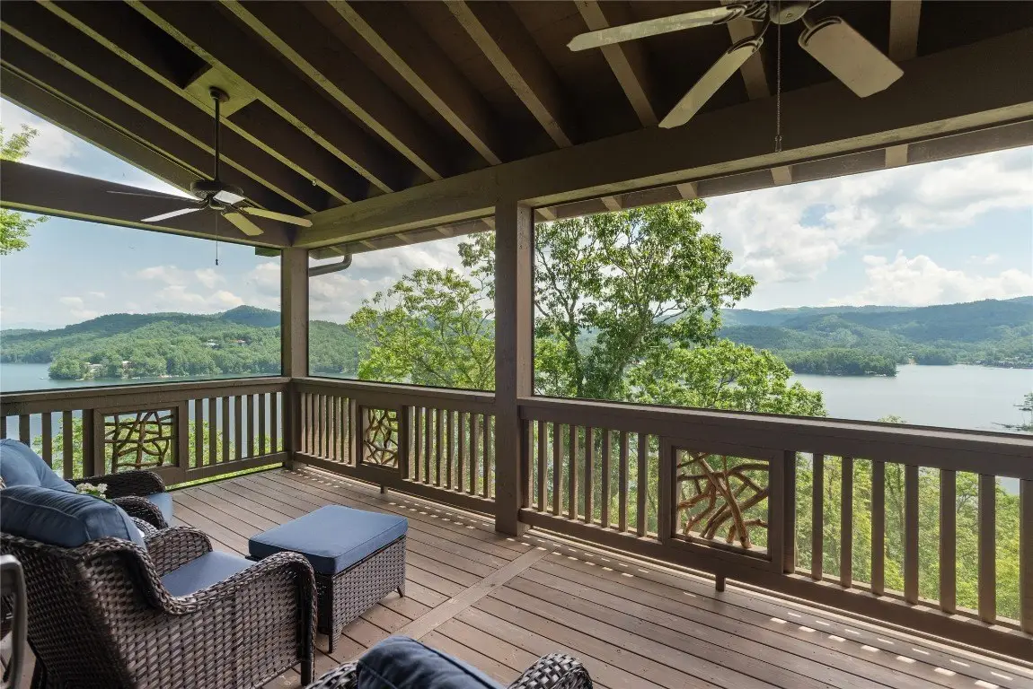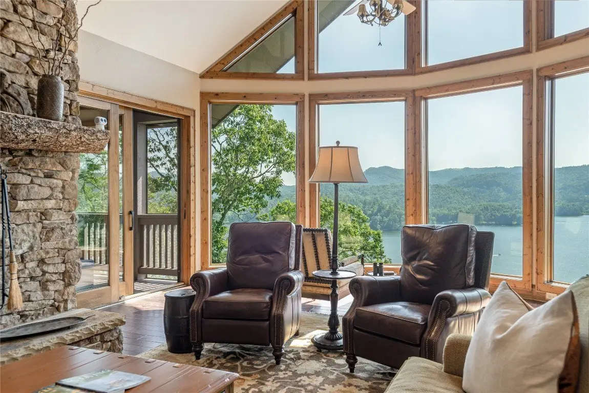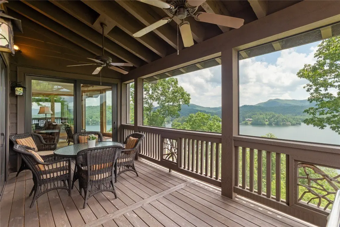 Nestled in the prestigious Summer Hill community overlooking the serene waters of Lake Glenville, this custom-built residence epitomizes refined mountain living. Set on two expansive lots to ensure privacy, the home offers breathtaking 180-degree views of the shimmering lake and majestic surrounding mountains from nearly every room.? Beautiful vistas for as far as you can see. Enjoy boating, a day at the beach with private docks and sand, or fishing in the clear, fresh waters of Lake Glenville. The great room serves as the heart of the home, featuring soaring vaulted ceilings and a grand stone fireplace that frames the panoramic vistas. Adjacent, the gourmet kitchen is a chef's dream, equipped with a gas range, central island, and premium French-door refrigerator, all complemented by rich cabinetry and elegant countertops. The main-level primary suite provides a tranquil retreat with a screened sleeping porch ideal for enjoying the cool mountain evenings. The ensuite bath boasts a steam shower, jetted soaking tub, dual vanities with ample storage, and heated flooring for ultimate comfort. Designed for seamless indoor-outdoor living, the home features multiple screened porches and expansive open decks, perfect for savoring the crisp mountain air and captivating lake views throughout the seasons. The lower-level deck is an entertainer's delight, hosting a welcoming hot tub and an outdoor fireplace for gatherings under the stars. The residence's lower level caters to guests and entertainment, offering three spacious guest suites, a generous family room with a dedicated game area, a convenient kitchenette, and a private office. An impressive home theater with plush seating and state-of-the-art surround sound promises exceptional cinematic experiences. Starting with the drive through this well-maintained community and continuing up the private 300-foot entrance, you will know you have arrived at a very special home. Since the last ownership, extensive landscaping and many improvements have made this one of the most complete homes available inside and out. Residents of Summer Hill enjoy deeded lake access, a community dock, a charming outdoor pavilion, and gated security. Recent upgrades to the home include a Cummins generator, lush landscaping, and modern railings, enhancing both functionality and aesthetic appeal. Embrace a serenity, elegance, and natural beauty lifestyle in one of Lake Glenville's most coveted communities.