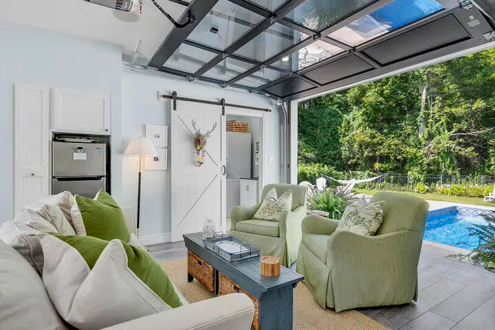 Pool area in private backyard