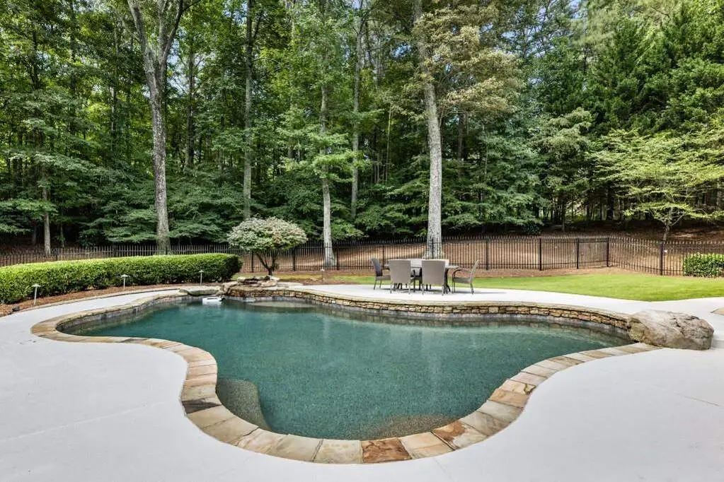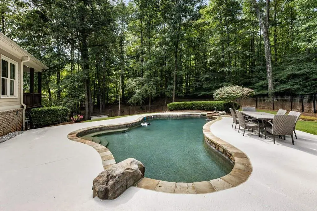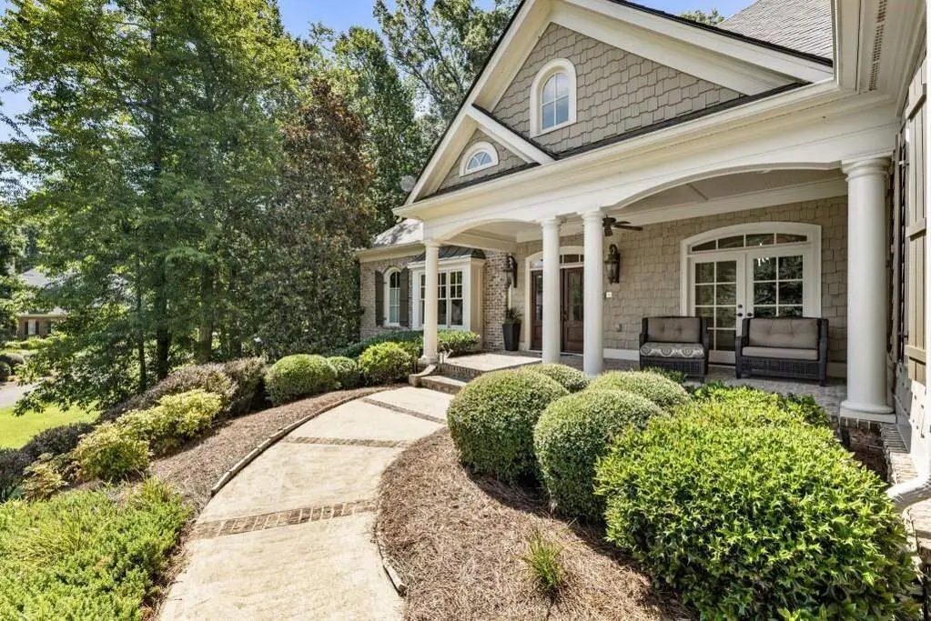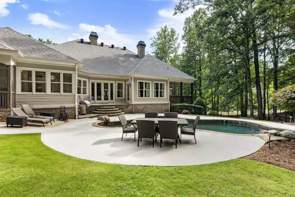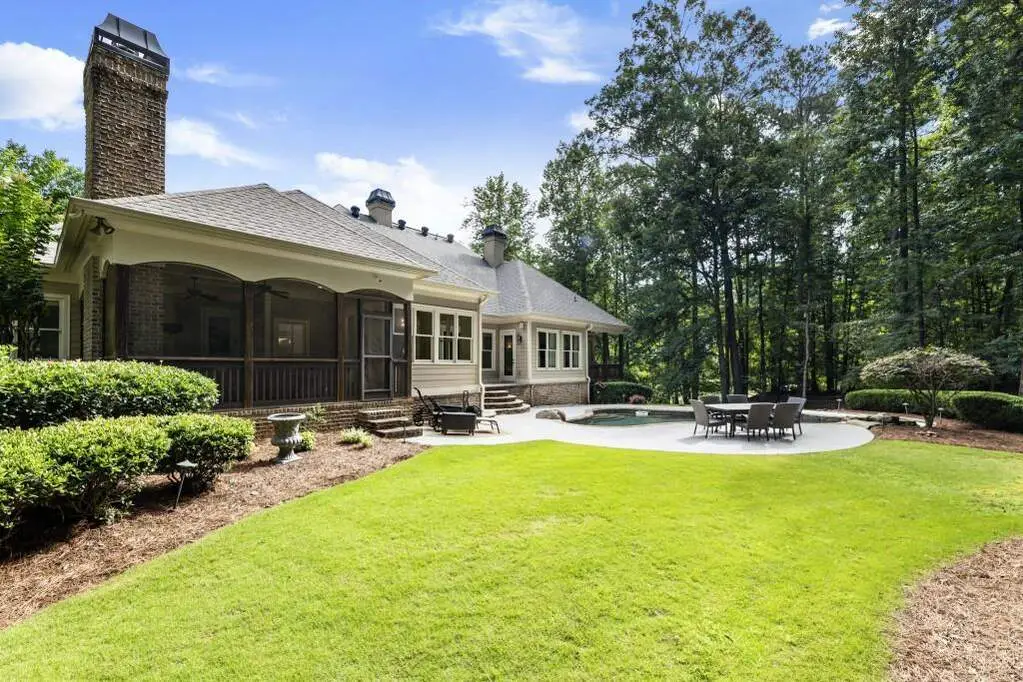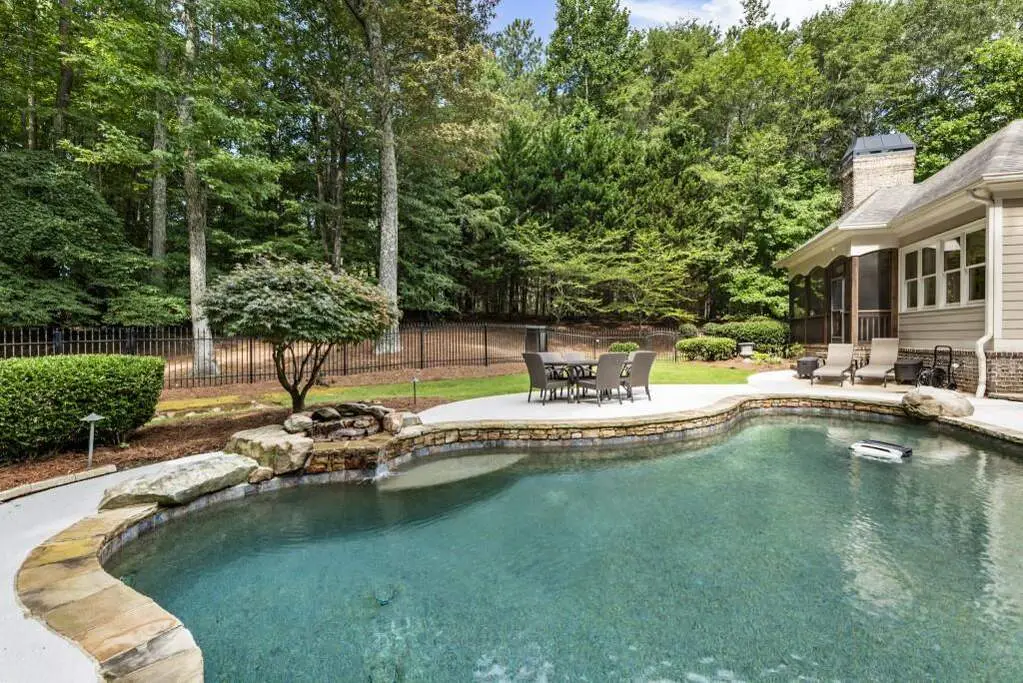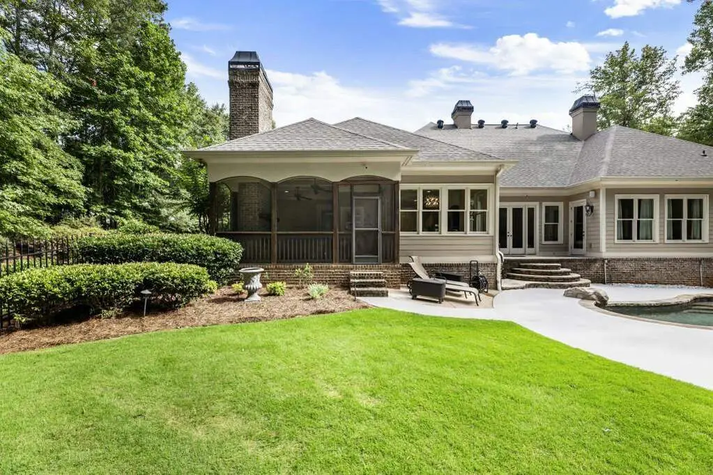 Welcome to this beautifully updated one level ranch style home that offers walk-out on the main level to your outdoor oasis featuring a gunite sparkling pool, a screened porch, and lots of outdoor entertaining space. This gorgeous home is located in Forsyth county and situated at the end of a quiet cul-de-sac in gated enclave of luxury homes. The charming front porch offers a warm welcome and sets the tone for the comfort and quality found throughout the property. Upon entering through the front door, you are greeted by a formal dining room on your right and a private study on your left, complete with built-in bookcases. This thoughtful layout creates a balanced and inviting entry that leads effortlessly into the main living space. The heart of the home features an open-concept kitchen design with this oversized island that offers seating and open concept. The completely modernized kitchen with all new appliances opens to the living room and screened porch. A centrally located fireplace serves as a warm and welcoming focal point, perfect for both everyday living and entertaining. Just off the kitchen, a screened-in back porch with its own fireplace offers a comfortable outdoor living space that can be enjoyed year-round. The primary suite is a peaceful and well-appointed space. The ensuite bathroom features separate dual vanities, two walk-in closets, and a large walk-in shower. A private bonus room, currently used as a home gym, adds function and flexibility. A second bedroom with ensuite is also located on the main floor. The fully finished basement includes two additional bedrooms, two full bathrooms, one half bathroom, a generous media room, and a wet bar. The lower level offers multiple flexible living spaces ideal for craft room, media space, movie room, ping pong or pool table room perfect for entertaining & hosting guests. Every major system has been thoughtfully updated including pool heater, HVAC, water heaters, roof replaced and freshly painted interior