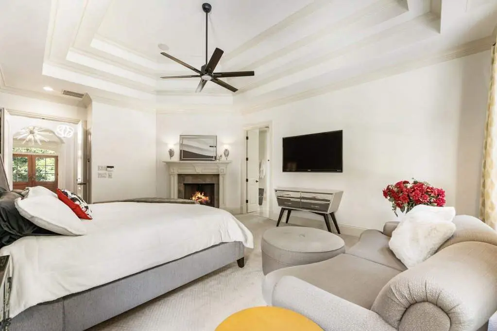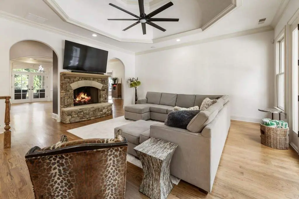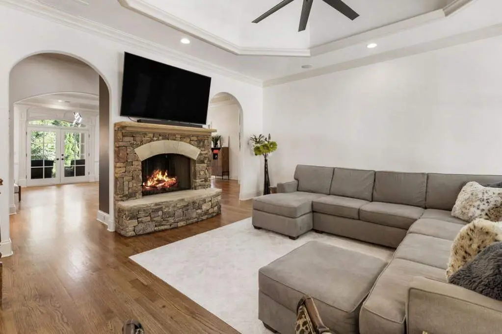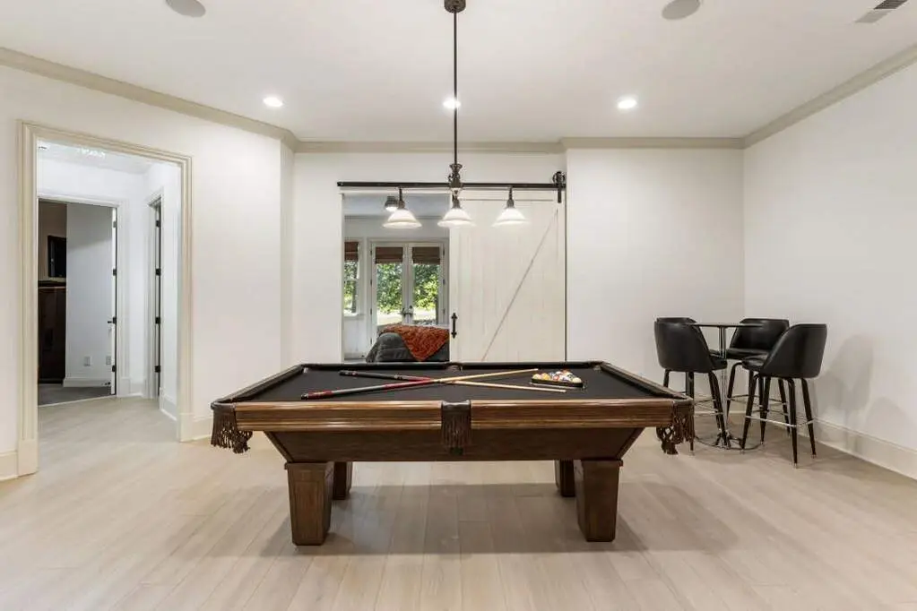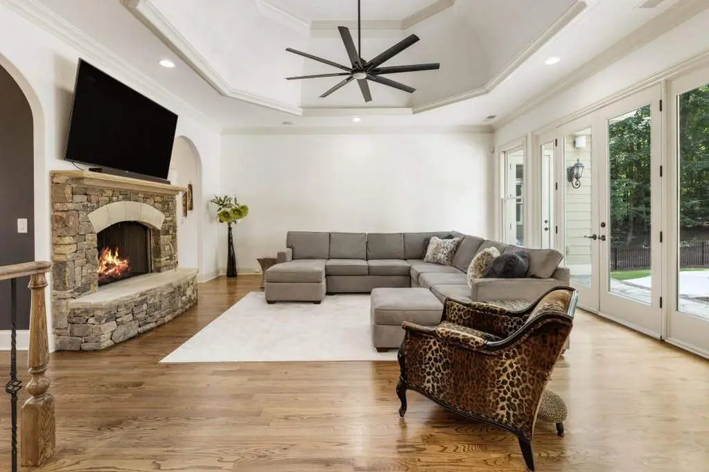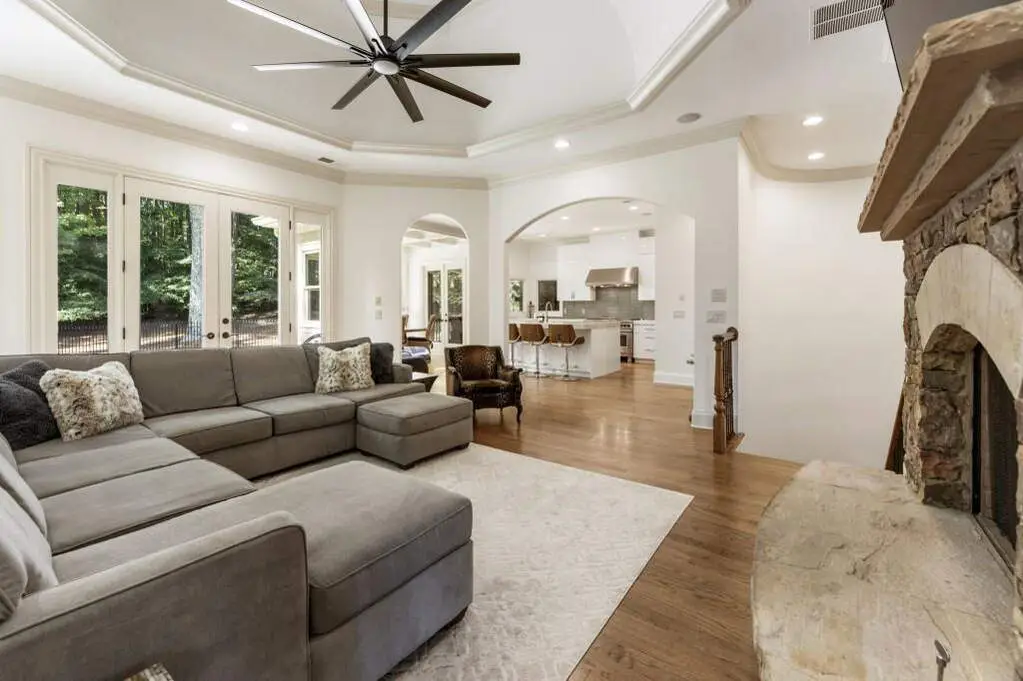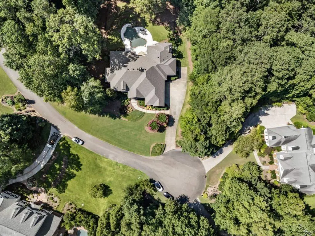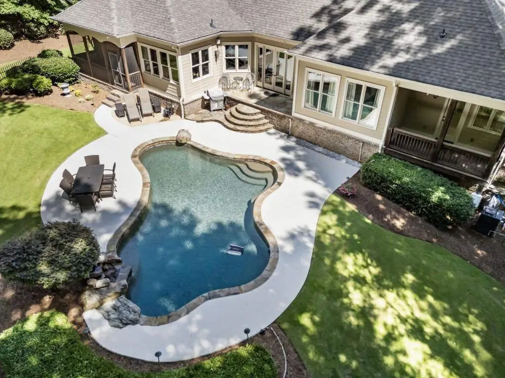 Welcome to this beautifully updated one level ranch style home that offers walk-out on the main level to your outdoor oasis featuring a gunite sparkling pool, a screened porch, and lots of outdoor entertaining space. This gorgeous home is located in Forsyth county and situated at the end of a quiet cul-de-sac in gated enclave of luxury homes. The charming front porch offers a warm welcome and sets the tone for the comfort and quality found throughout the property. Upon entering through the front door, you are greeted by a formal dining room on your right and a private study on your left, complete with built-in bookcases. This thoughtful layout creates a balanced and inviting entry that leads effortlessly into the main living space. The heart of the home features an open-concept kitchen design with this oversized island that offers seating and open concept. The completely modernized kitchen with all new appliances opens to the living room and screened porch. A centrally located fireplace serves as a warm and welcoming focal point, perfect for both everyday living and entertaining. Just off the kitchen, a screened-in back porch with its own fireplace offers a comfortable outdoor living space that can be enjoyed year-round. The primary suite is a peaceful and well-appointed space. The ensuite bathroom features separate dual vanities, two walk-in closets, and a large walk-in shower. A private bonus room, currently used as a home gym, adds function and flexibility. A second bedroom with ensuite is also located on the main floor. The fully finished basement includes two additional bedrooms, two full bathrooms, one half bathroom, a generous media room, and a wet bar. The lower level offers multiple flexible living spaces ideal for craft room, media space, movie room, ping pong or pool table room perfect for entertaining & hosting guests. Every major system has been thoughtfully updated including pool heater, HVAC, water heaters, roof replaced and freshly painted interior