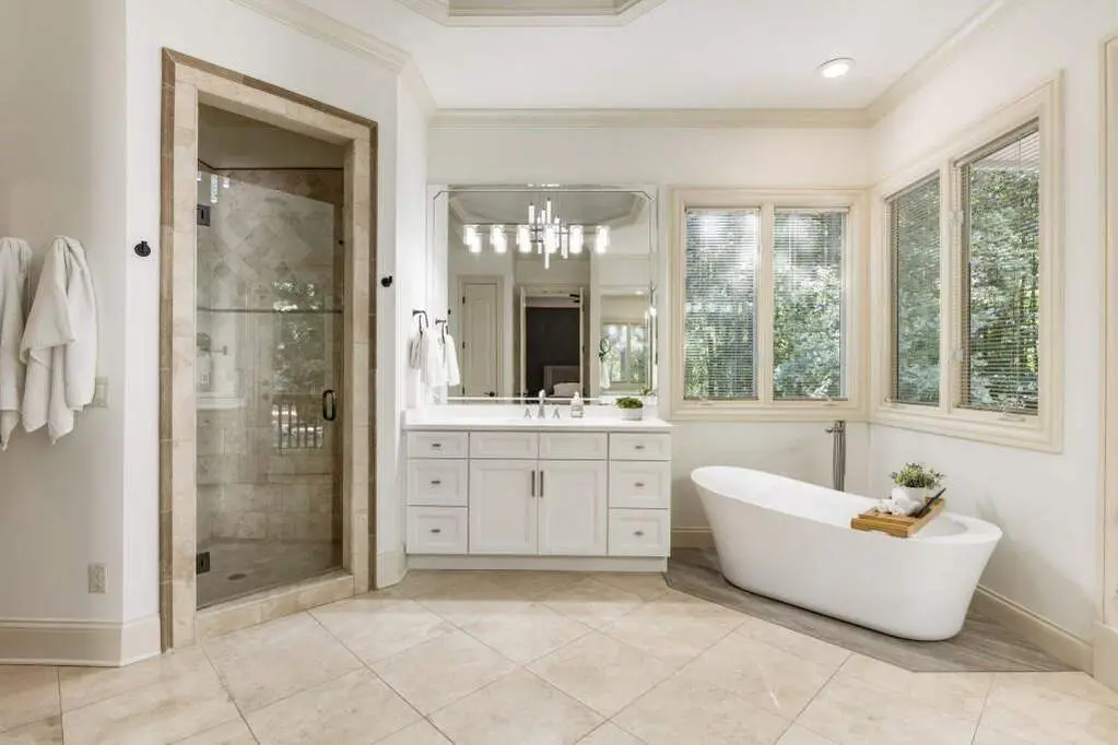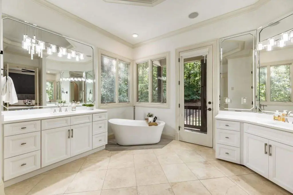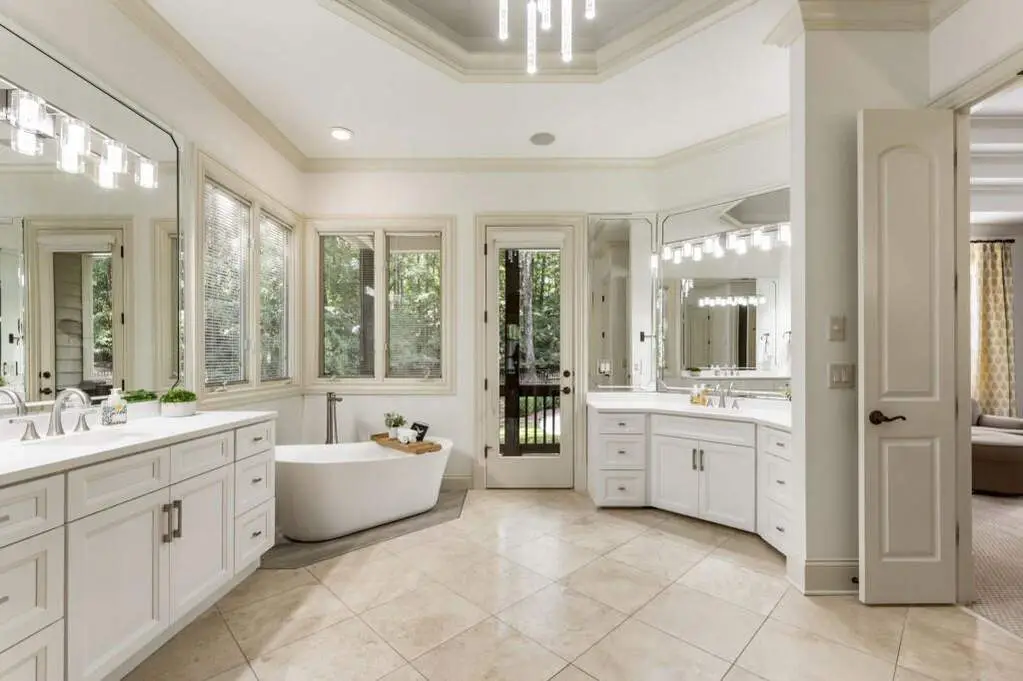 Ensuite bathroom with dual vanities and walk-in shower