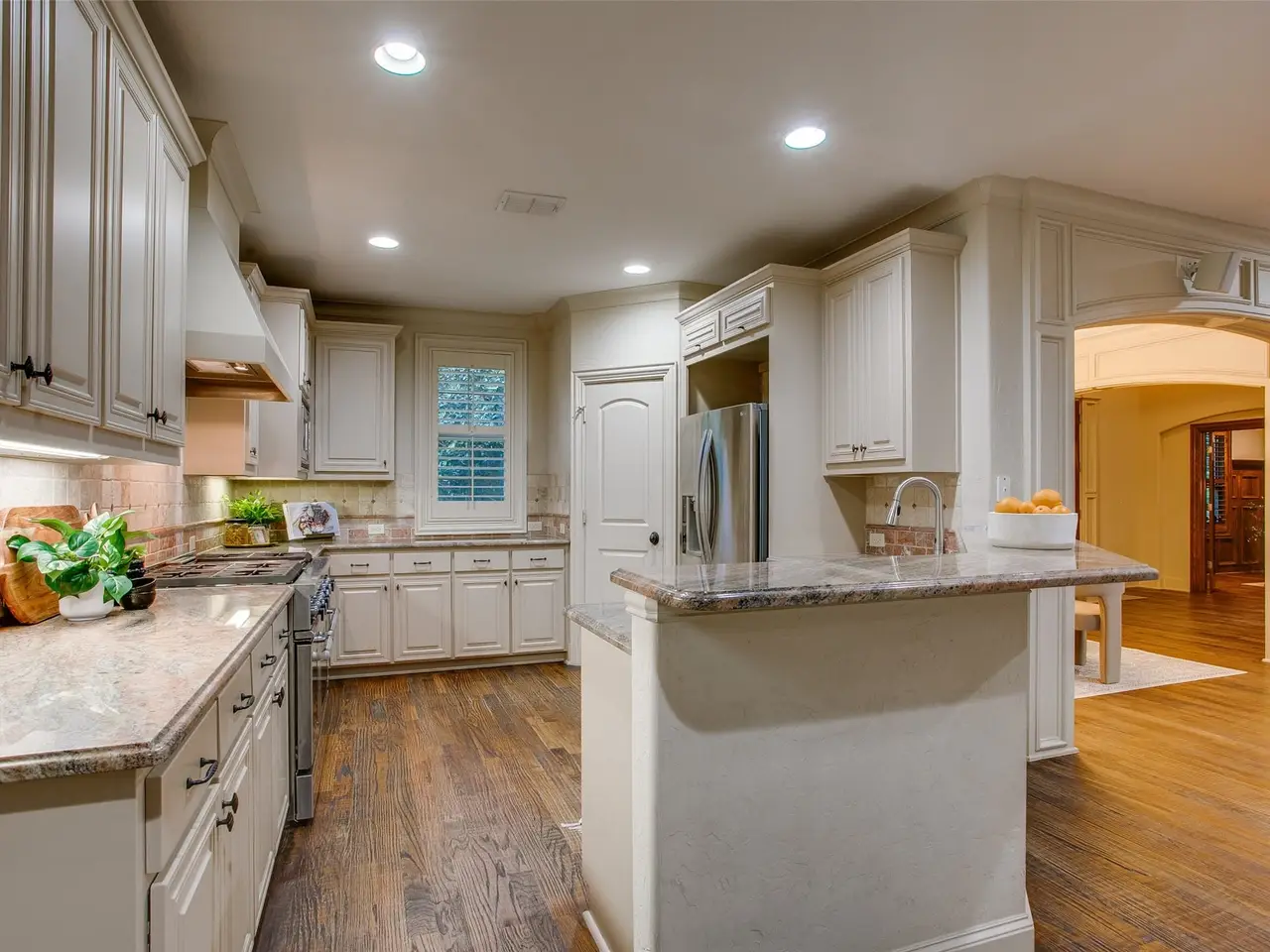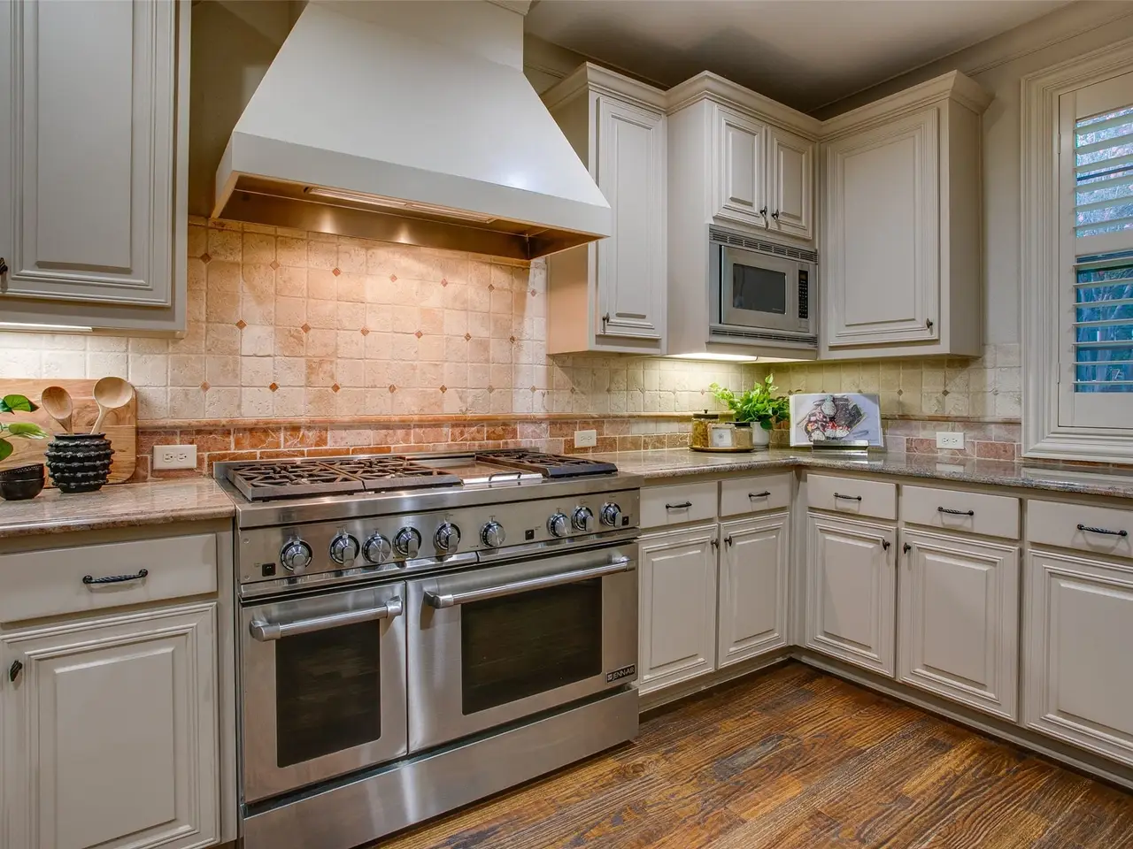 • Kitchen with granite counters and professional gas range