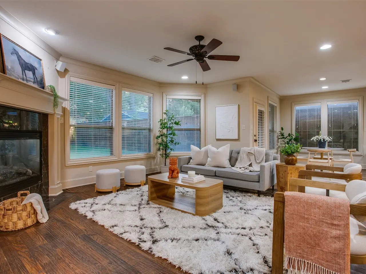 • Living room framed by fireplace and expansive windows