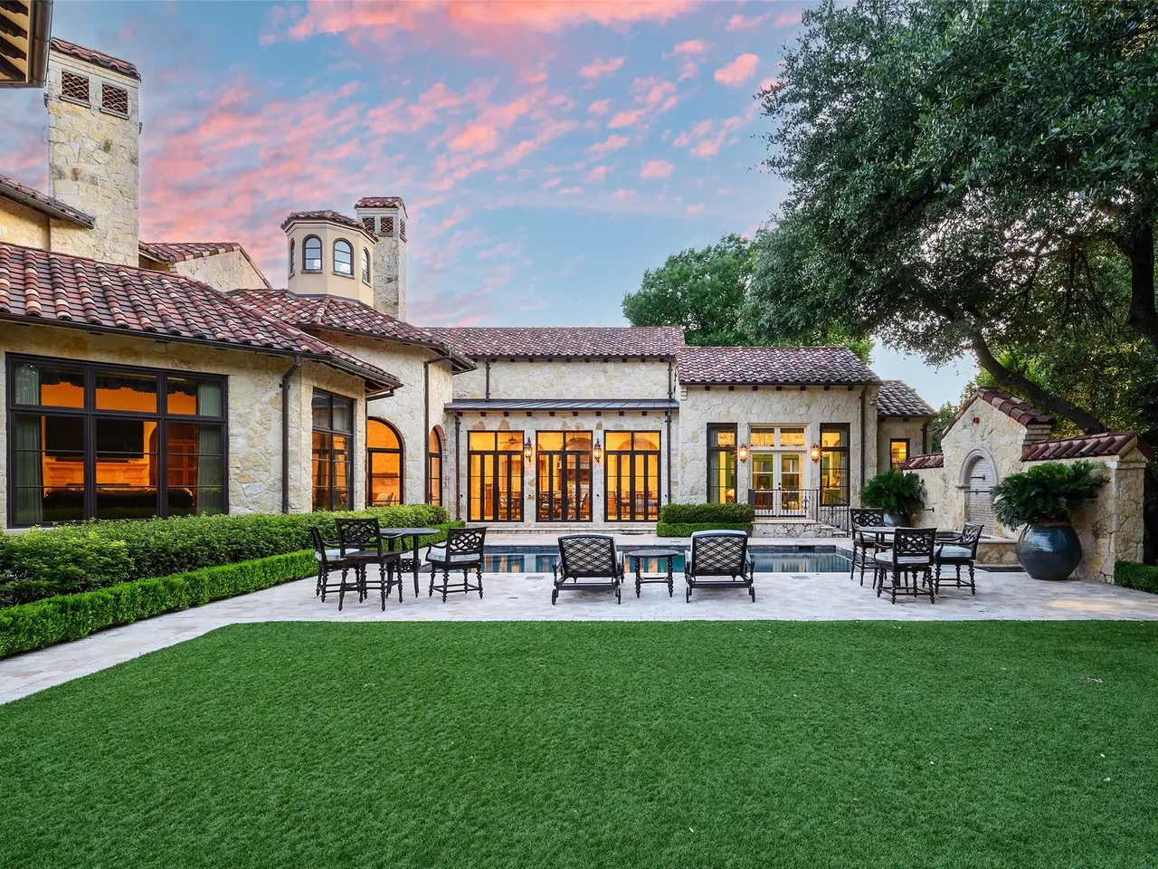 Inspired by the grand villas of the Tuscan countryside, this commanding, completely gated estate at 5335 Meaders Lane rests on a lot and a half. Its expansive presence stretching nearly a block along one of Preston Hollows most admired neighborhoods in Mayflower Estates. Designed by noted architect Elby Martin and built by Bob Thompson, one of Dallas’ most respected high-end builders, this residence captures the soul of a Tuscan mansion with modern livability. From the Italian-barrel tile roof to stately stone exteriors, every detail feels authentic. Lush grounds unfold over 1.1 acres, enhanced by moonlit mature trees, two courtyards, including a private meditation garden, and four hand-crafted fountains. Multiple verandas, terraces, and six balconies - all with beautiful sweeping views - create effortless indoor-outdoor living. A resort-style pool with cascading spouts, a just-completed sport court, and a fully appointed cabana with kitchen, fireplace, and dome ceiling set the stage for year-round entertaining. The property also offers a 1,159 square foot attached guest or au pair house with its own private exterior staircase and convenient parking pads. Inside, artistry and craftsmanship abound: a 24-foot ceiling entry with custom Solara iron stair, a 70-ft groin-vaulted gallery with hand-painted Italian frescoes, wine cellar and tasting room, billiard and game rooms, and a media room with motorized recliners. Clerestory windows frame sweeping estate views, underscoring the home’s connection to its surroundings. With geothermal HVAC, a recently installed whole-house generator, and thoughtful design, this is an extraordinary Tuscan-inspired retreat - expansive in scale, commanding in presence, and unrivaled in its Dallas setting.