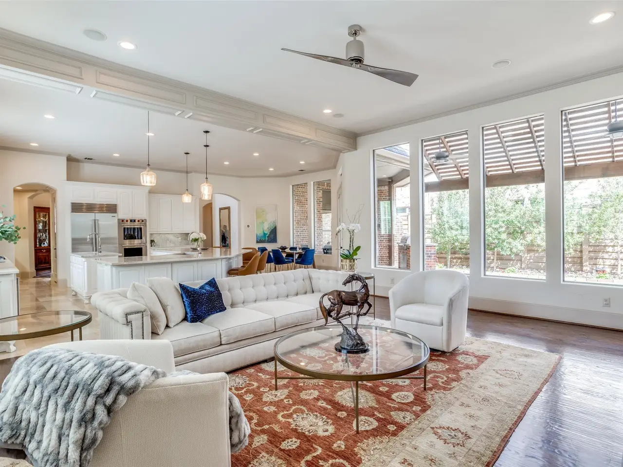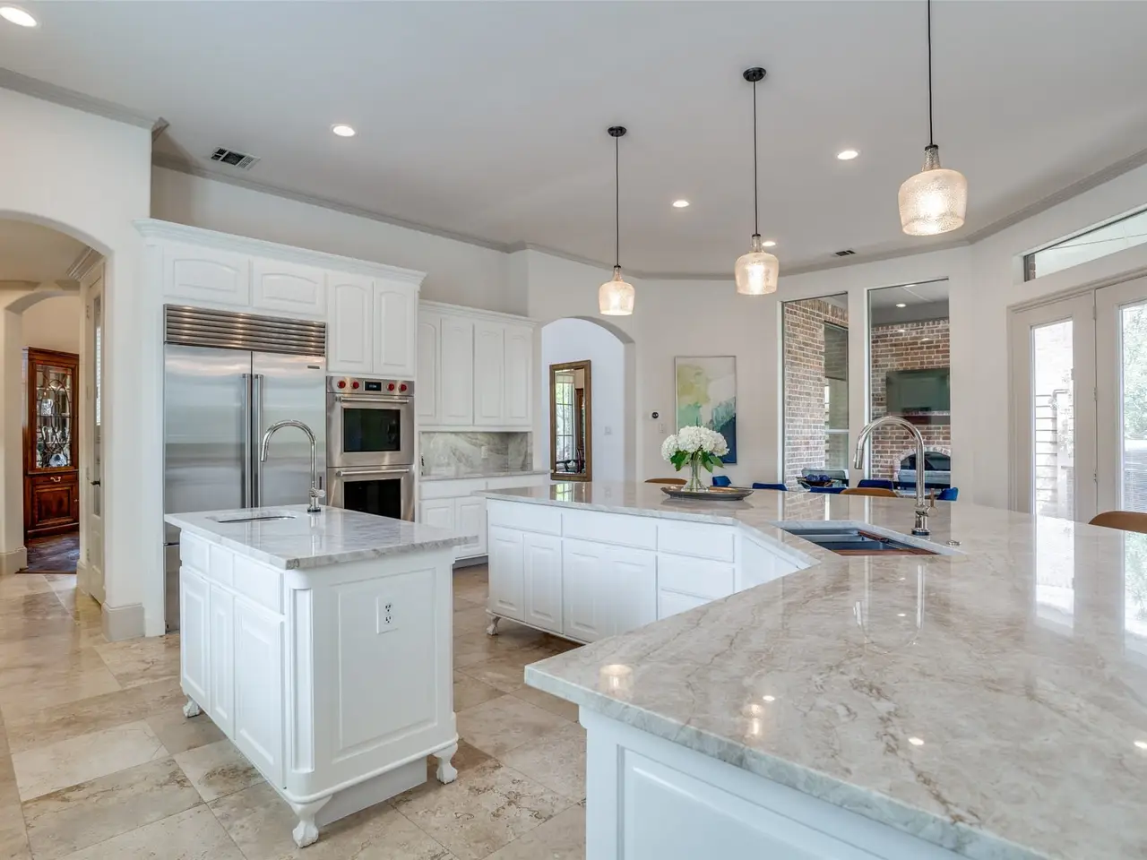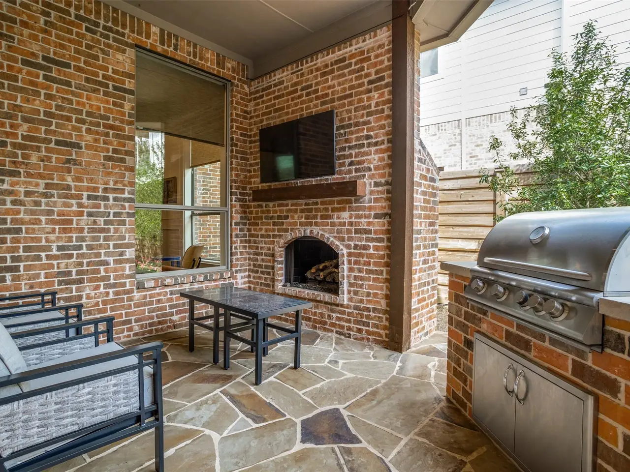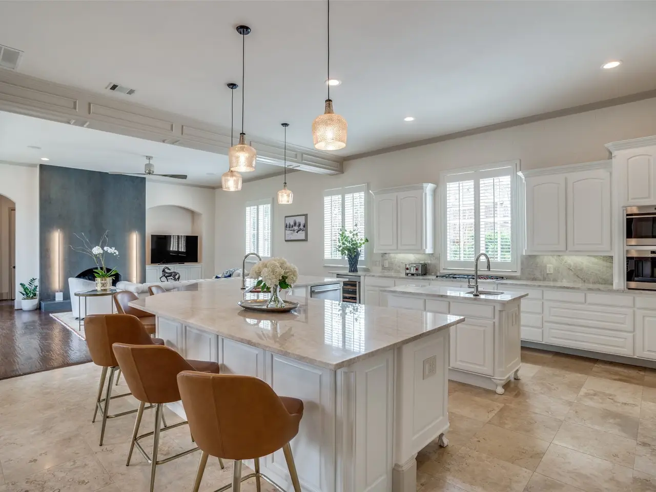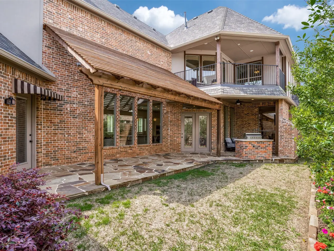 Nestled on a quiet, stately corner lot the exceptional craftsmanship and thoughtful floor plan make this home a standout. The light-filled great room showcases a floor-to-ceiling gas fireplace and spacious secondary dining area, flowing seamlessly into the chefs dream kitchen, updated with Sub-Zero and Wolf M Series appliances, built-in coffee system, wine bar, expansive quartzite surfaces, a butlers pantry, and extensive custom cabinetry. The first-floor primary suite is a private retreat with cathedral ceilings, a spa-like bath featuring a double shower, freestanding soaking tub, and striking book-matched marble. A secondary bedroom with its own bath and cedar closet is also located on the first floor; making it ideal for guests or multigenerational living. Upstairs offers two generously sized bedrooms, each with ensuite baths, a spacious game room with wet bar, a dedicated media room, and a large covered balcony; perfect for evening entertaining or quiet relaxation. A low-maintenance outdoor living area with built in grill, mosquito misting system, and a fireplace are added bonuses.