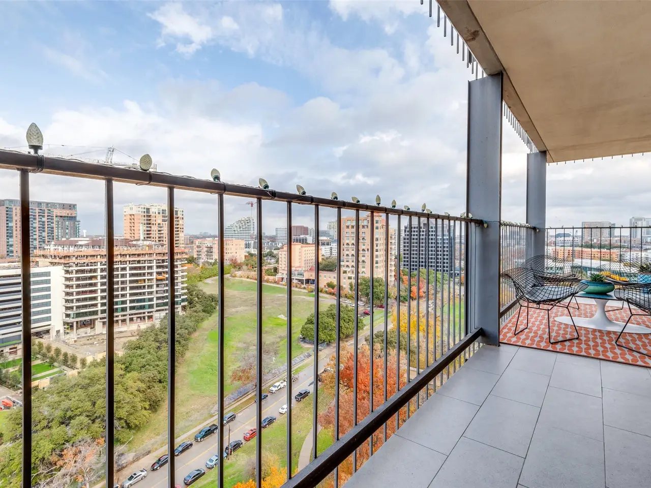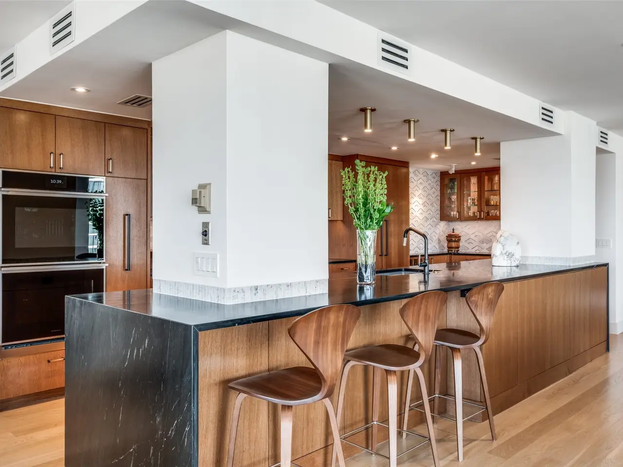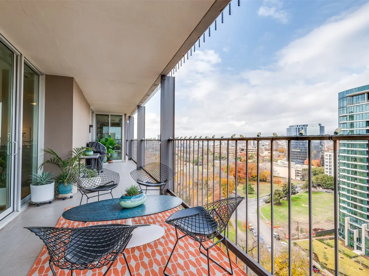 Discover the pinnacle of high-rise living with this reimagined corner penthouse in Park Towers, showcasing a complete renovation of timeless elegance and modern sophistication. Every detail of this expansive residence has been thoughtfully designed to blend luxury, comfort, and effortless style. The heart of the home is an impressive kitchen, where custom cabinetry, soapstone counters, and premium appliances create a refined culinary experience. Open to multiple living and dining areas, the layout invites seamless entertaining while maintaining intimate spaces for daily living. Walls of glass frame breathtaking panoramic views, while a sleek fireplace anchors the main living area with warmth and ambiance. The primary suite is a true retreat, featuring a spa-inspired bath, extraordinary closet space, and a private balcony for moments of quiet reflection. The guest suite offers generous proportions and an integrated office-study, while a versatile third bedroom doubles as an additional living area with pocket doors and a custom Murphy bed, perfect for flexibility and hosting. Expansive outdoor balconies provide the ultimate extension of the living space, with abundant room for dining, entertaining, or cultivating a private garden against the backdrop of the city skyline. Recent upgrades include new windows, sliding doors, plumbing, electrical, HVAC systems, and striking white oak hardwoods throughout. Intelligent storage solutions, such as a butler’s pantry, dedicated entertaining closet, and spacious utility room, enhance the functionality of the home without compromising style. Park Towers itself offers residents an unparalleled lifestyle with first-class service and security, community lounges, fitness center, pool, and direct access to the Katy Trail. With all utilities included in the HOA, this penthouse represents a rare opportunity to own a residence where design, convenience, and luxury converge in perfect harmony. Designed by Mitchell Garman Architects.