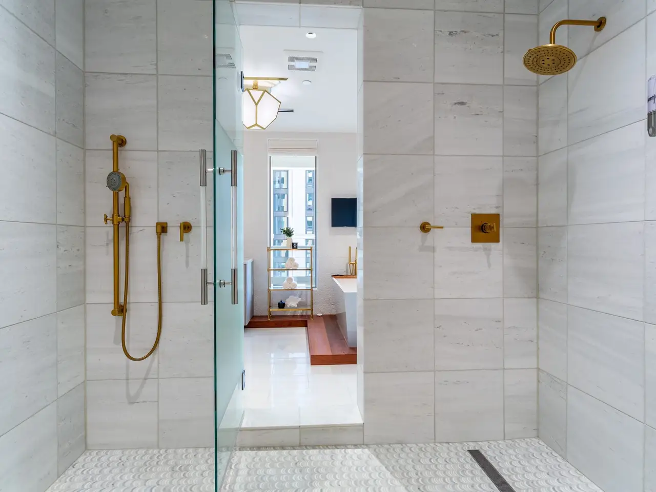 • Hand-painted embroidered wallpaper in Primary Suite Spacious balconies with skyline views