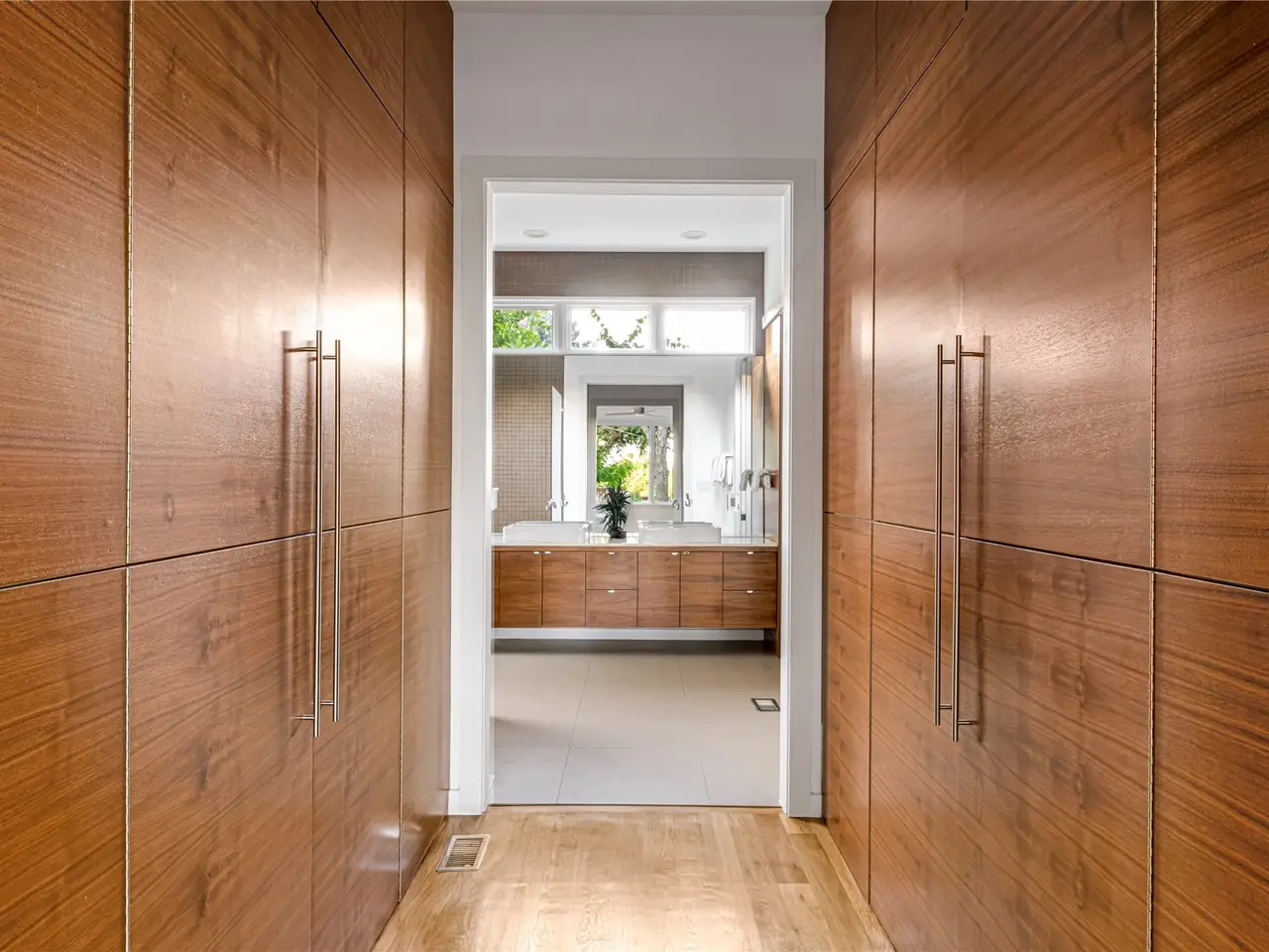 • Serene primary bathroom with grain-matched cabinetry