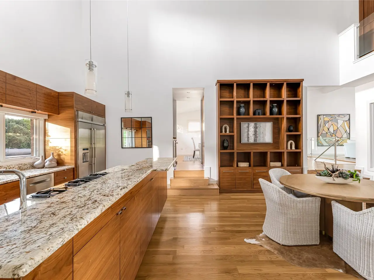 • Custom walnut cabinets with grain matching for harmony and balance