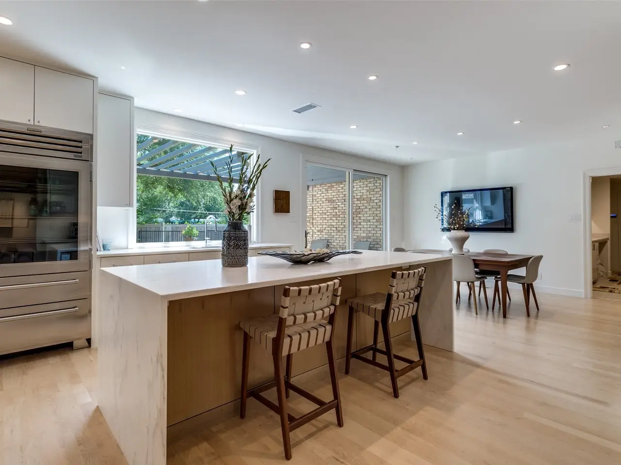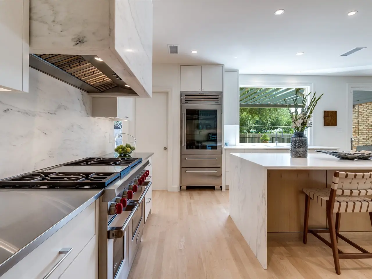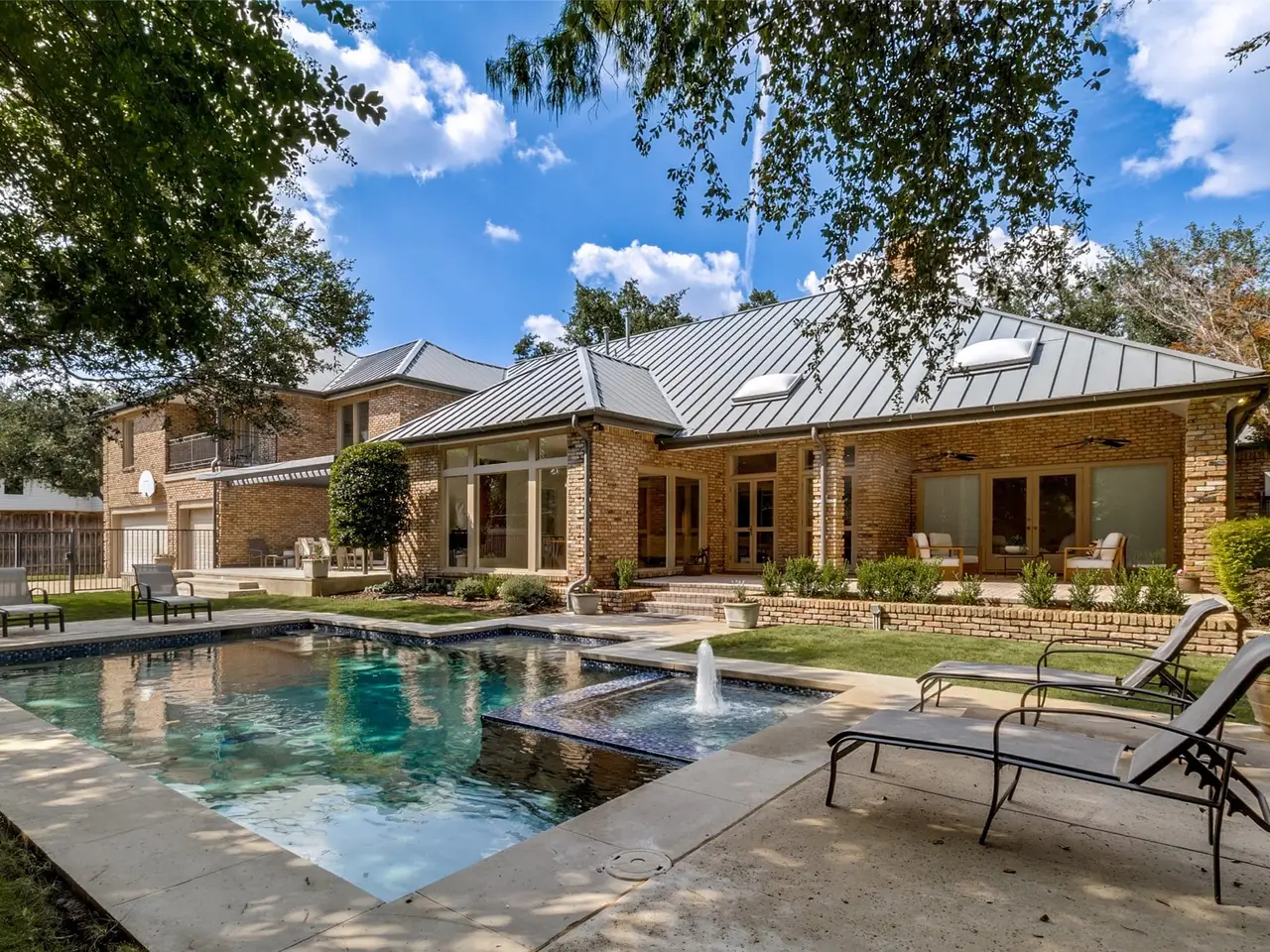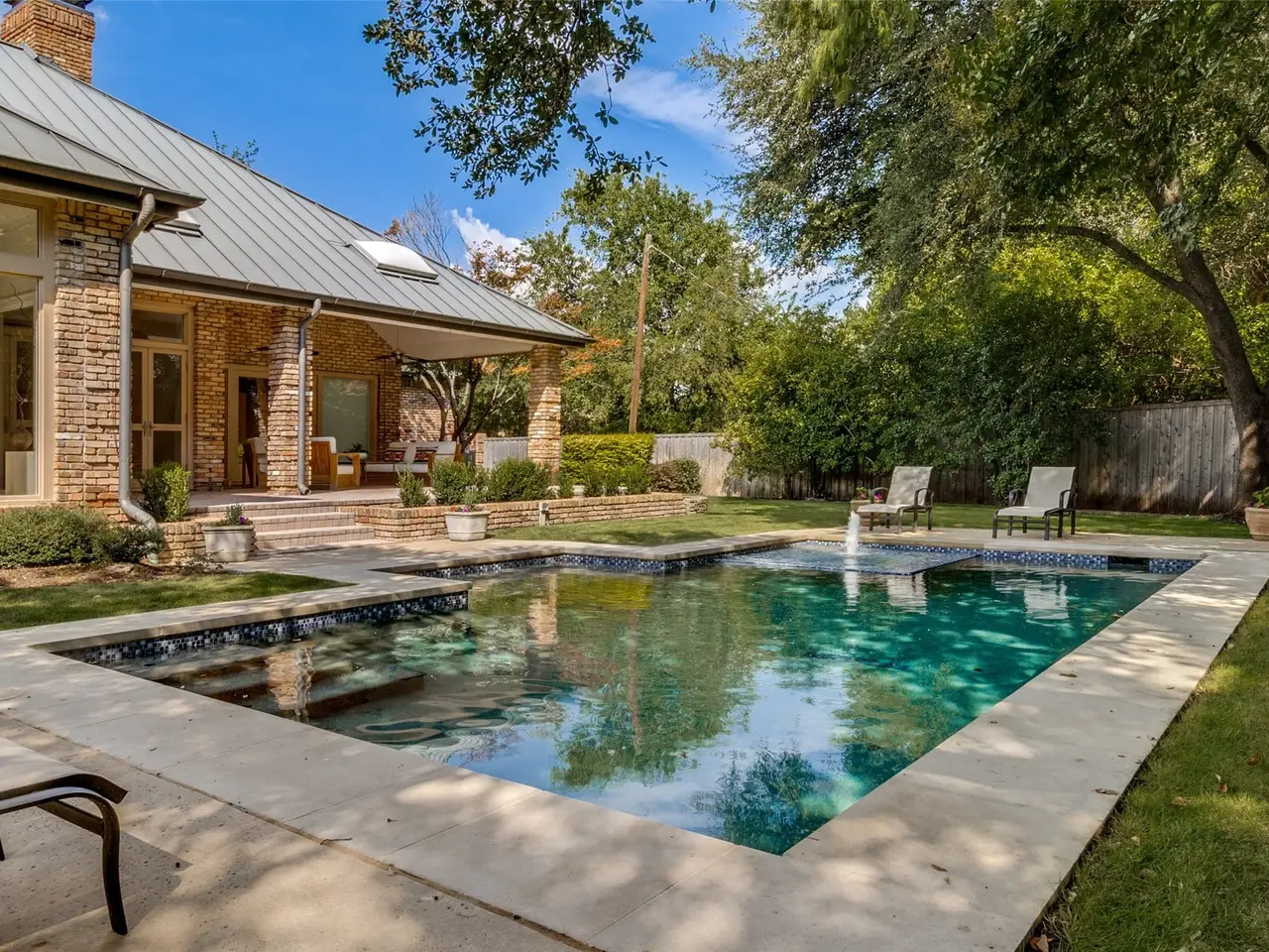At the end of a quiet street, next to a charming city park sits 5606 Dittmar Place - a home that blends thoughtful design with luxurious living. Extensively remodeled in 2020-2021 (by Architectural Firm: Bernbaum Magadini) the interiors are now open, bright and finished with the highest quality materials. Step inside to a spacious living room with soaring ceilings and a cozy fireplace. The dining room, framed by dramatic floor-to ceiling windows, overlooks the beautifully landscaped backyard, complete with a pool, spa and generous grassy areas for play and entertaining. The primary suite is a true retreat, featuring its own fireplace, private patio, and spa-like bath with Danby Marble vanities, a soaking tub, separate shower, and 2 oversized walk-in closets. A chic powder room is conveniently located nearby for guests. The chef's kitchen has been completely reimagined with a marble-topped island, Subzero glass-door refrigerator & freezer, Wolf 6-burner range, and a bar equipped with a wine cooler and ice maker. Just beyond, a functional office with a full bath and the more casual den with a third fireplace offers versatile main-level living. Upstairs, you'll find a secondary office and lounge, a guest room with ensuite bath, and 2 additional bedrooms sharing a travertine-appointed bath. A flexible exercise or studio space completes the second floor. So much storage and a 3 car garage. Sophisticated, with clean-lines and move-in ready, this home offers an elegant lifestyle in one of the area’s most peaceful settings.