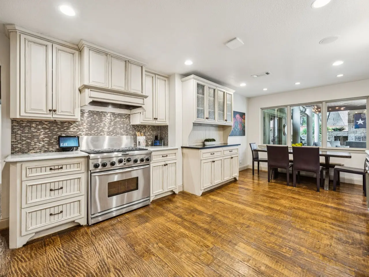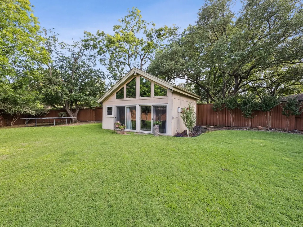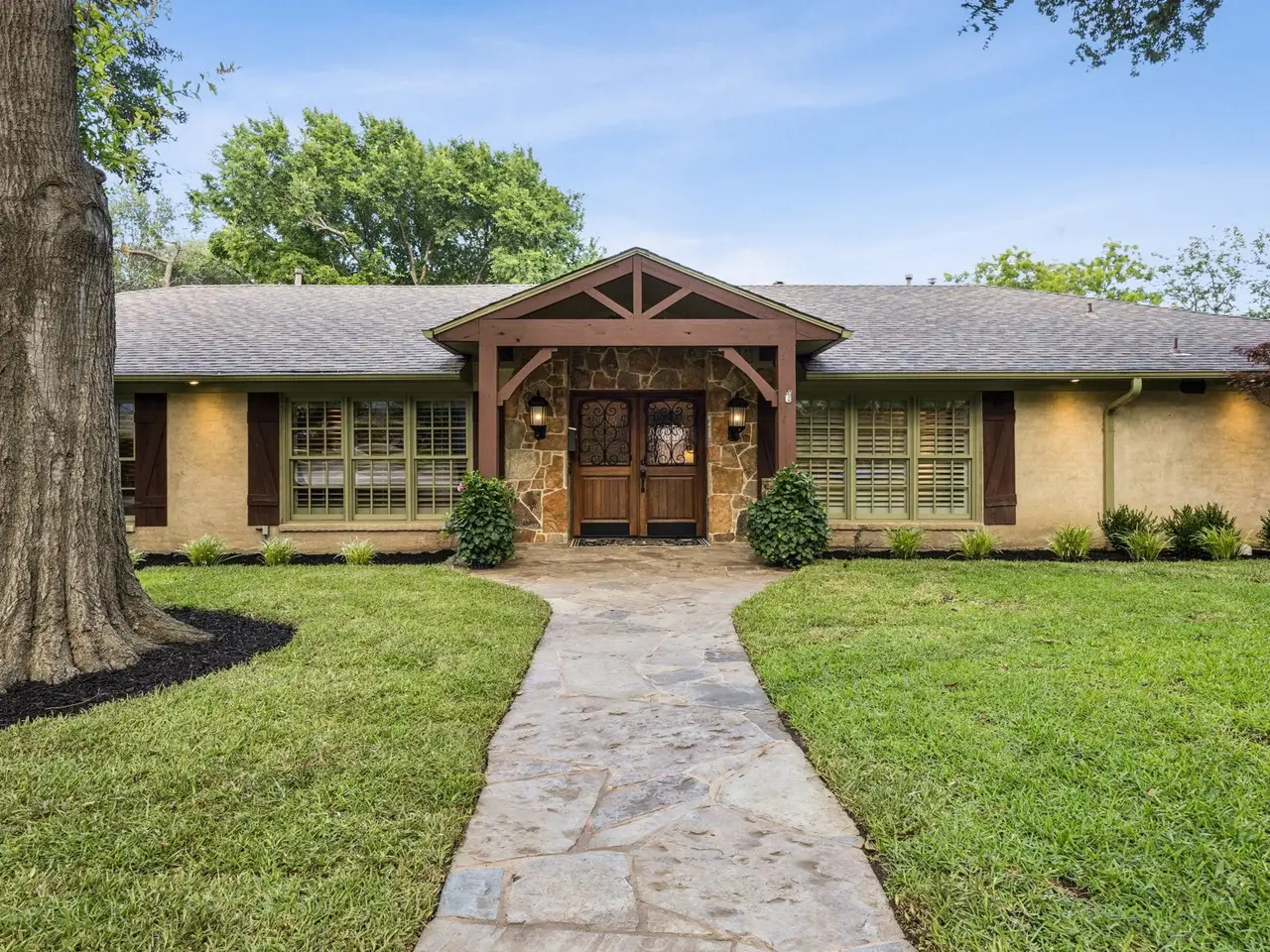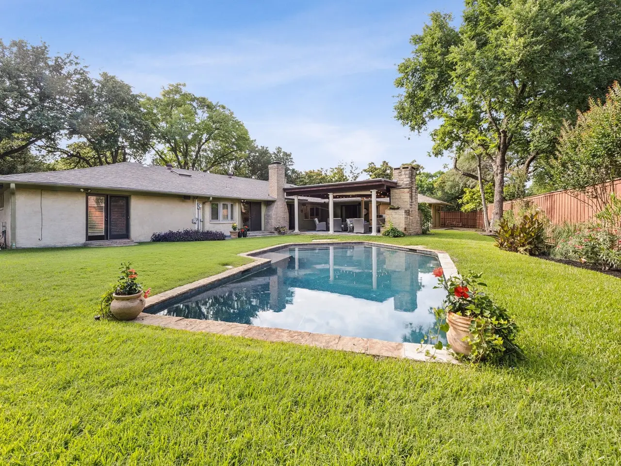 Discover timeless elegance and everyday comfort in this beautifully updated single-story ranch home, ideally situated on nearly half an acre in a quiet cul-de-sac in the heart of Preston Hollow's Windsor Park neighborhood. The open-concept layout features a spacious island kitchen and breakfast nook that flow seamlessly into a vaulted living room with wood beam accents and a gas log fireplace. A private office and formal dining room offer flexible spaces for work or entertaining, while a thoughtful split floor plan provides exceptional privacy. The expansive primary suite includes dual walk-in closets and additional wardrobe storage, with two guest bedrooms nearby. A separate guest suite and a private game room, easily used as a fifth bedroom, adds versatility. Practical highlights include an oversized mudroom, abundant storage, and a oversized two-car garage. The lush backyard retreat is perfect for relaxing or entertaining, with a sparkling pool, covered patio with fireplace, and a full guest house complete with kitchen, bathroom, and Murphy bed.