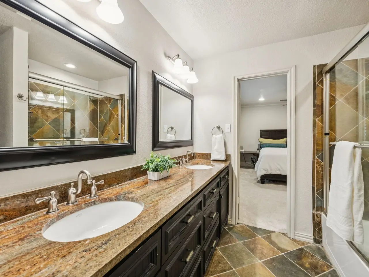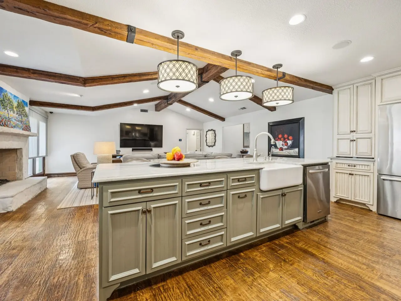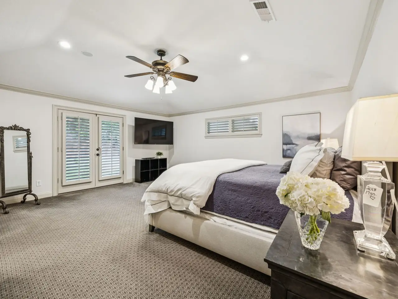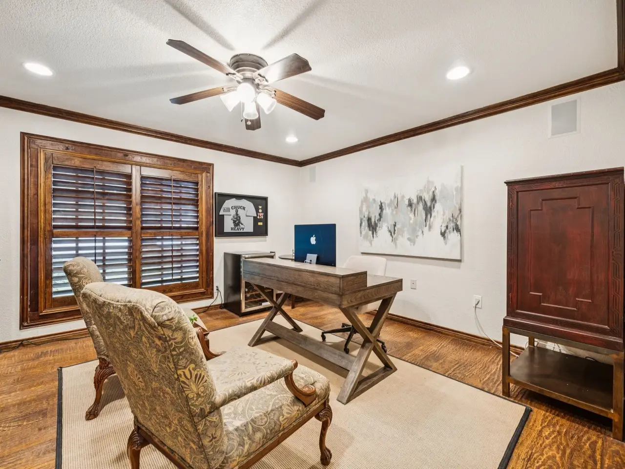 Discover timeless elegance and everyday comfort in this beautifully updated single-story ranch home, ideally situated on nearly half an acre in a quiet cul-de-sac in the heart of Preston Hollow's Windsor Park neighborhood. The open-concept layout features a spacious island kitchen and breakfast nook that flow seamlessly into a vaulted living room with wood beam accents and a gas log fireplace. A private office and formal dining room offer flexible spaces for work or entertaining, while a thoughtful split floor plan provides exceptional privacy. The expansive primary suite includes dual walk-in closets and additional wardrobe storage, with two guest bedrooms nearby. A separate guest suite and a private game room, easily used as a fifth bedroom, adds versatility. Practical highlights include an oversized mudroom, abundant storage, and a oversized two-car garage. The lush backyard retreat is perfect for relaxing or entertaining, with a sparkling pool, covered patio with fireplace, and a full guest house complete with kitchen, bathroom, and Murphy bed.
