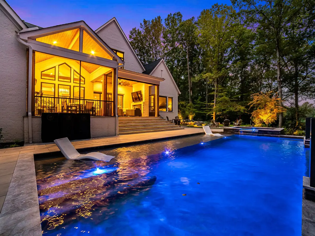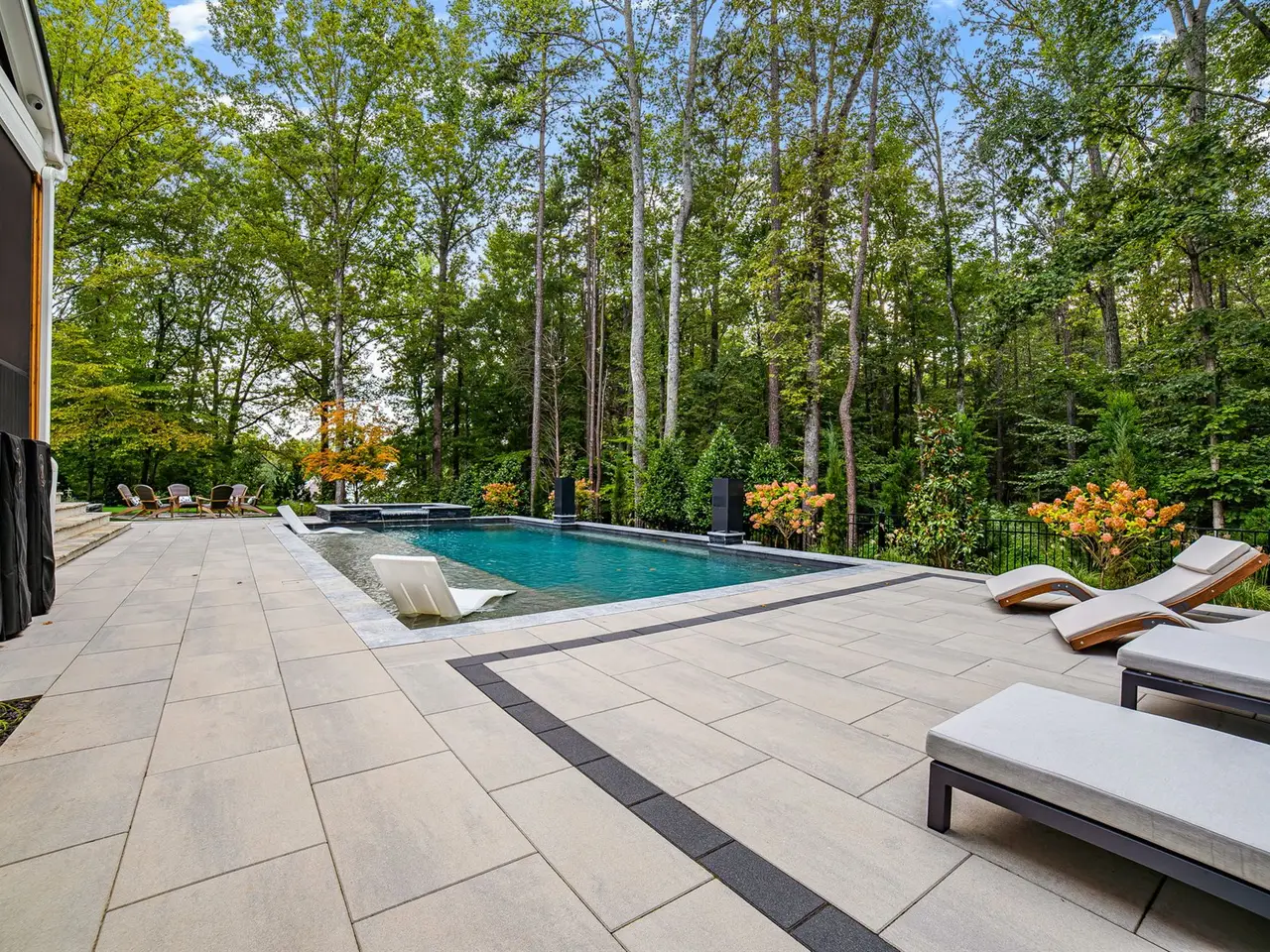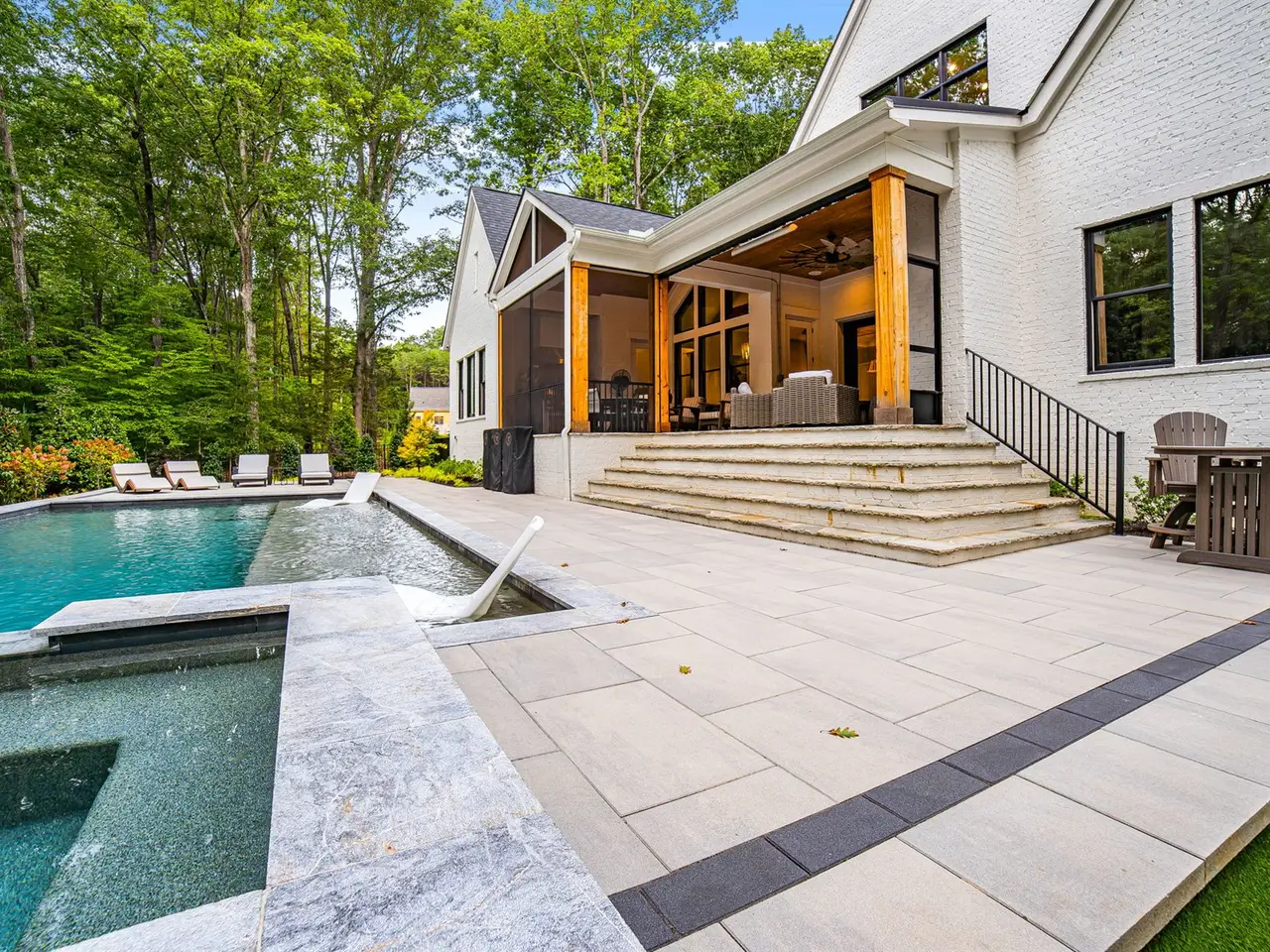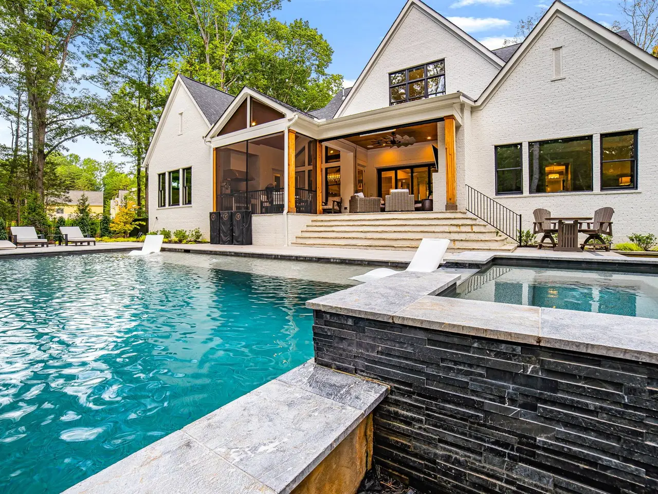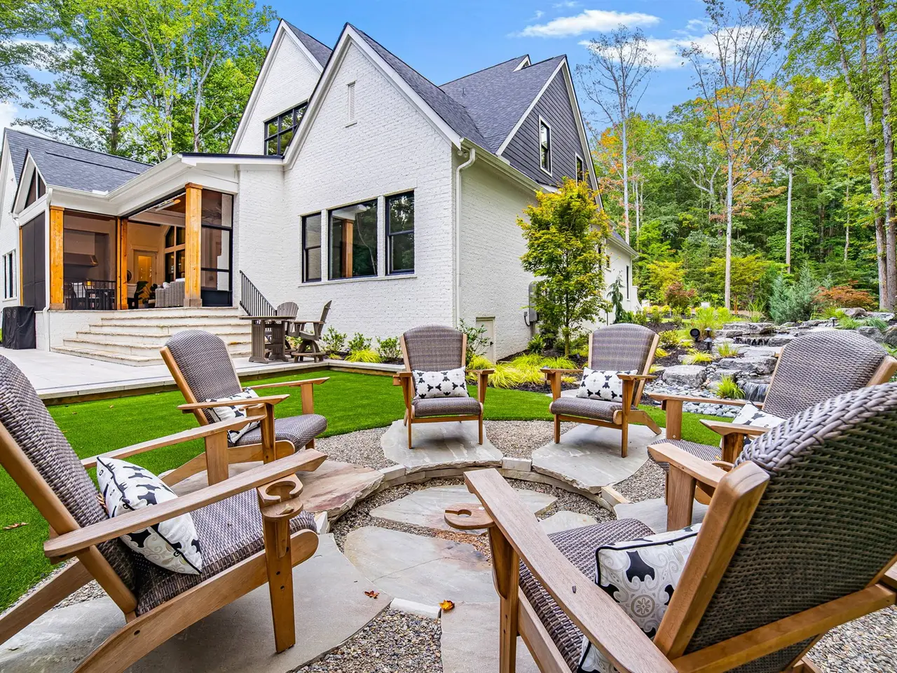 Experience unmatched privacy and modern luxury in this fully custom 2023 estate, perfectly situated on over 3.4 acres in Maple Grove, a boutique six-lot subdivision. From the moment you arrive, the gated entry with brick columns and sweeping front lawn framed by manicured landscaping create a commanding first impression.The home's thoughtful design blends sophistication and comfort with soaring vaulted and beamed ceilings, custom millwork, and designer lighting throughout. The chef's kitchen showcases natural Vancouver Quartzite with a double-edge island, 6-burner range with griddle and hearth oven, pot filler, hidden walk-in pantry and outlets, complemented by a separate scullery with a full second kitchen, Italian handmade backsplash tile, and abundant storage. Pocket doors add privacy to multiple spaces including the library/media room and guest suites.Retreat to the serene primary suite with spa-inspired bath, custom closets, and marble finishes. Additional highlights include glazed Italian porcelain tile baths, custom built-ins, herringbone wood floors, and three Monogram wine/beverage fridges across the bar, library/media room, and outdoor kitchen. Outdoor living takes center stage with a resort-style pool and spa, expansive veranda with retractable screen, fire pit, and an inspired backyard retreat featuring a flowing river stream, tiered putting green, and dramatic landscape lighting. Extensive drainage improvements further enhance the property's functionality and value. Backing to Fisher Farm Park and the Davidson Greenway, this private estate combines natural beauty, luxury finishes, and exceptional craftsmanship in one extraordinary package!