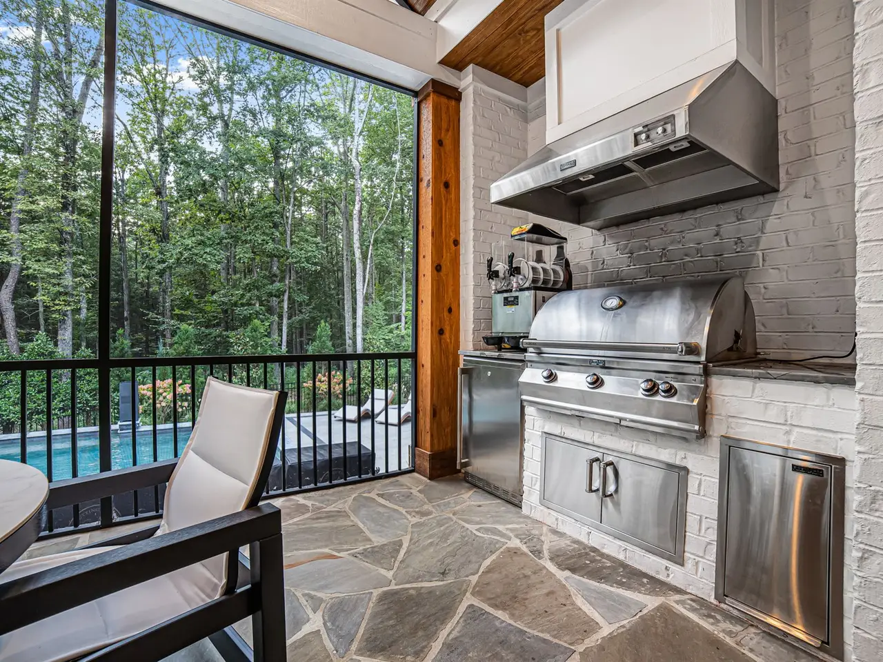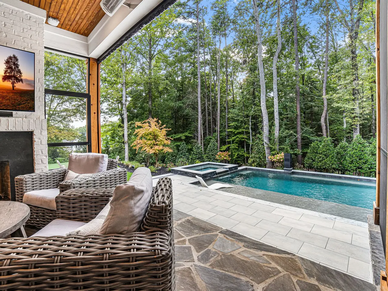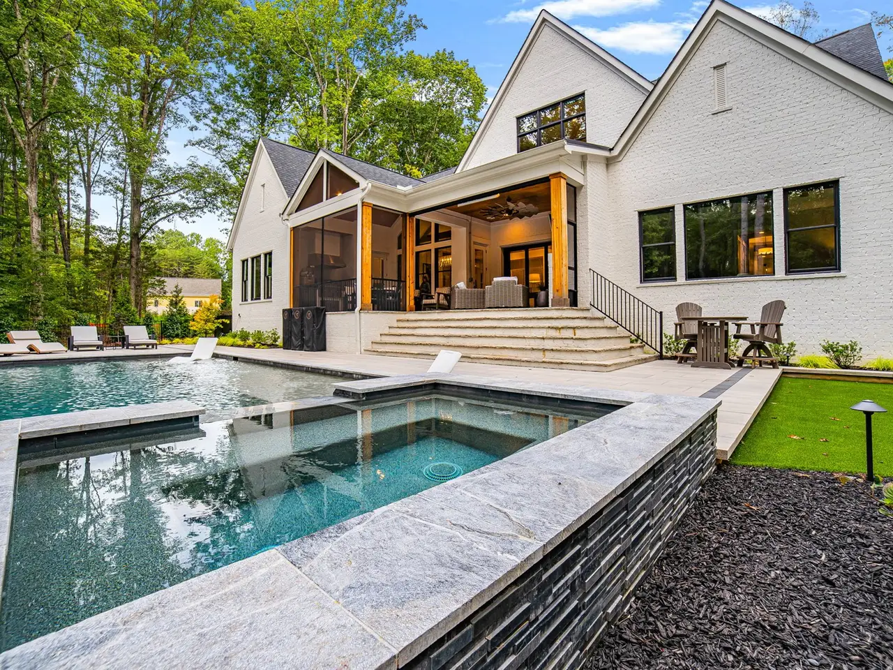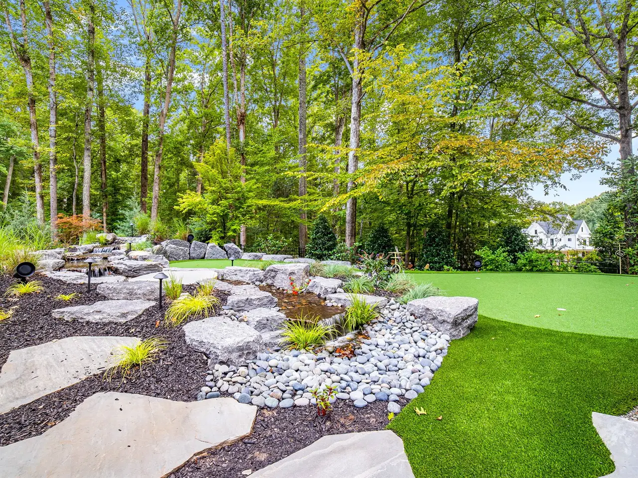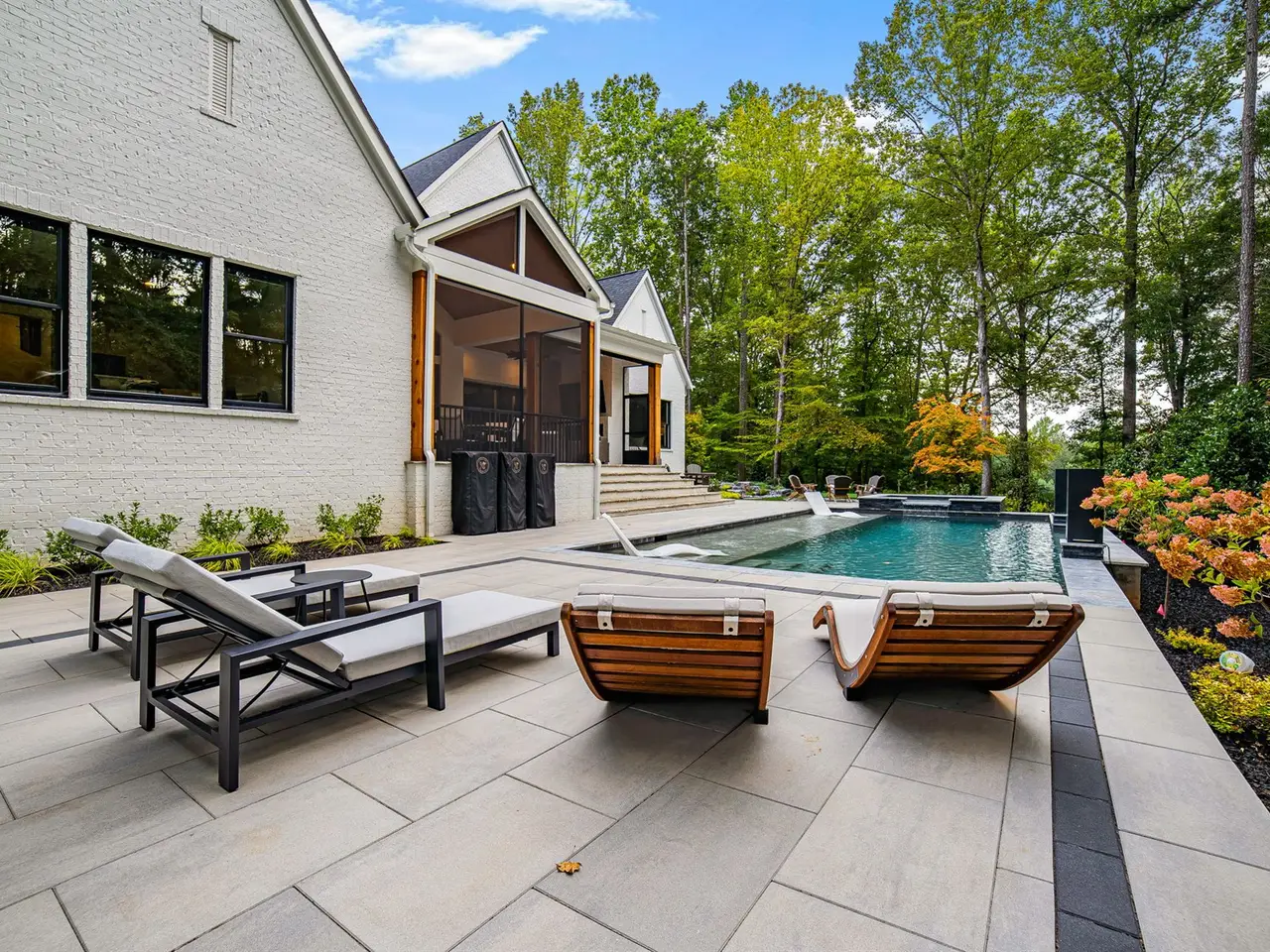 Experience unmatched privacy and modern luxury in this fully custom 2023 estate, perfectly situated on over 3.4 acres in Maple Grove, a boutique six-lot subdivision. From the moment you arrive, the gated entry with brick columns and sweeping front lawn framed by manicured landscaping create a commanding first impression.The home's thoughtful design blends sophistication and comfort with soaring vaulted and beamed ceilings, custom millwork, and designer lighting throughout. The chef's kitchen showcases natural Vancouver Quartzite with a double-edge island, 6-burner range with griddle and hearth oven, pot filler, hidden walk-in pantry and outlets, complemented by a separate scullery with a full second kitchen, Italian handmade backsplash tile, and abundant storage. Pocket doors add privacy to multiple spaces including the library/media room and guest suites.Retreat to the serene primary suite with spa-inspired bath, custom closets, and marble finishes. Additional highlights include glazed Italian porcelain tile baths, custom built-ins, herringbone wood floors, and three Monogram wine/beverage fridges across the bar, library/media room, and outdoor kitchen. Outdoor living takes center stage with a resort-style pool and spa, expansive veranda with retractable screen, fire pit, and an inspired backyard retreat featuring a flowing river stream, tiered putting green, and dramatic landscape lighting. Extensive drainage improvements further enhance the property's functionality and value. Backing to Fisher Farm Park and the Davidson Greenway, this private estate combines natural beauty, luxury finishes, and exceptional craftsmanship in one extraordinary package!
