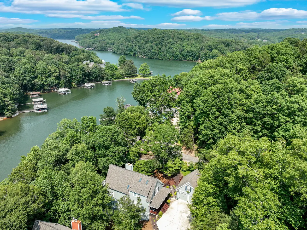 Discover the perfect blend of charm and functionality in this spacious craftsman home on Lake Lanier, offering plenty of room for family and friends! Thoughtfully designed with a resort-style feel, this property features two great rooms with stone fireplaces, two kitchens, and four covered porches ideal for entertaining in every season. Located in a prime Dawsonville spot just 30 minutes north of Atlanta and 15 minutes south of the Dahlonega wineries and fall festivals, this home is nestled in a secluded Lake Lanier neighborhood. Tucked away behind gates in a private three-home enclave, it sits just steps from the water on a protected deep-water cove. Enjoy easy lake access from your private twin-slip dock with a party deck perfect for sunbathing and gatherings, with calm waters ideal for swimming and floating. Inside, the main level features an open floor plan with a two-story vaulted ceiling and stone fireplace, hardwood floors, a spacious kitchen with an island, two bedrooms, and a full bath. The upstairs owner's suite includes a loft sitting area, ideal for a reading nook or office space, and offers serene views. The finished terrace level mirrors the main level layout, complete with a second kitchen, two bedrooms, and a full bath perfect for guests or multi-generational living. The unfinished daylight basement offers even more potential for game rooms, storage, or lake toys. A detached two-car garage with an upstairs storage room adds extra flexibility. With ample parking for trailers and visitors, the shared gated driveway serves just three homes. No HOA, but residents share annual maintenance costs (approximately $600-700 per year) for the gate and common landscaping. Ideal for full-time living or Airbnb potential, this home offers a unique opportunity to enjoy the best of lake life!