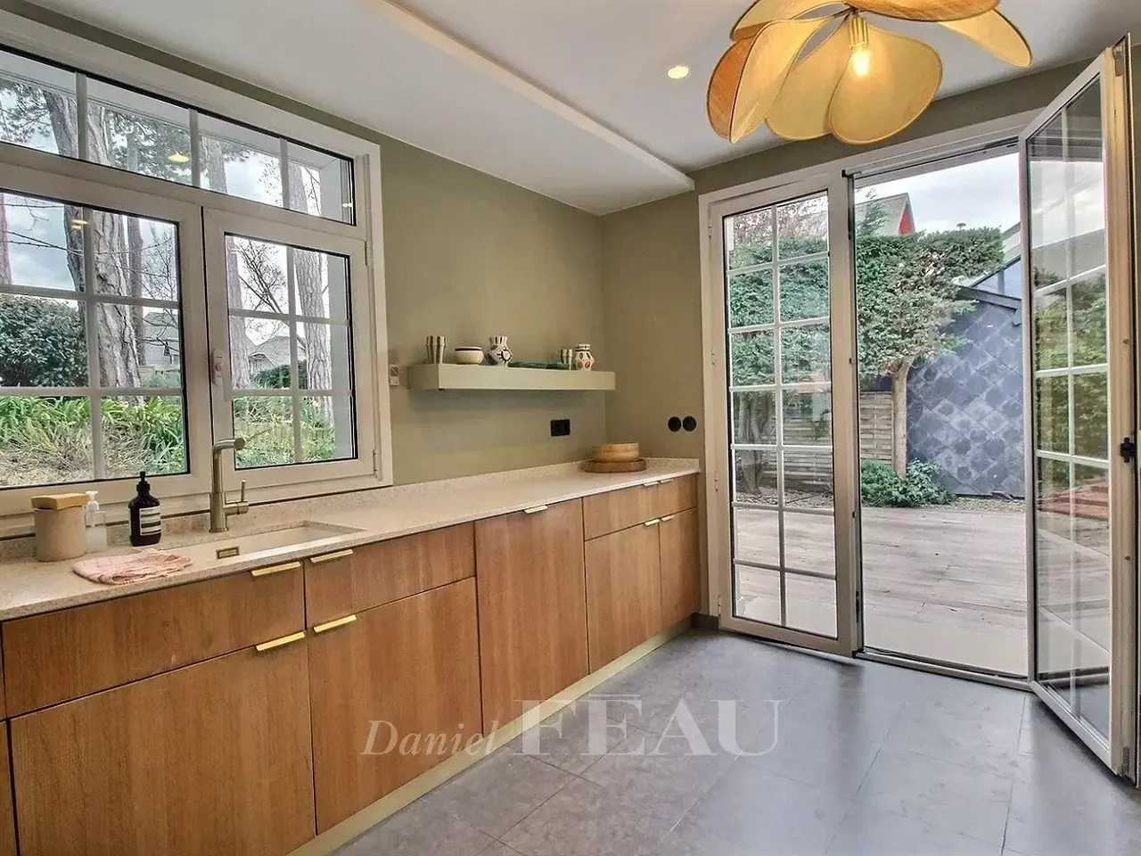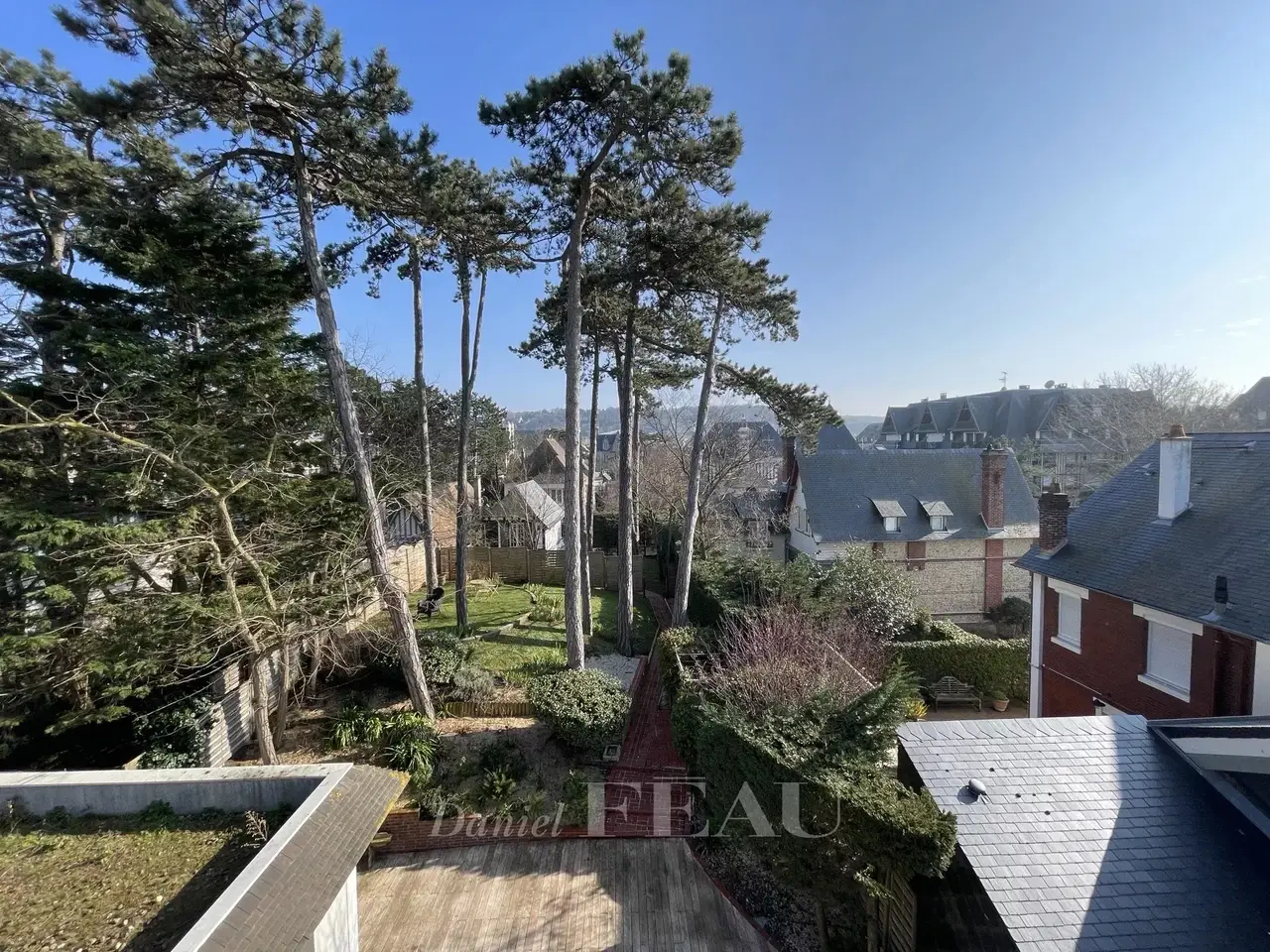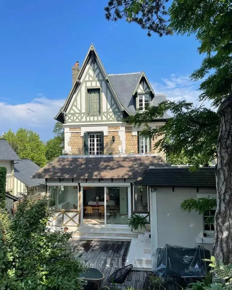 EXCEPTIONAL PROPERTY IN EXCELLENT CONDITION TERRACES AND LANDSCAPED GARDEN. This property comprises a generously proportioned villa in excellent condition and a comfortable guest house. Large sunny terraces and landscaped walled garden. The main house, typical of Deauville bourgeois villas, comprises: an entrance hall, a vast, bright reception room with fireplace, a dining room and a separate kitchen; on the 1st floor: a landing leading to two large bedrooms, one with a lovely terrace and the second with a balcony, a bathroom; on the top floor: a landing with cupboards, two bedrooms and a shower room with toilet. Guest toilet and checkroom on the first floor. Basement: laundry room, cinema room, toilet, shower room and storeroom. In the outbuilding, a guest house comprising a living room with a fitted and equipped kitchen, a bedroom with fitted closets and a shower room with toilet. A property in exceptional condition, refined and comfortable, both for families and for entertaining. Ideal location, close to all amenities and the beach.