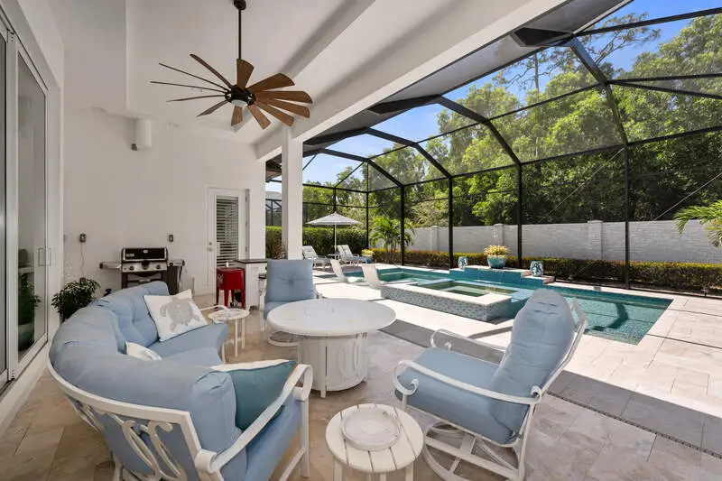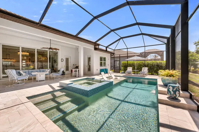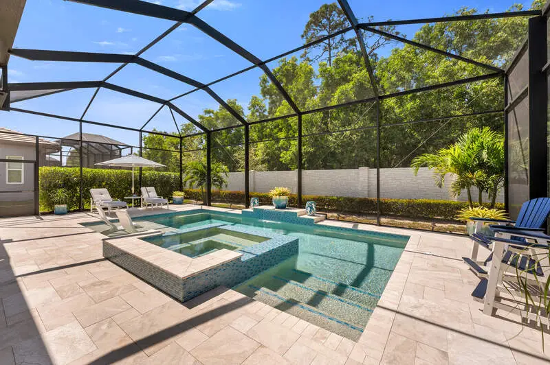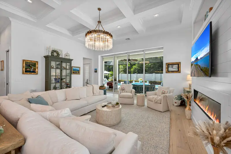 A true masterpiece of coastal contemporary design is found in this Cedar Key Model in the Sapphire Cove gated community. Every inch of this 3 bed plus a den and 3.5 bath residence has been designed with intention, ensuring that the architecture and craftsmanship work in perfect harmony to create an inviting and visually striking home. With soaring 12-foot ceilings and expansive 10-foot sliders, the natural light floods every corner, creating a warm and inviting ambiance. Gorgeous wood flooring flows seamlessly throughout and is accented by elegant coffered ceilings and shiplap wall accents. Wood flooring in Foyer has one of a kind custom design added for unique touch. The upgraded gourmet kitchen is a culinary delight, featuring high-end finishes at every turn, including upgraded white cabinets that beautifully contrast with the sea glass subway tile, while designer glass display shelving offers the perfect showcase for your favorite dishware and decor. Kitchen island is oversized adding a touch of luxury. Current owners added ice-maker in laundry adjacent to kitchen for convenience. All appliances as well as washer and dryer have been upgraded to smart appliances. Hardware and lighting is brushed gold throughout the house. The great room is designed for entertaining, centered around a cozy fireplace and highlighted by a wall of sliders that lead directly to your private oasis. Step outside onto the screened lanai, where you can unwind in the resort-style pool and spa. Retreat to the primary suite and ensuite bath that rivals any spa, featuring a freestanding soaking tub and a massive walk-in shower. The interplay of color and texture, accented by the elegance of the brushed gold hardware and lighting, creates a harmonious environment that is both visually stunning and calming. All doors in home are solid core. Current owners added custom plantation shutters through entire home. Upgraded marble tiles have been added to lanaii/pool area. Even the garage has been upgraded with a five foot extension for storage and brand new Epoxy floors. Amenities include a pool, club room, kitchen, and a fitness center. Don't miss your opportunity to own this exceptional home that combines visual appeal with remarkable craftsmanship.