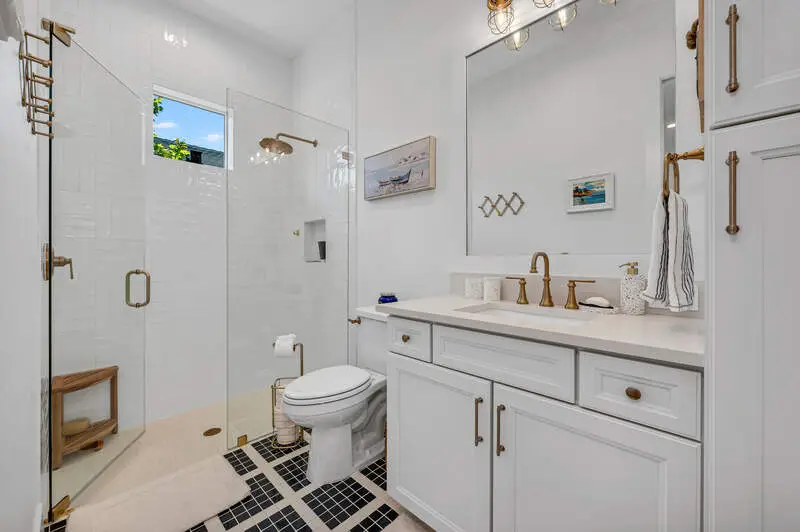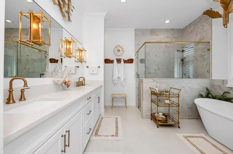 Brushed gold hardware and lighting