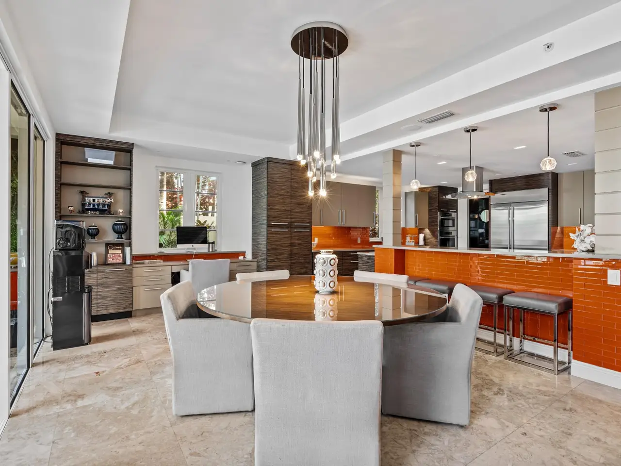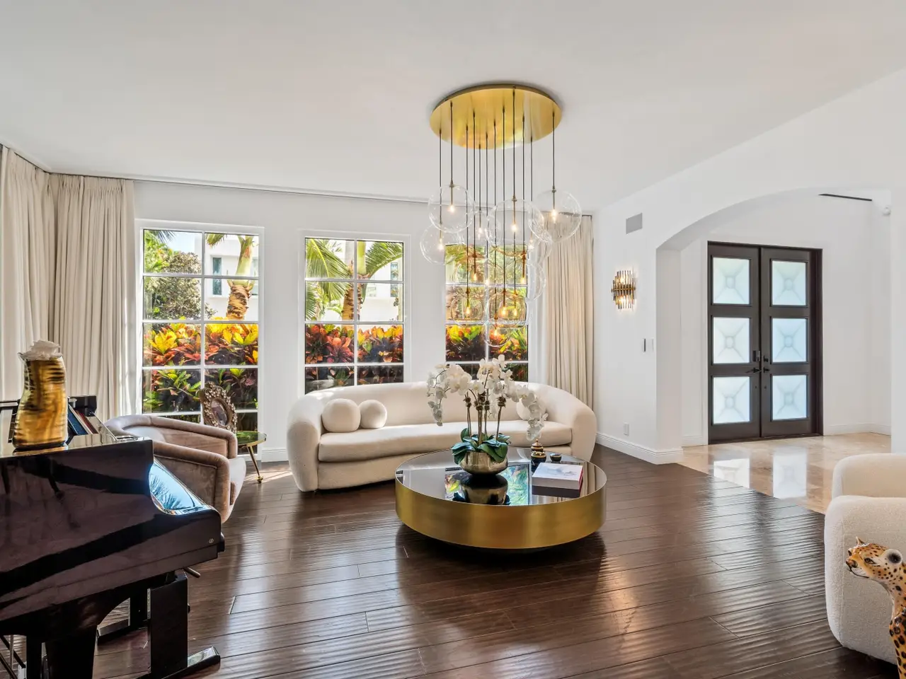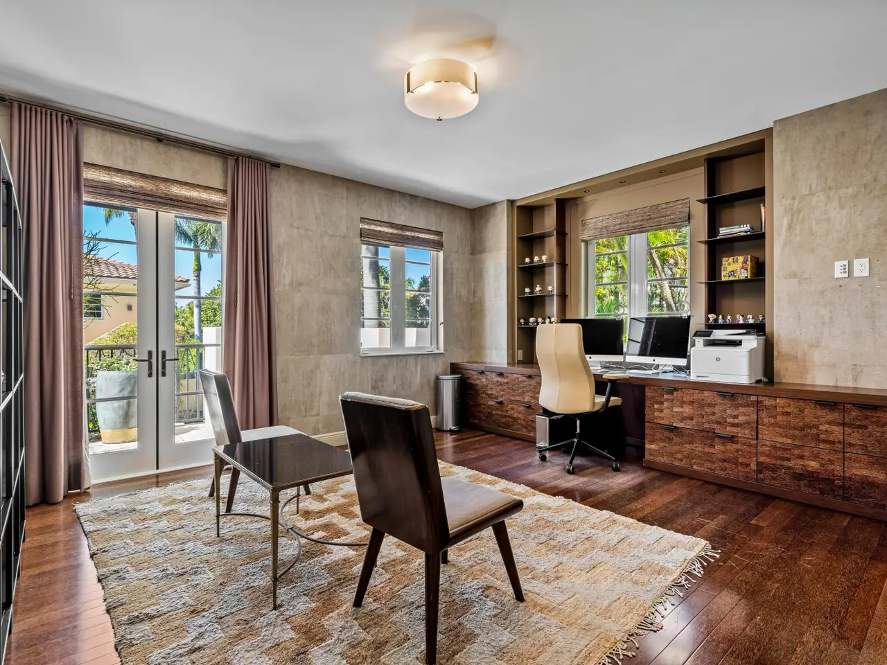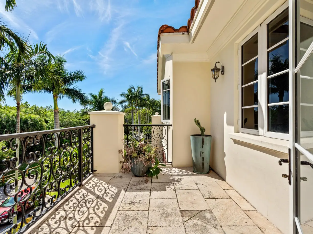 Palm Trail, Delray Beach, Florida. On tree-lined Palm Trail, across from the Intracoastal Waterway's shore, this is one of just six courtyard townhomes in an exclusive enclave offering resort-style living close to the beach, minutes from famous Atlantic Avenue's bistros and boutiques. Going beyond every expectation, this luxury townhome is an exquisite showplace by Leighton Design Group. Casual elegance is expressed with sophisticated modern ease in select finishes and bespoke elements that come together in a calm neutral palette with a textural look and touches of subtle glamour. Creating an estate-like environment in the Mediterranean-inspired architectural design, this light-filled end-position townhome opens to loggias around the private, tropically landscaped courtyard.