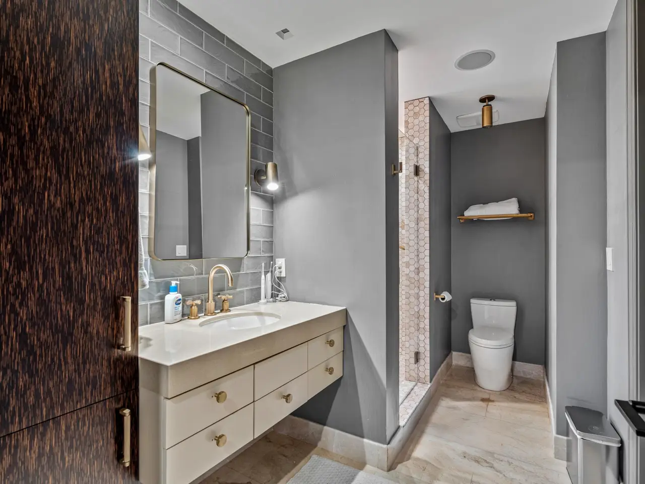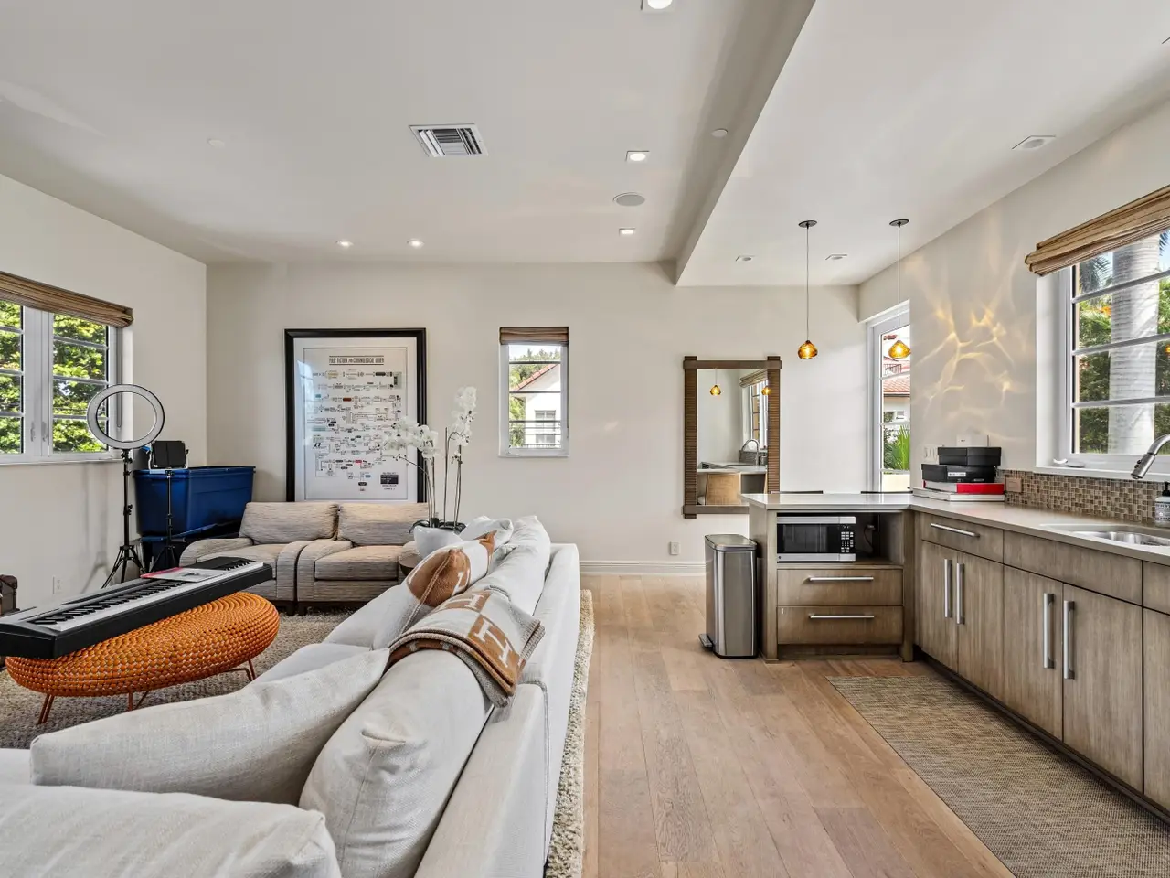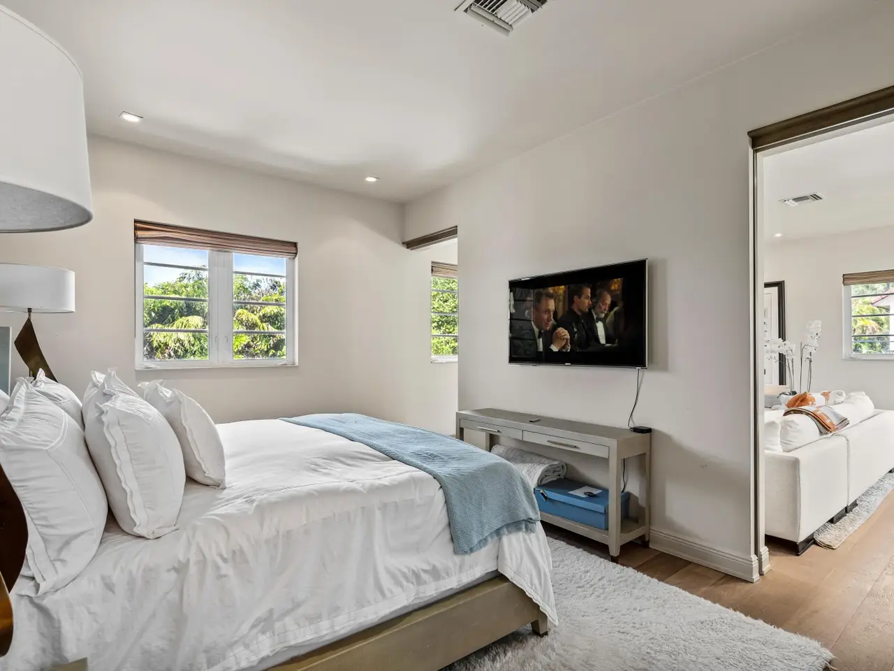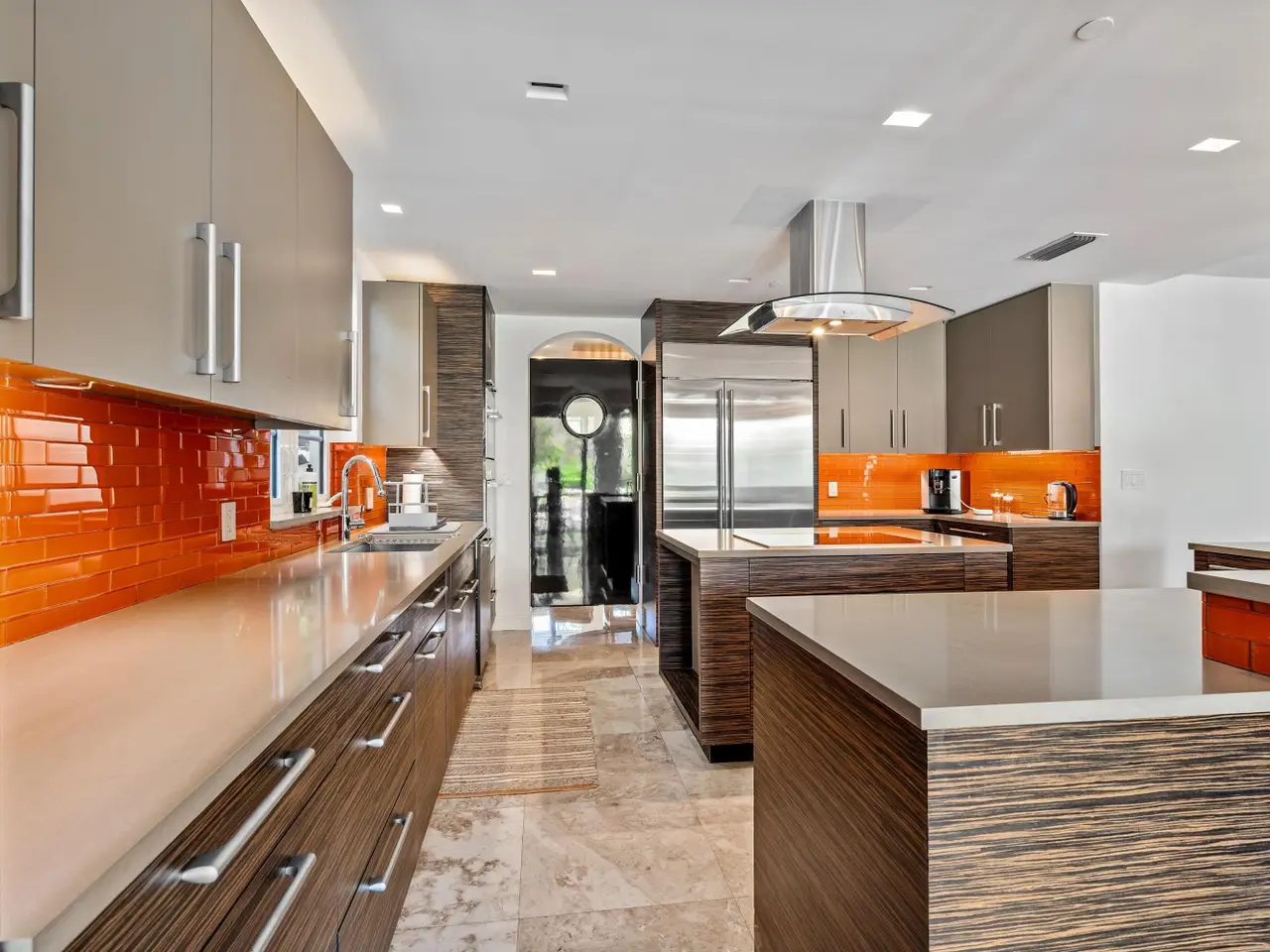 Palm Trail, Delray Beach, Florida. On tree-lined Palm Trail, across from the Intracoastal Waterway's shore, this is one of just six courtyard townhomes in an exclusive enclave offering resort-style living close to the beach, minutes from famous Atlantic Avenue's bistros and boutiques. Going beyond every expectation, this luxury townhome is an exquisite showplace by Leighton Design Group. Casual elegance is expressed with sophisticated modern ease in select finishes and bespoke elements that come together in a calm neutral palette with a textural look and touches of subtle glamour. Creating an estate-like environment in the Mediterranean-inspired architectural design, this light-filled end-position townhome opens to loggias around the private, tropically landscaped courtyard.