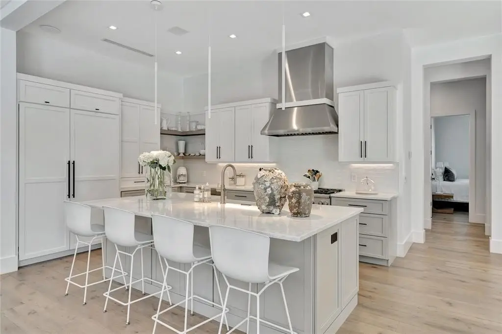 This residence embodies style, comfort, and location — a rare opportunity to enjoy modern farmhouse living just steps from Delray’s vibrant Atlantic Avenue and beautiful public beaches. Built in 2020 and fully upgraded, this single-story home features 4 bedrooms, 4.5 baths, and over 3,600 SF under air. Vaulted ceilings and wide-plank hardwood floors create an inviting, sophisticated atmosphere, while custom high-end finishes elevate every room. In Fall 2024, the outdoor spaces were professionally redesigned to seamlessly extend the home’s elegant interiors. Relax in the heated saltwater pool with sun shelf and waterfall spa, rinse off in the outdoor shower, and entertain with ease in the large screened loggia complete with a full summer kitchen.